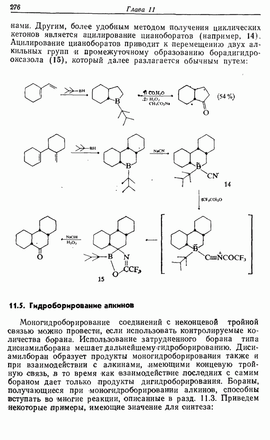 тексилборациклоалканами. Другим, более удобным методом получения циклических кетонов является ацилирование цианоборатов (например, 14). Ацилирование цианоборатов приводит к перемещению двух алкильных групп и промежуточному образованию борадигидро-оксазола (15), который далее разлагается обычным путем: