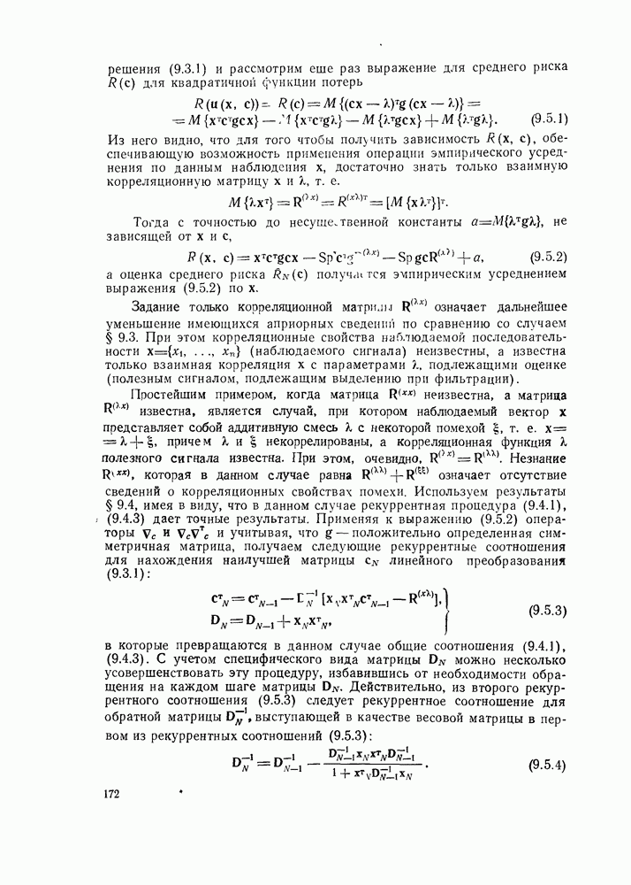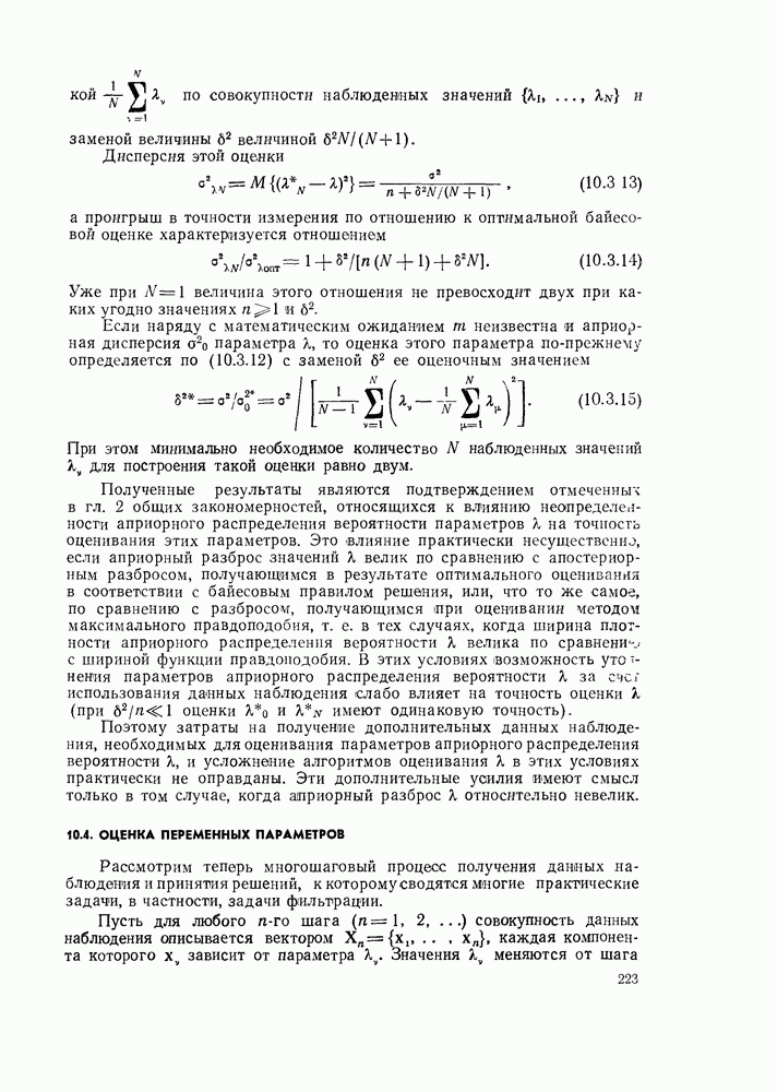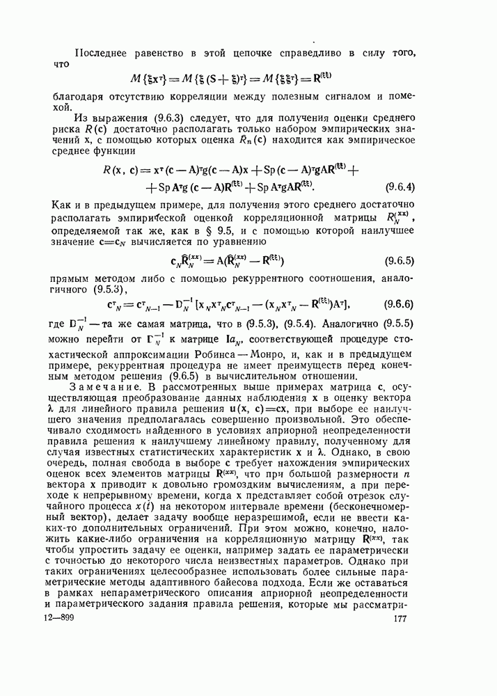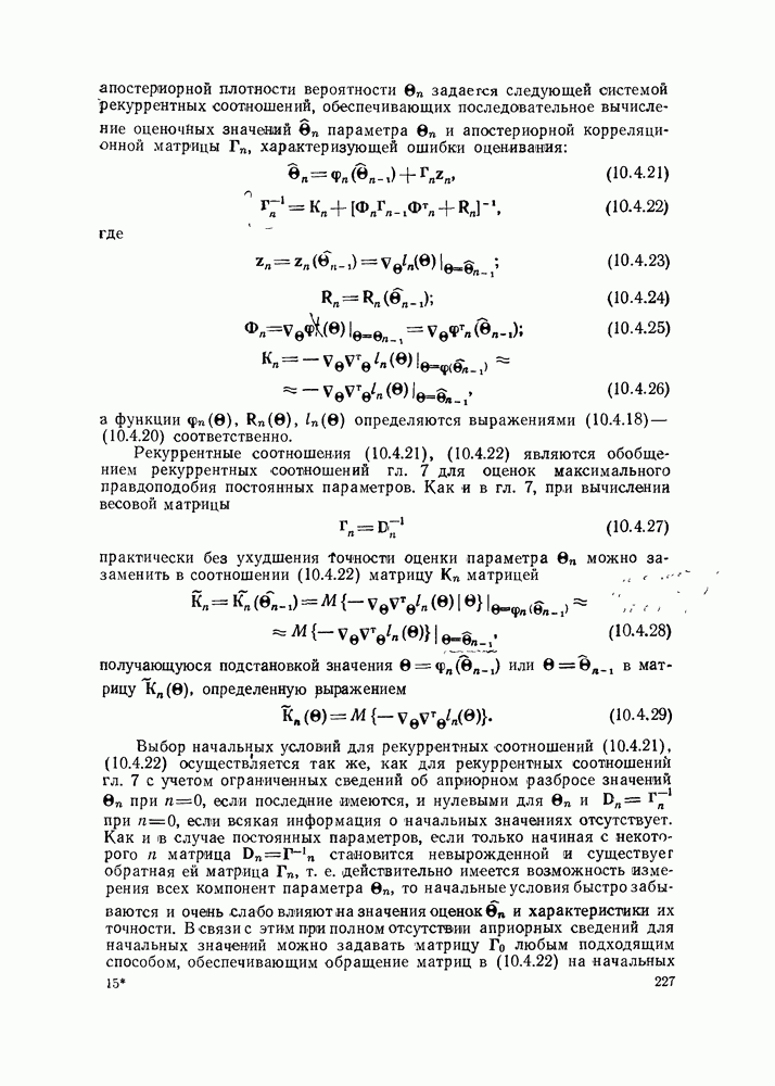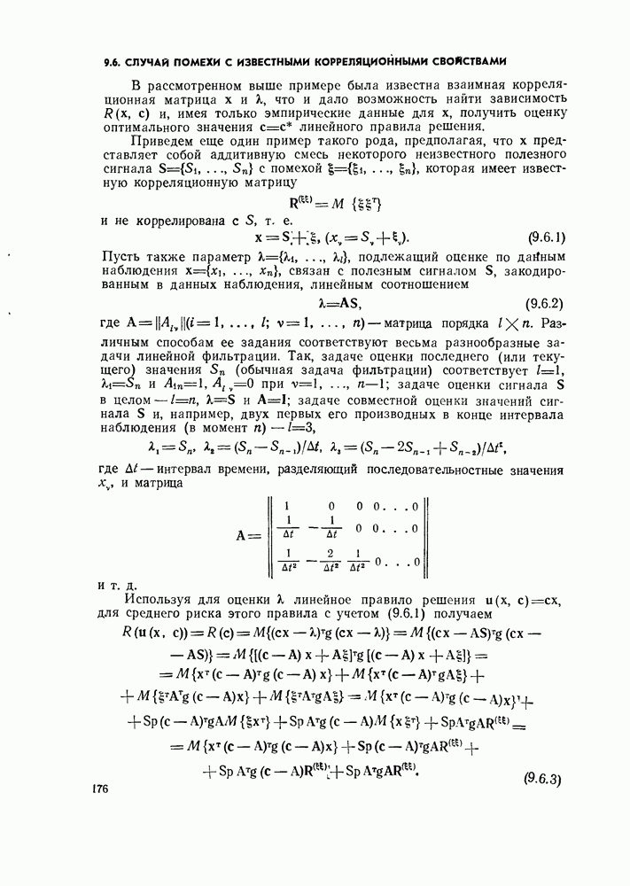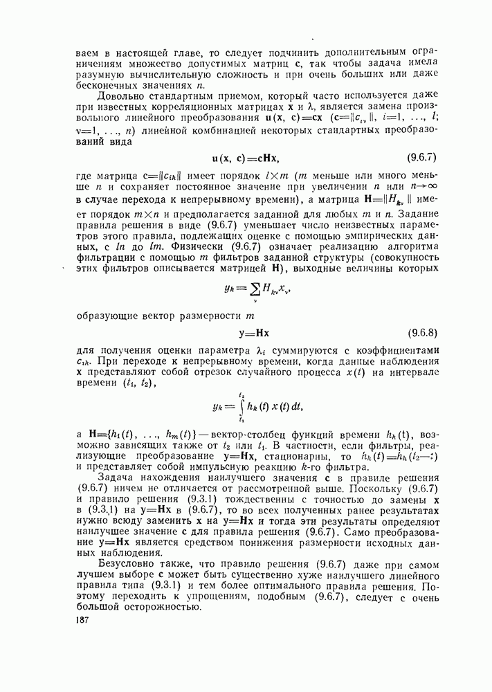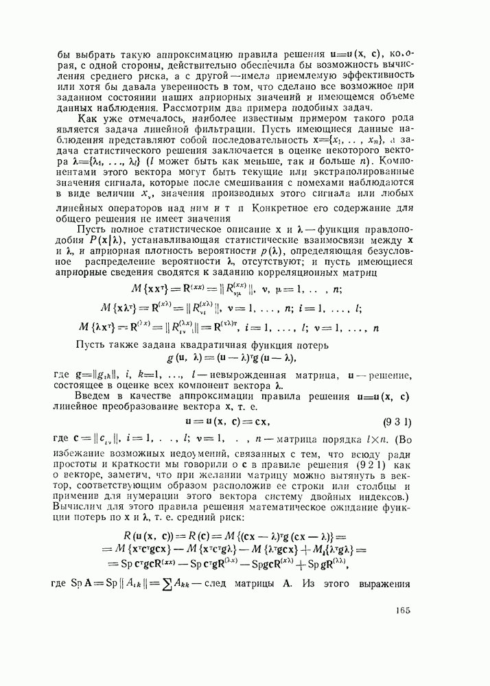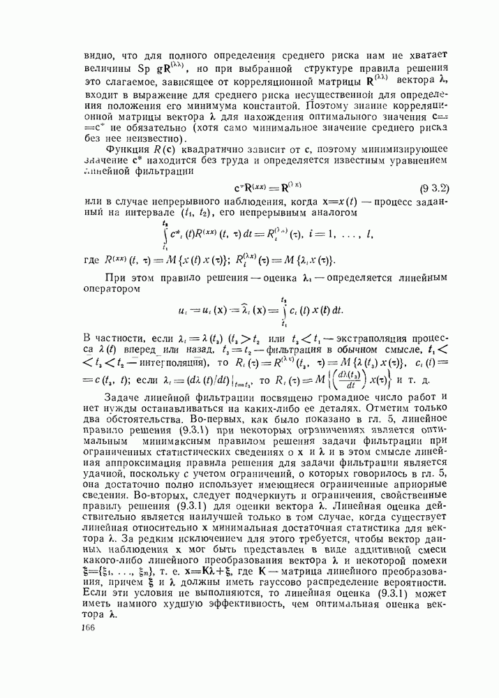 и к и в этом смысле линейная аппроксимация правила решения для задачи фильтрации является удачной, поскольку с учетом ограничений, о которых говорилось в гл. 5, она достаточно полно использует имеющиеся ограниченные априорные сведения. Во-вторых, следует подчеркнуть и ограничения, свойственные правилу решения (9.3.1) для оценки вектора k. Линейная оценка действительно является наилучшей только в том случае, когда существует линейная относительно