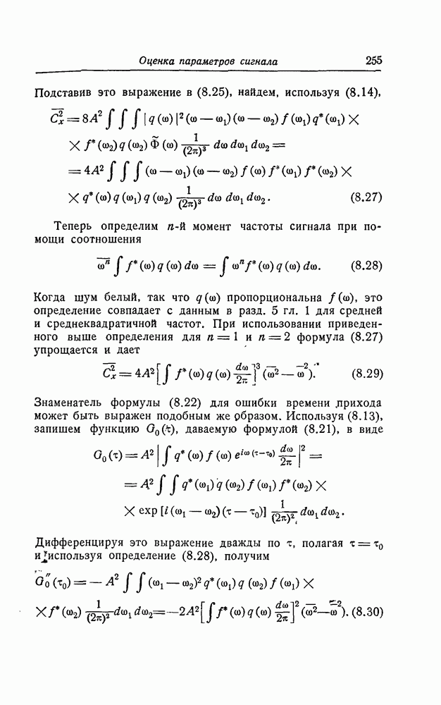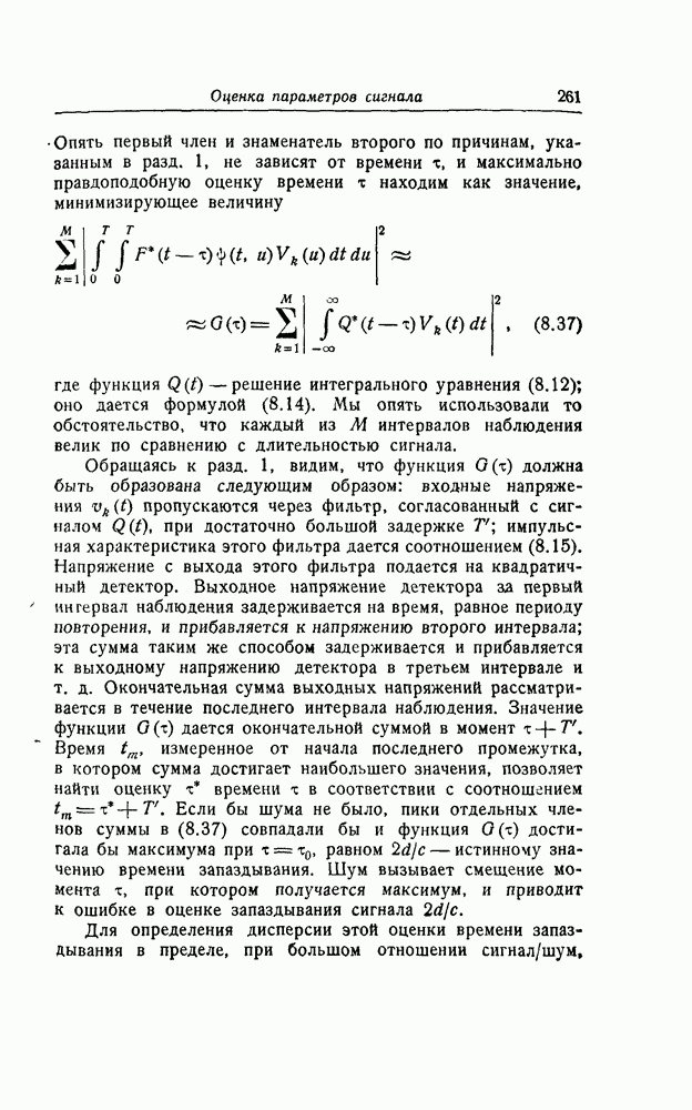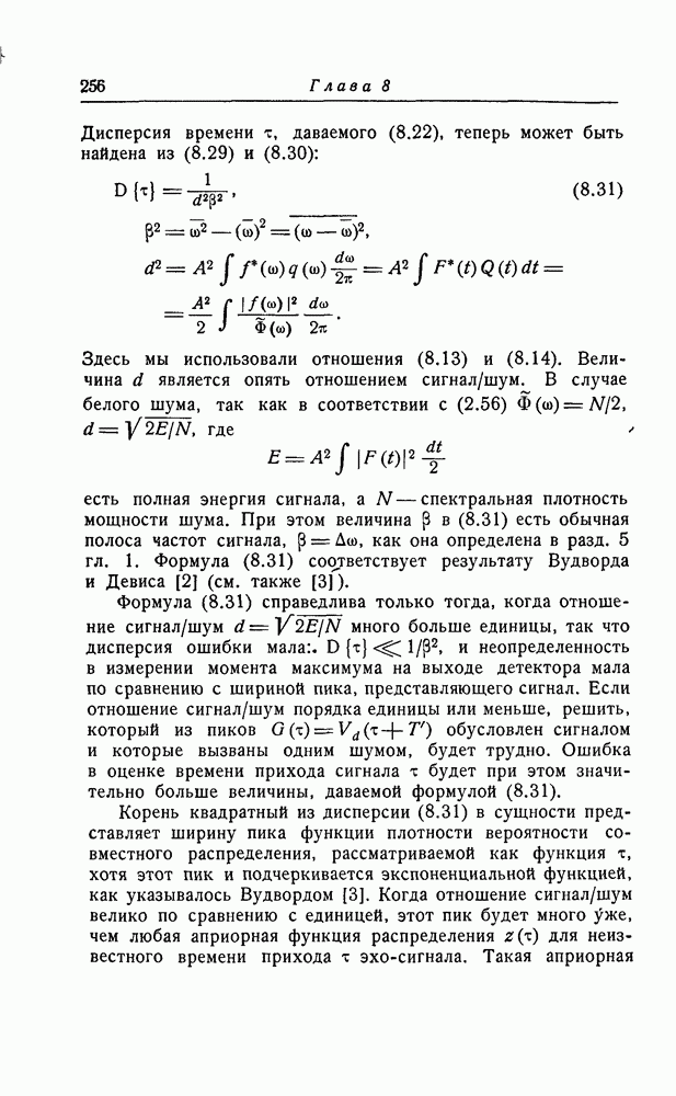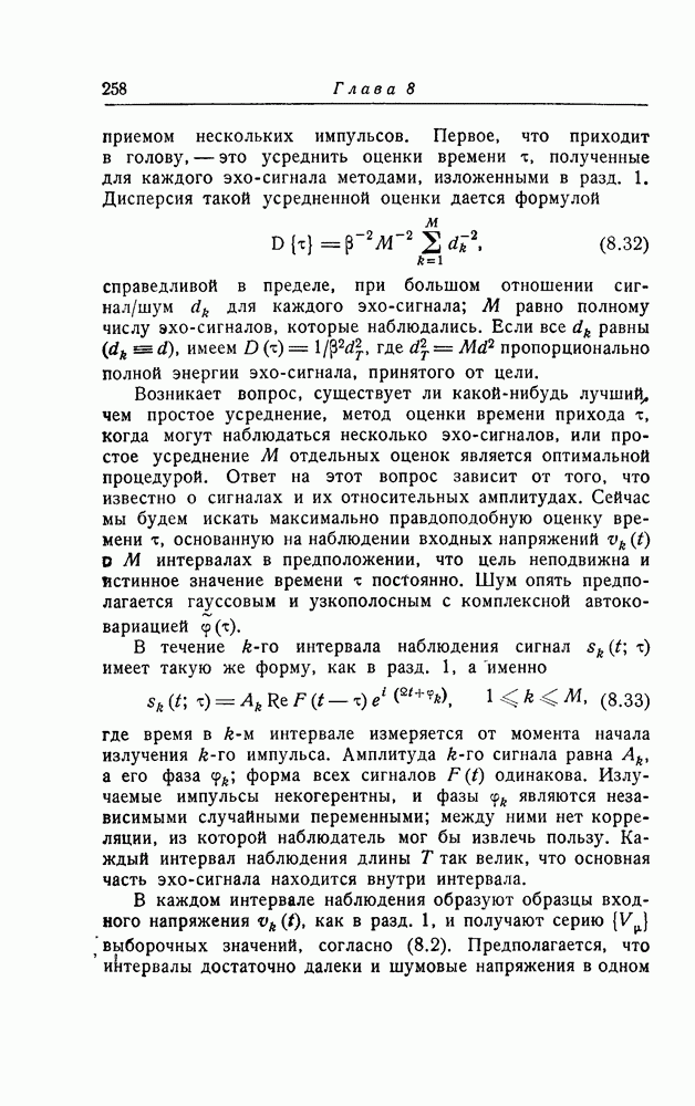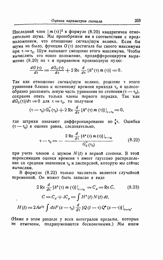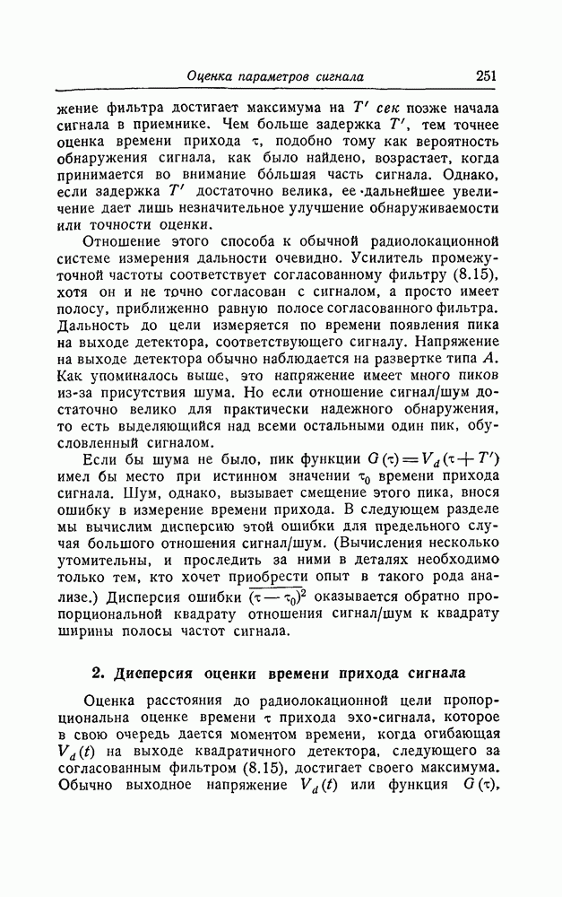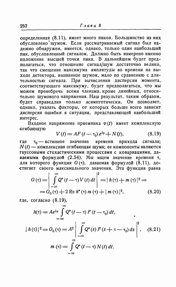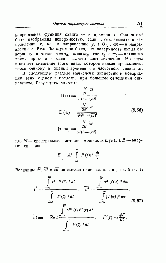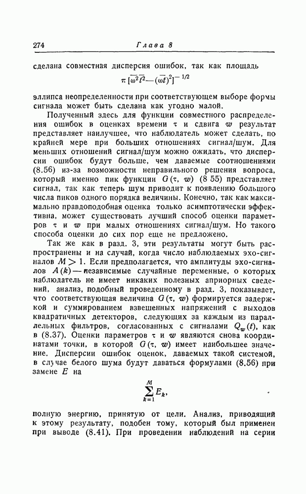 результат представляет наилучшее, что наблюдатель может сделать, по крайней мере при больших отношениях сигнал/шум. Для меньших отношений сигнал/шум можно ожидать, что дисперсии ошибок будут больше, чем даваемые соотношениями (8.56) из-за возможности неправильного решения вопроса, который именно пик функции