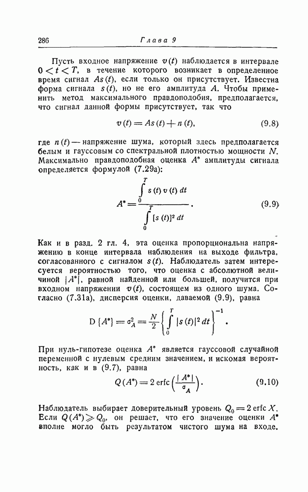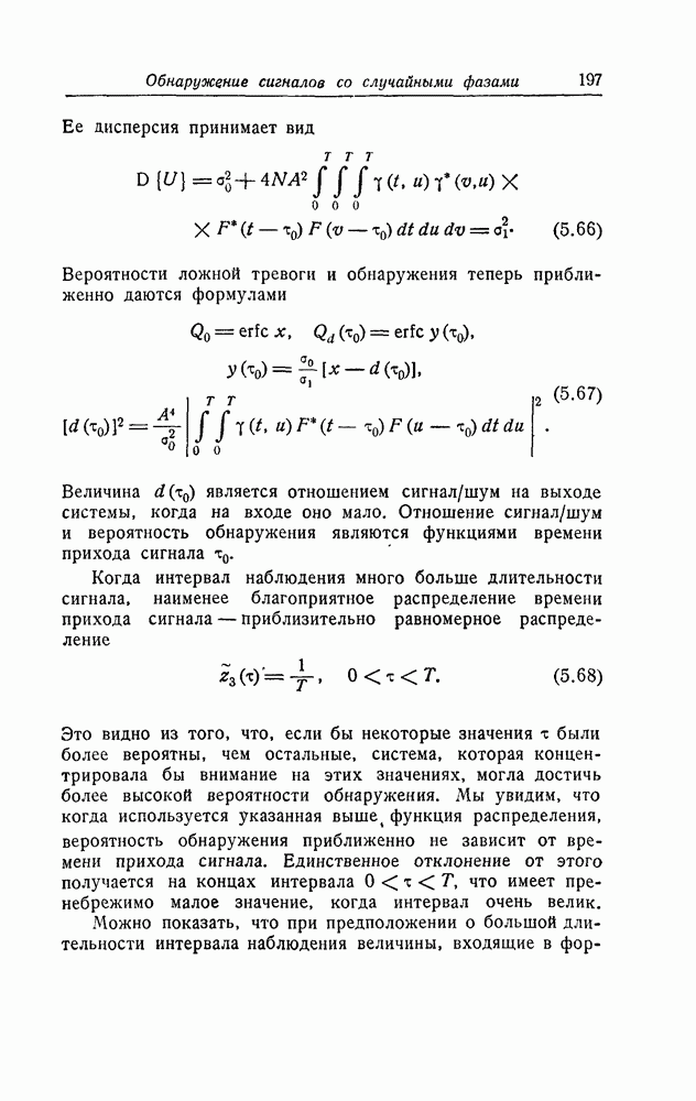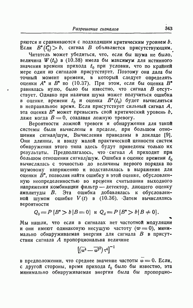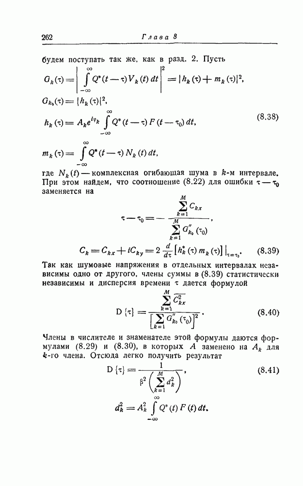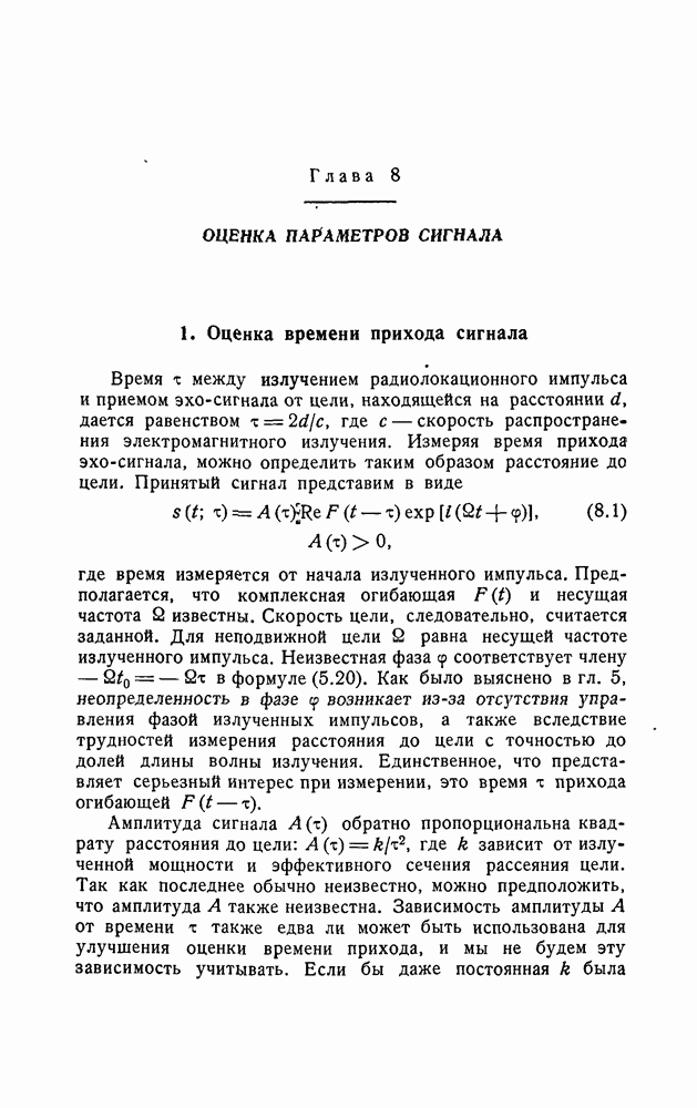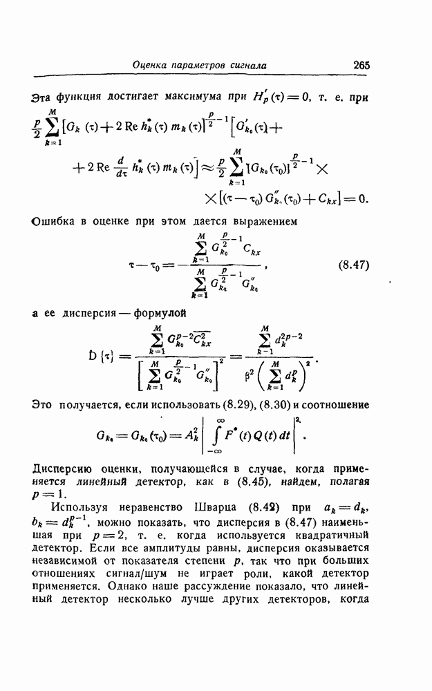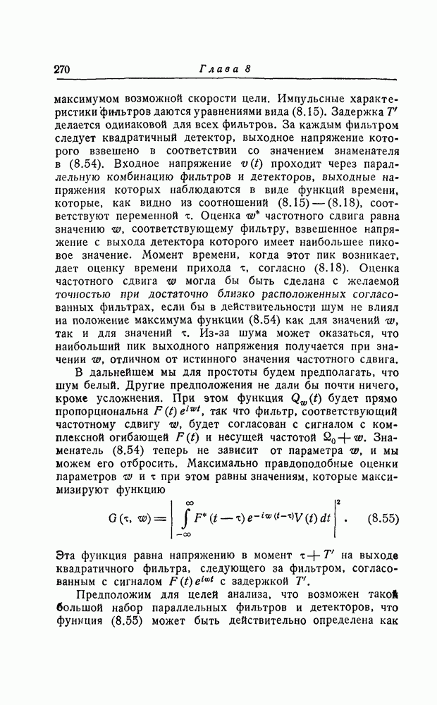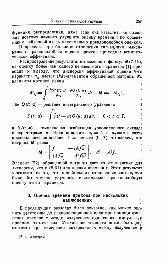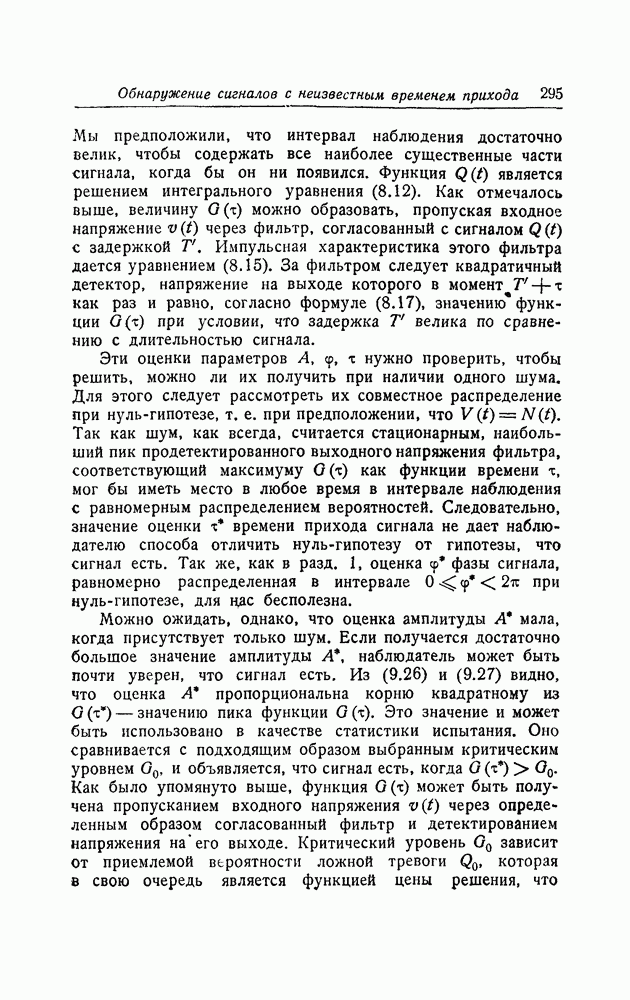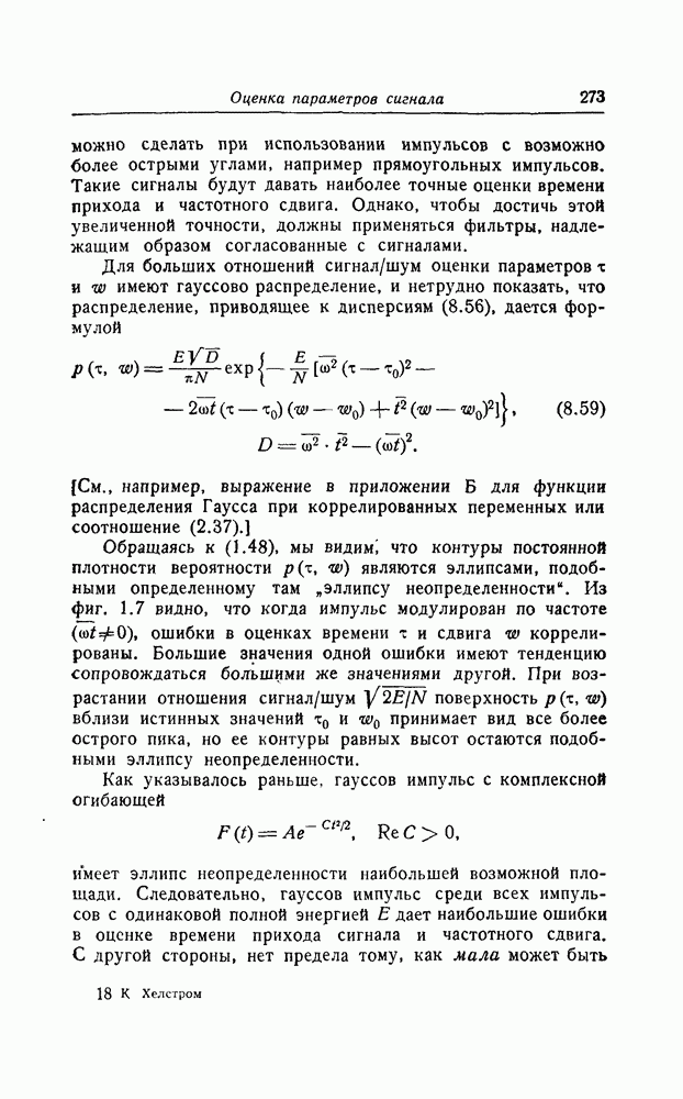 результат представляет наилучшее, что наблюдатель может сделать, по крайней мере при больших отношениях сигнал/шум. Для меньших отношений сигнал/шум можно ожидать, что дисперсии ошибок будут больше, чем даваемые соотношениями (8.56) из-за возможности неправильного решения вопроса, который именно пик функции