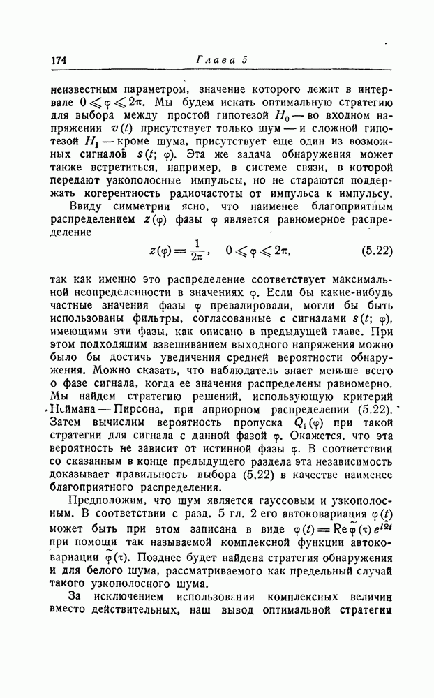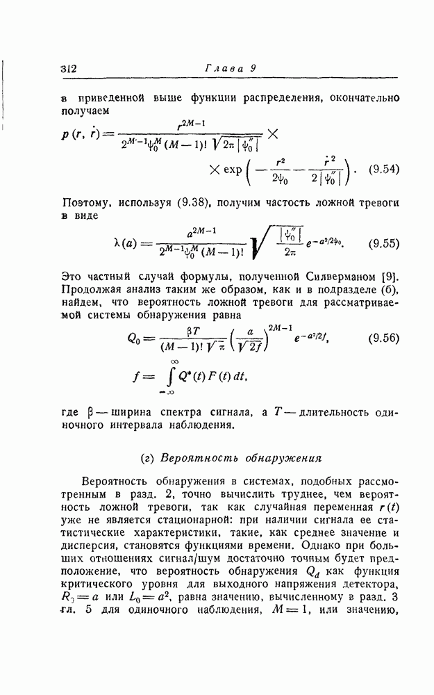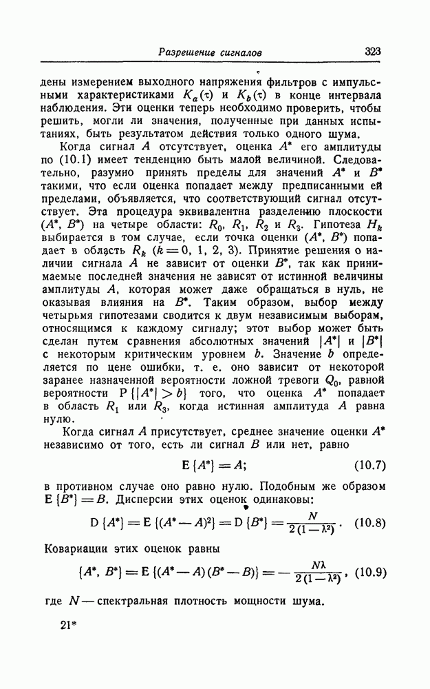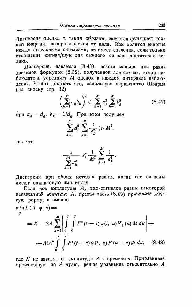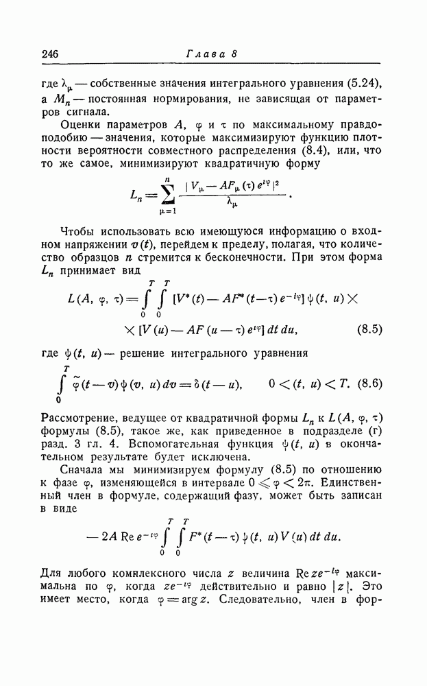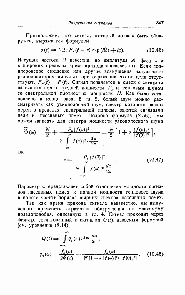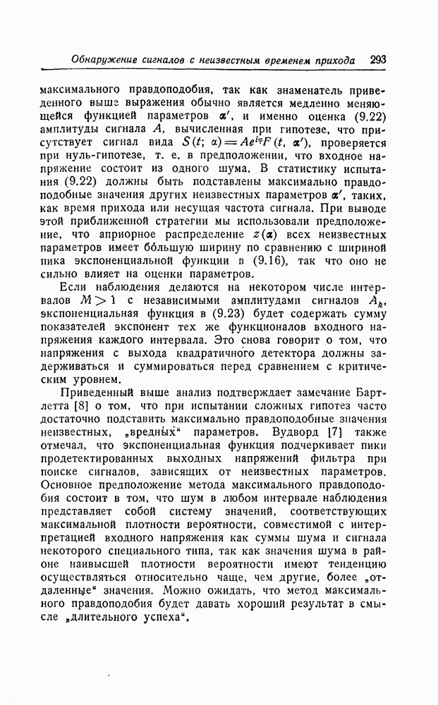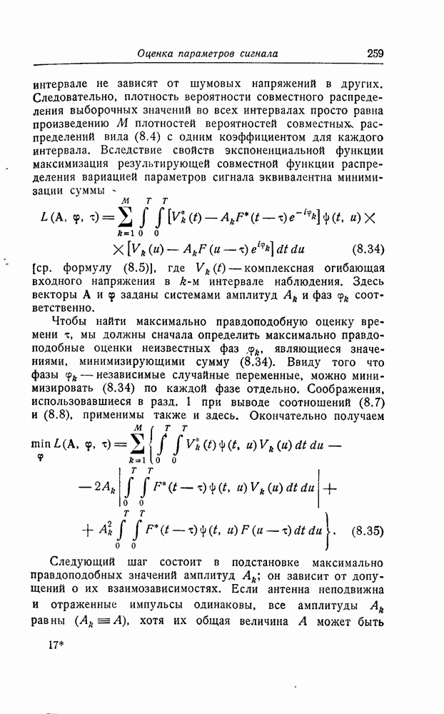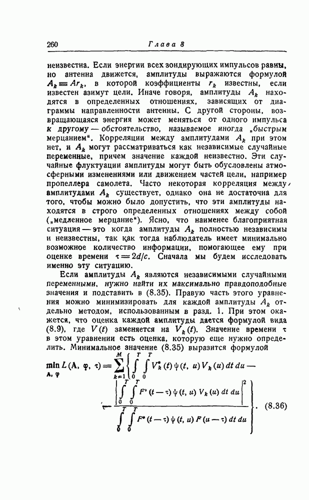результат представляет наилучшее, что наблюдатель может сделать, по крайней мере при больших отношениях сигнал/шум. Для меньших отношений сигнал/шум можно ожидать, что дисперсии ошибок будут больше, чем даваемые соотношениями (8.56) из-за возможности неправильного решения вопроса, который именно пик функции
