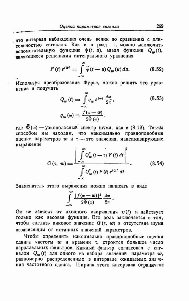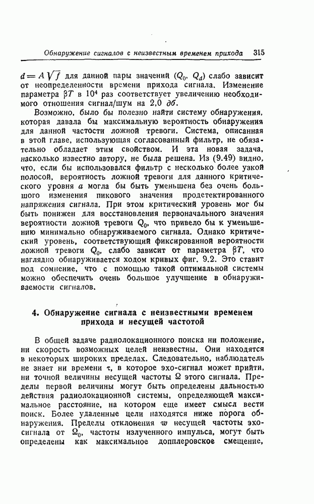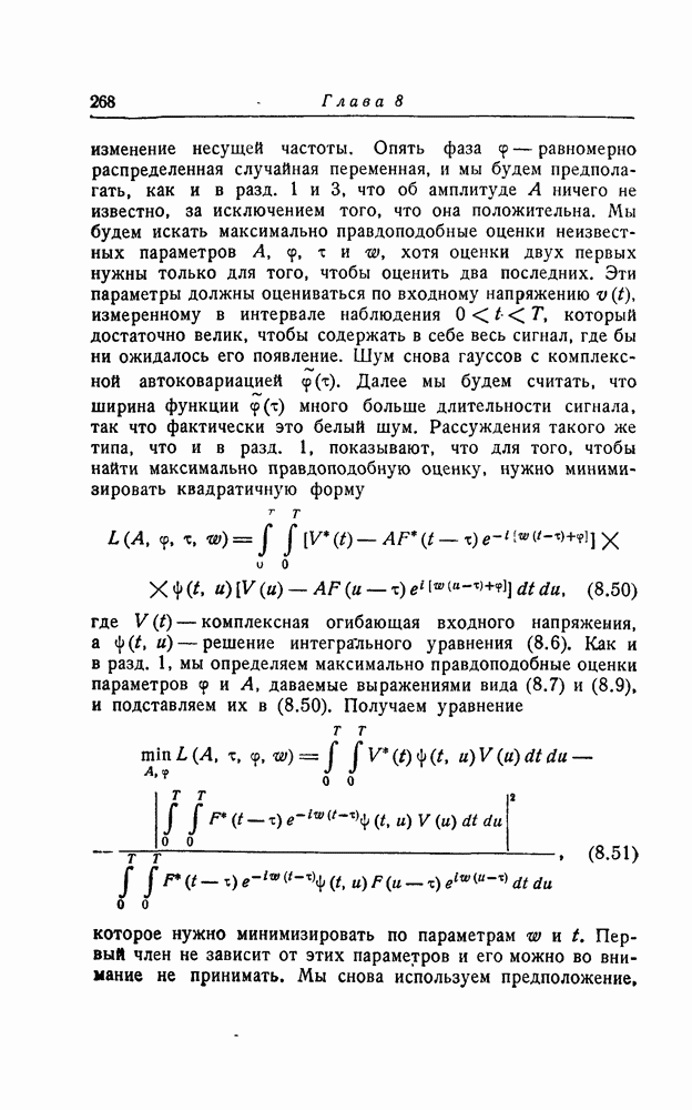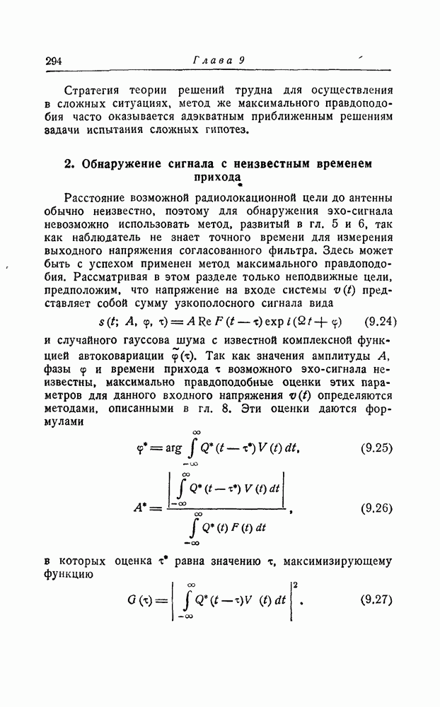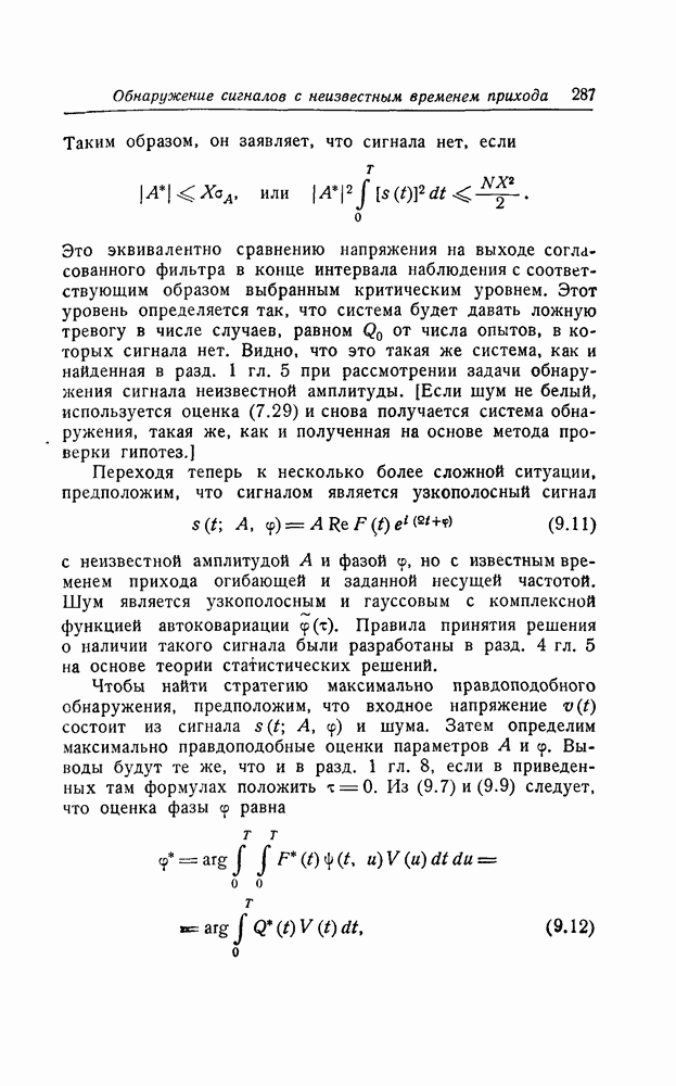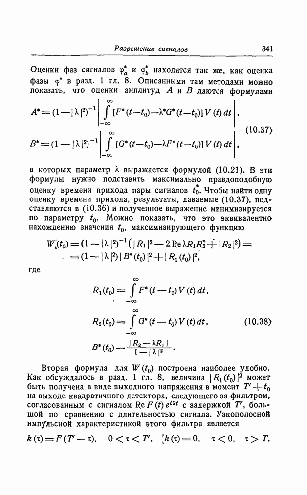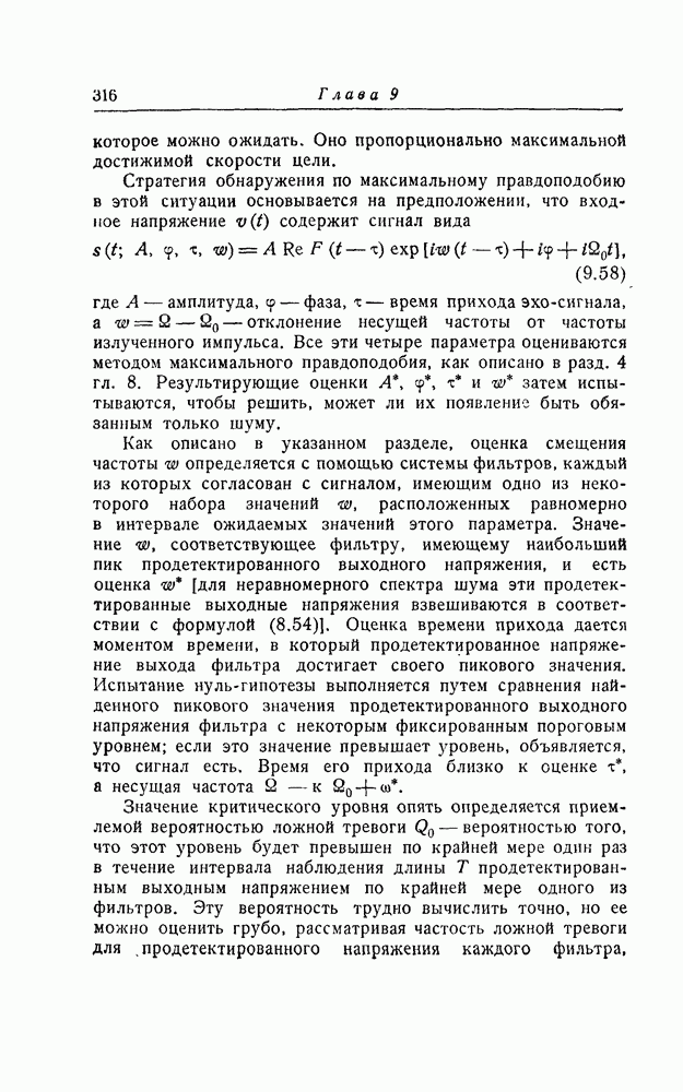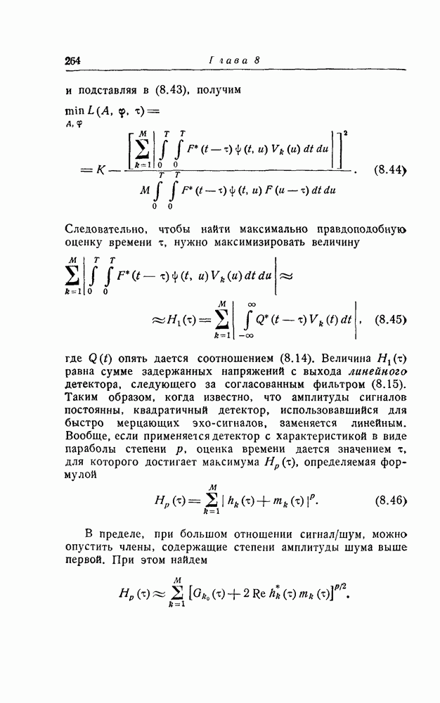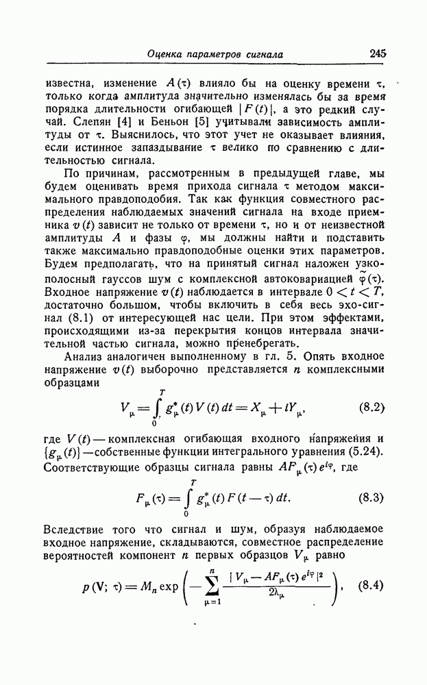 соответствующему фильтру, взвешенное напряжение с выхода детектора которого имеет наибольшее пиковое значение. Момент времени, когда этот пик возникает, дает оценку времени прихода х, согласно (8.18). Оценка частотного сдвига