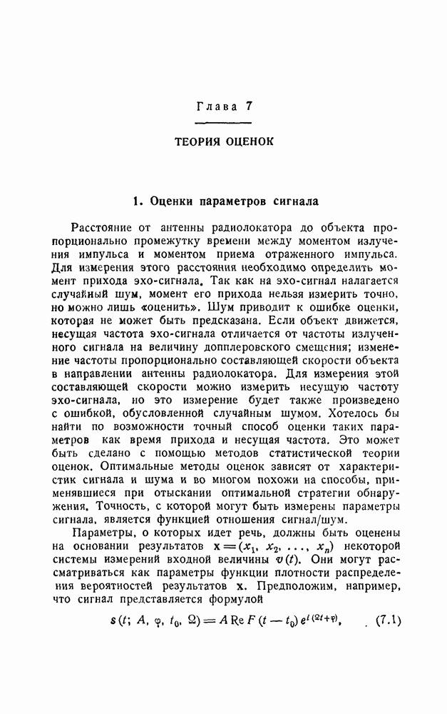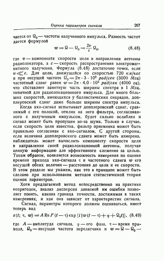 его несущей обеих величин — расстояния до цели и ее скорости. В этом разделе мы укажем, как это в принципе может быть сделано при использовании методов статистической теории оценок параметров.