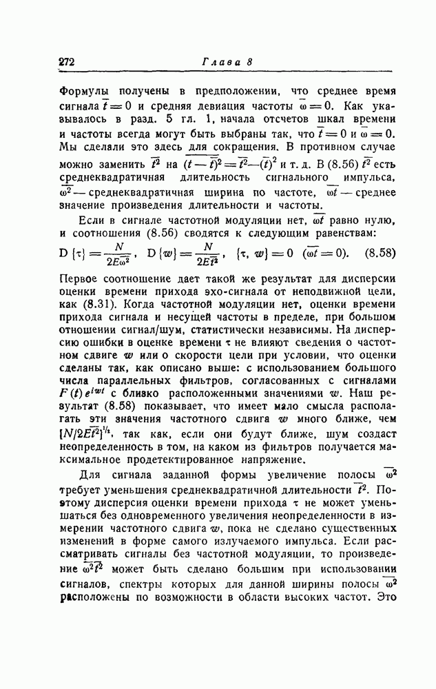 Первое соотношение дает такой же результат для дисперсии оценки времени прихода эхо-сигнала от неподвижной цели, как (8.31). Когда частотной модуляции нет, оценки времени прихода сигнала и несущей частоты в пределе, при большом отношении сигнал/шум, статистически независимы. На дисперсию ошибки в оценке времени