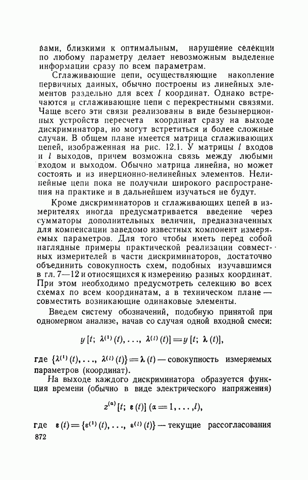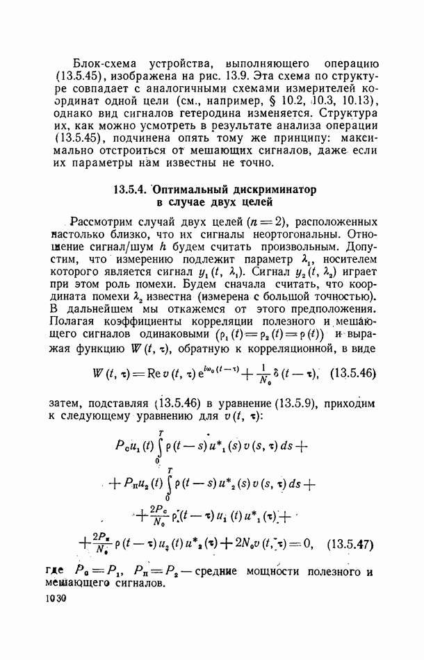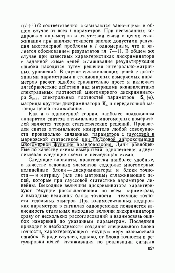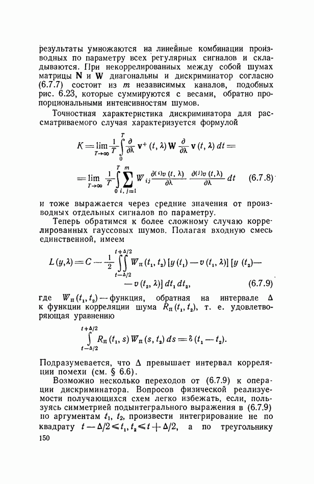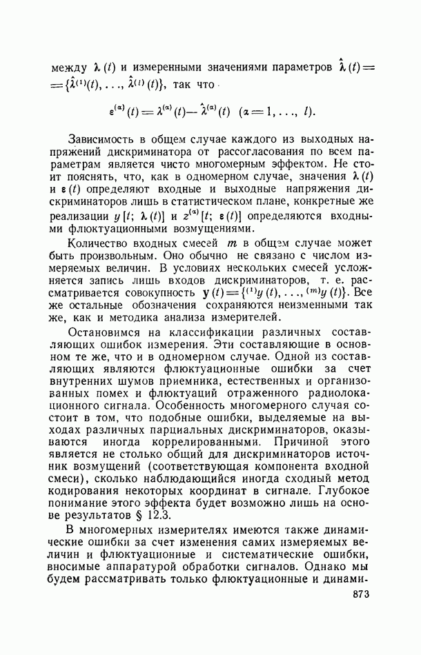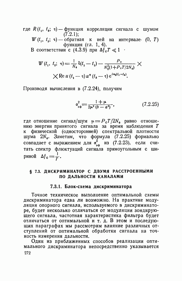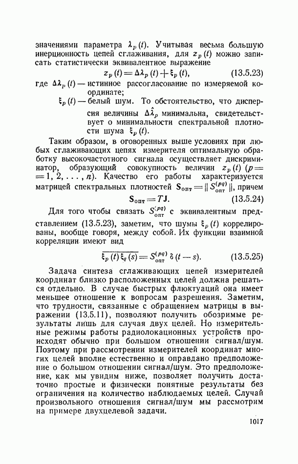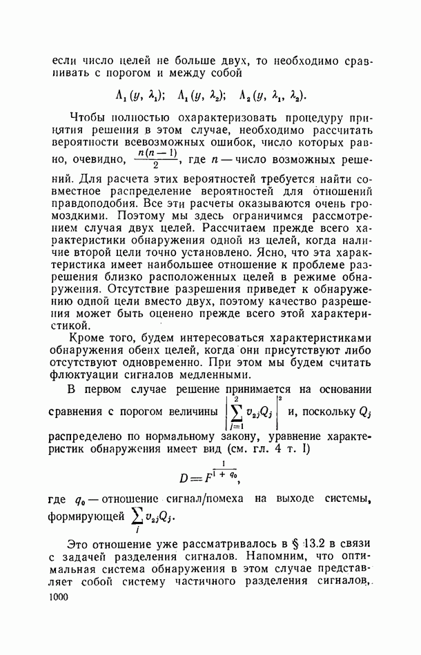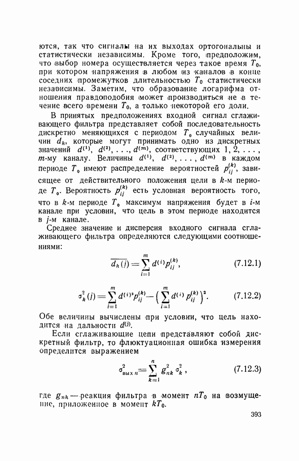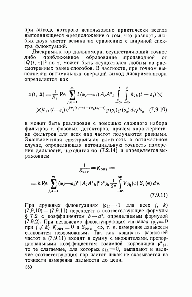В случае быстрых флюктуаций сигналов сглаживающие цепи имеют меньшее отношение к вопросам разрешения. Вместе с тем их синтез при наличии многих целей и многих случайно изменяющихся во времени параметров, подлежащих измерению, представляет собой весьма сложную задачу. Этой задачи в настоящей книге мы касаться не будем — ограничимся лишь синтезом устройства, в котором сосредоточена собственно радиотехническая часть системы. Не делая различий между следящим и неследящим вариантами системы, назовем это устройство дискриминатором. Общие свойства оптимальных дискриминаторов, соответствующих многоцелевым задачам, будут сформулированы ниже.