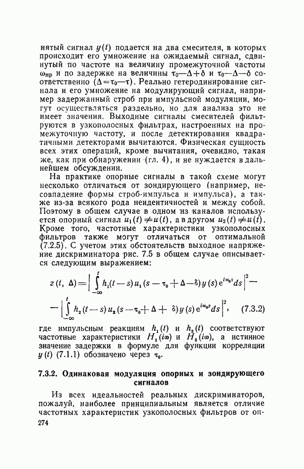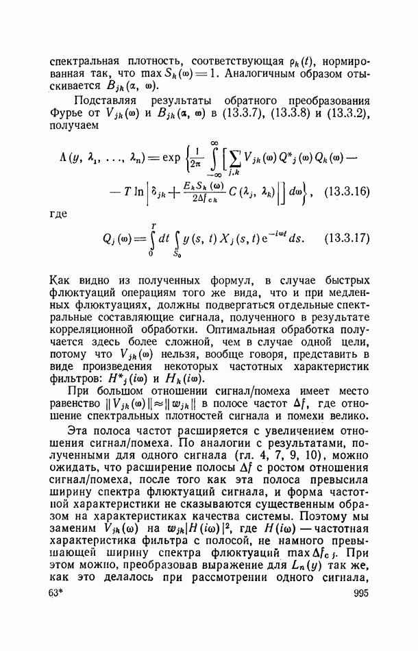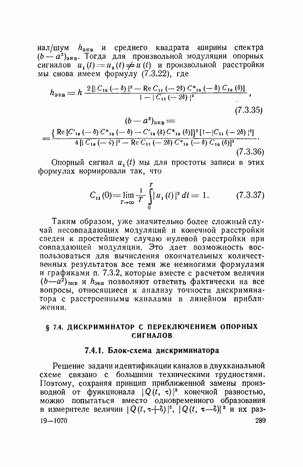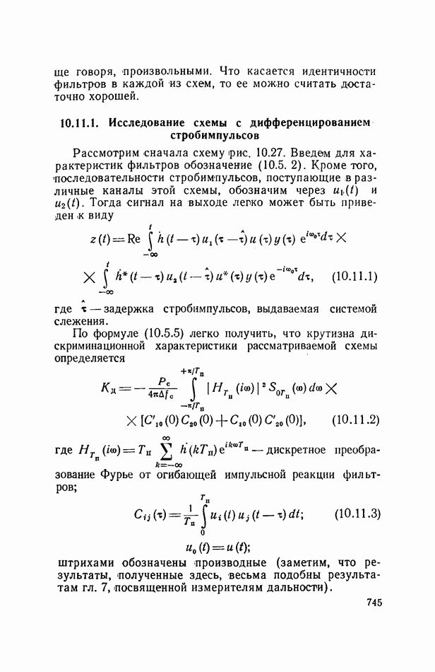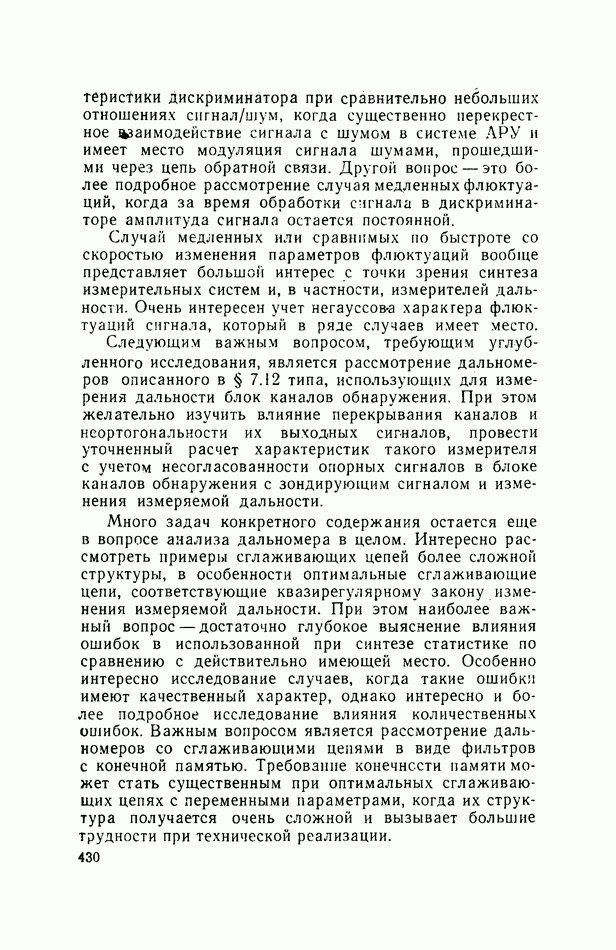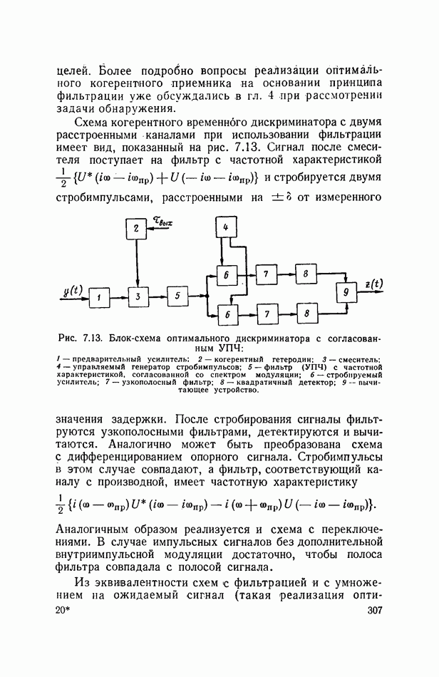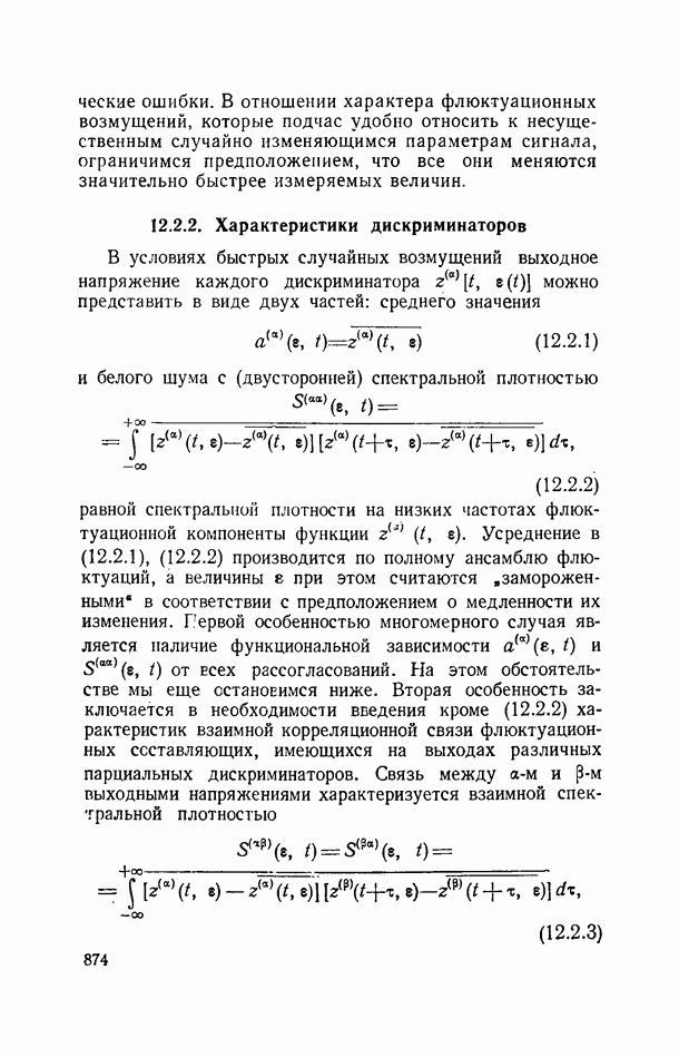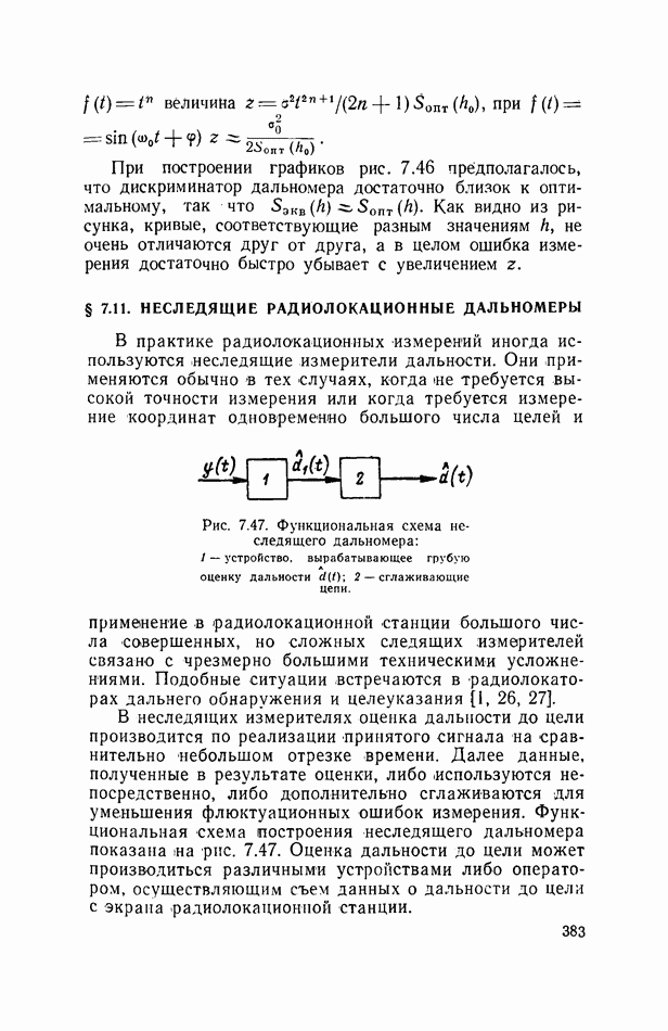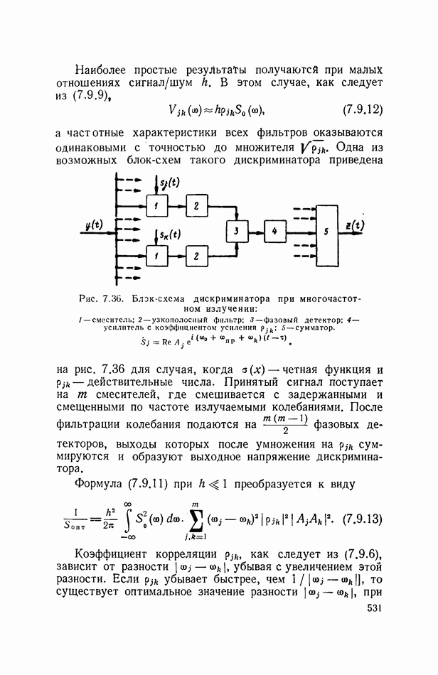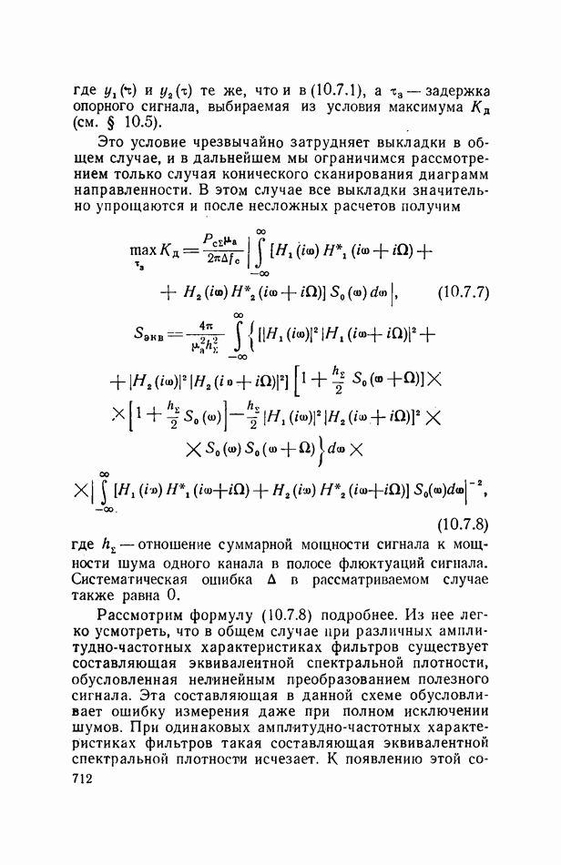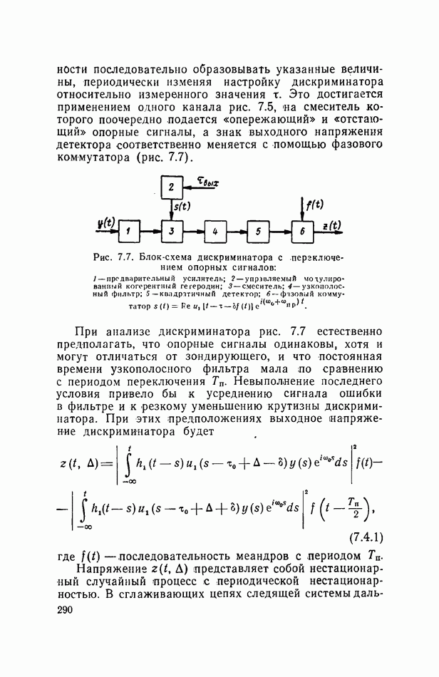 В случае быстрых флюктуаций сигналов сглаживающие цепи имеют меньшее отношение к вопросам разрешения. Вместе с тем их синтез при наличии многих целей и многих случайно изменяющихся во времени параметров, подлежащих измерению, представляет собой весьма сложную задачу. Этой задачи в настоящей книге мы касаться не будем — ограничимся лишь синтезом устройства, в котором сосредоточена собственно радиотехническая часть системы. Не делая различий между следящим и неследящим вариантами системы, назовем это устройство дискриминатором. Общие свойства оптимальных дискриминаторов, соответствующих многоцелевым задачам, будут сформулированы ниже.