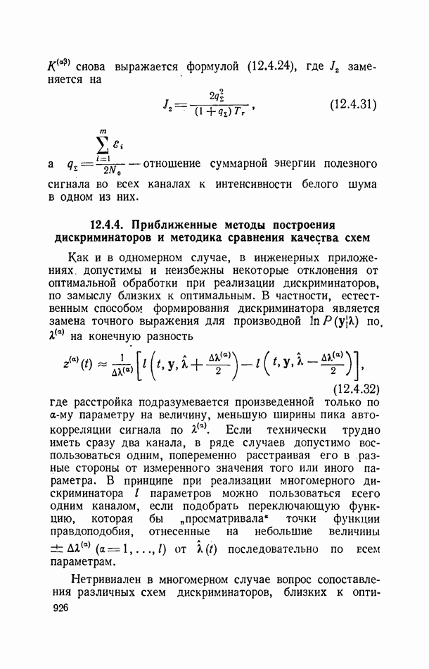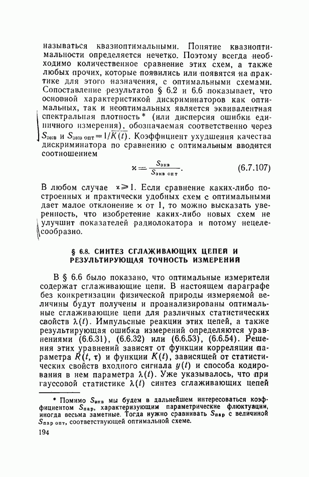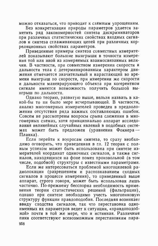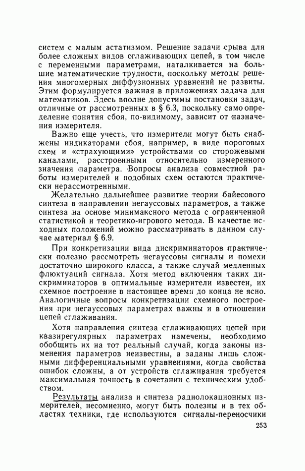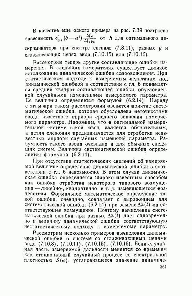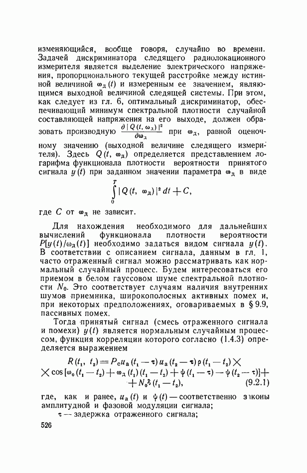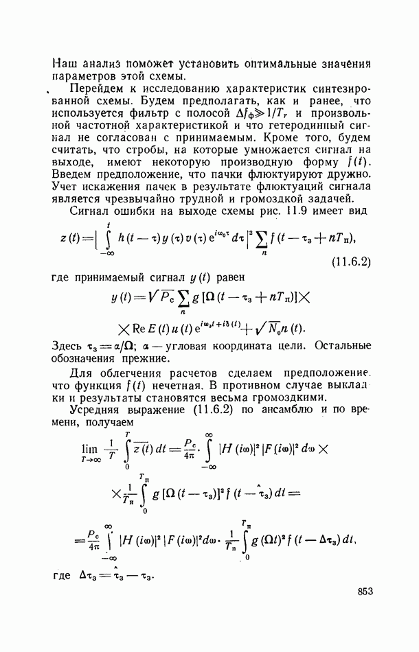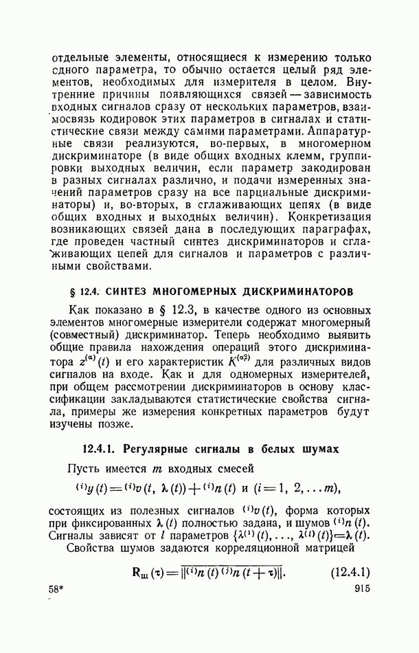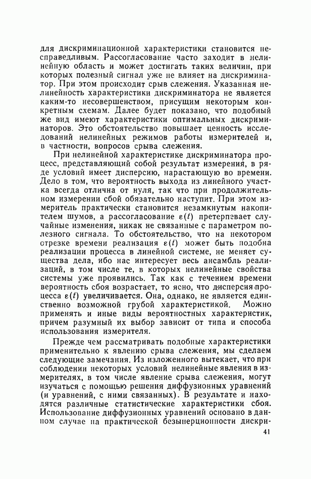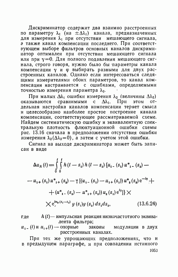 В случае быстрых флюктуаций сигналов сглаживающие цепи имеют меньшее отношение к вопросам разрешения. Вместе с тем их синтез при наличии многих целей и многих случайно изменяющихся во времени параметров, подлежащих измерению, представляет собой весьма сложную задачу. Этой задачи в настоящей книге мы касаться не будем — ограничимся лишь синтезом устройства, в котором сосредоточена собственно радиотехническая часть системы. Не делая различий между следящим и неследящим вариантами системы, назовем это устройство дискриминатором. Общие свойства оптимальных дискриминаторов, соответствующих многоцелевым задачам, будут сформулированы ниже.