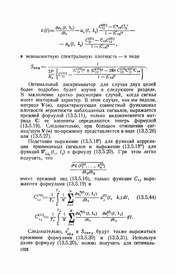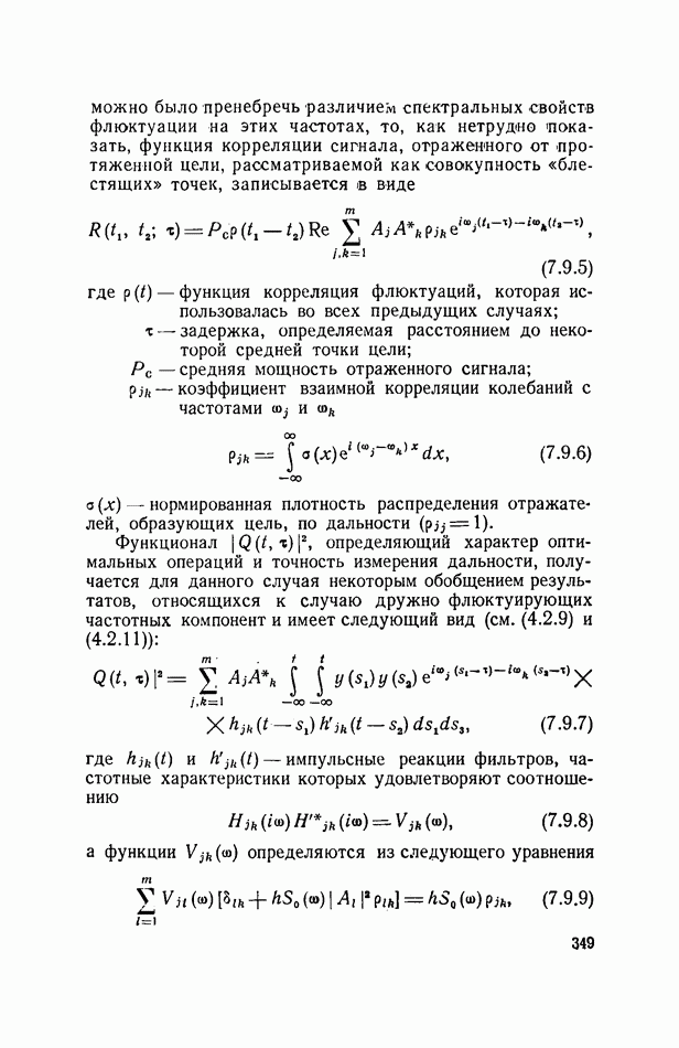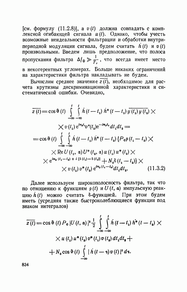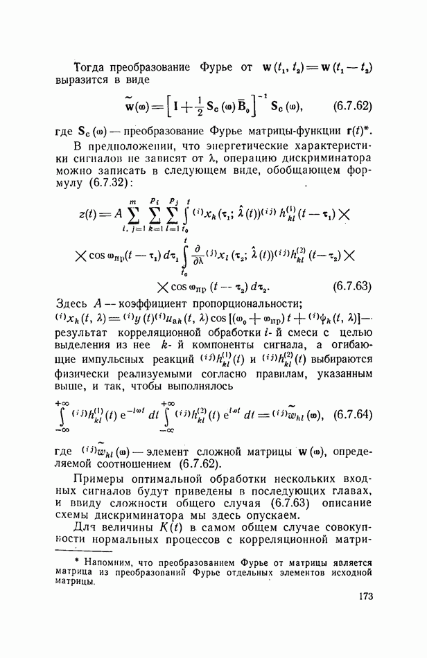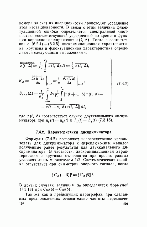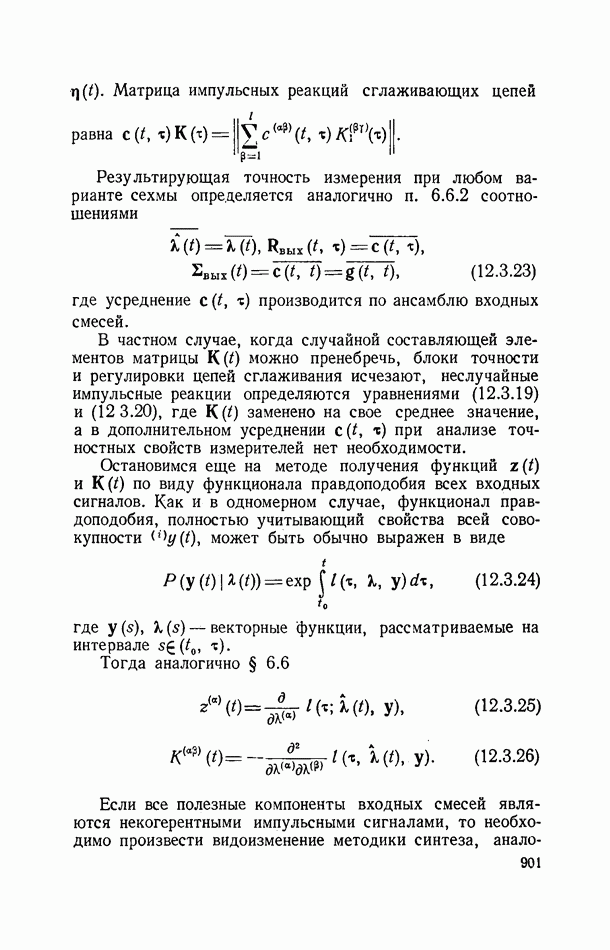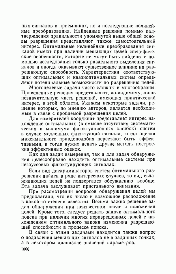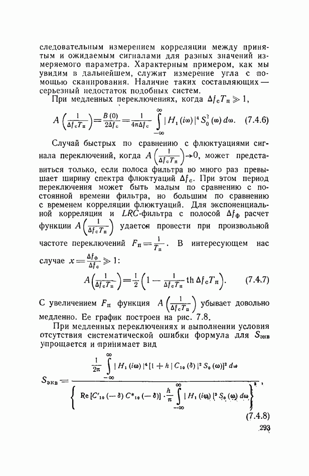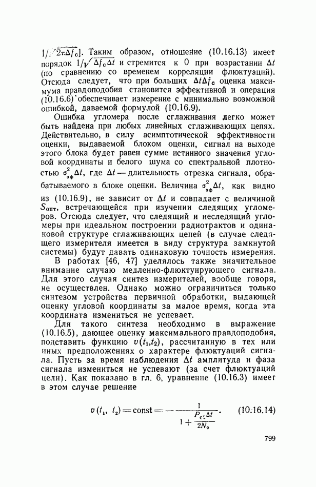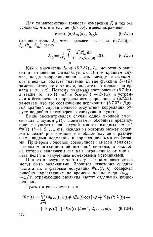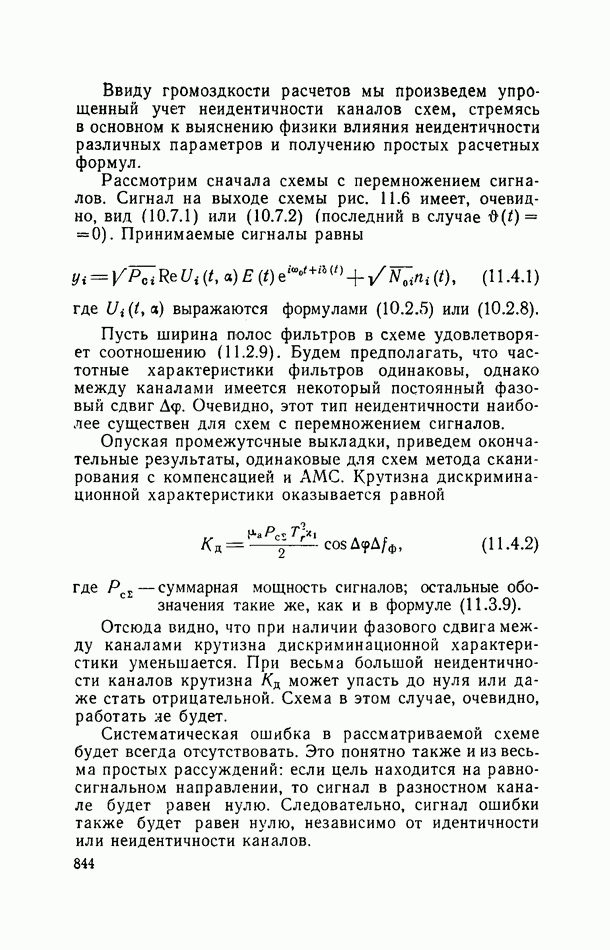 В случае быстрых флюктуаций сигналов сглаживающие цепи имеют меньшее отношение к вопросам разрешения. Вместе с тем их синтез при наличии многих целей и многих случайно изменяющихся во времени параметров, подлежащих измерению, представляет собой весьма сложную задачу. Этой задачи в настоящей книге мы касаться не будем — ограничимся лишь синтезом устройства, в котором сосредоточена собственно радиотехническая часть системы. Не делая различий между следящим и неследящим вариантами системы, назовем это устройство дискриминатором. Общие свойства оптимальных дискриминаторов, соответствующих многоцелевым задачам, будут сформулированы ниже.