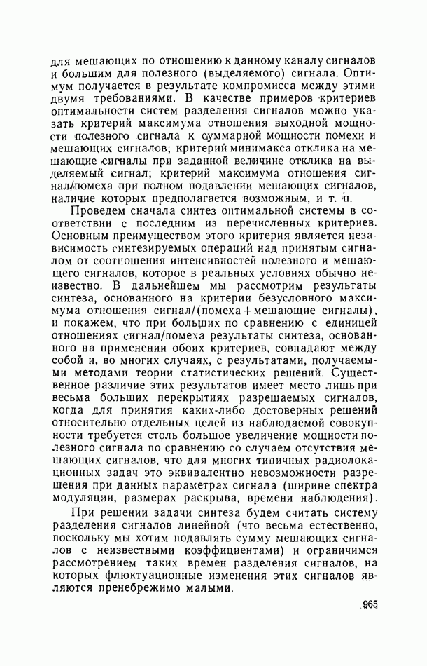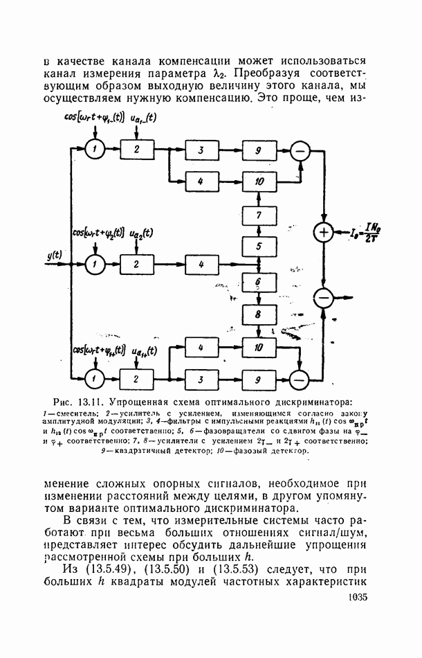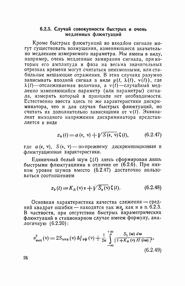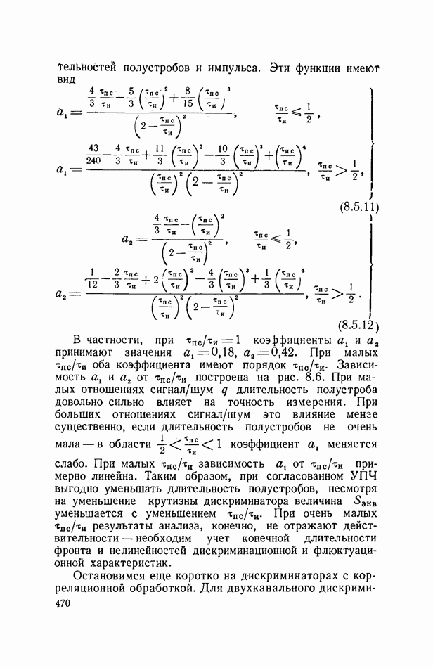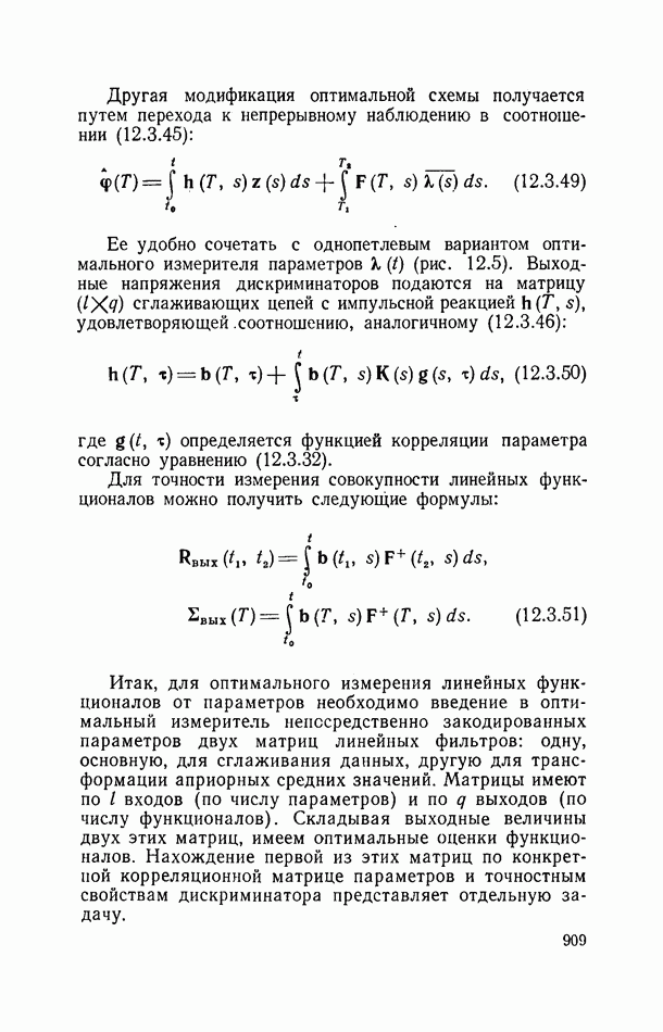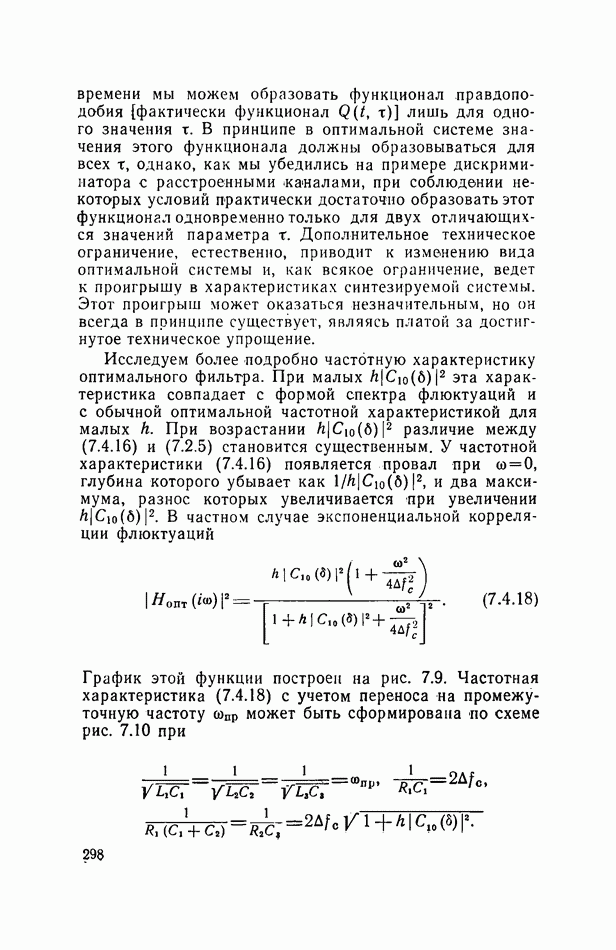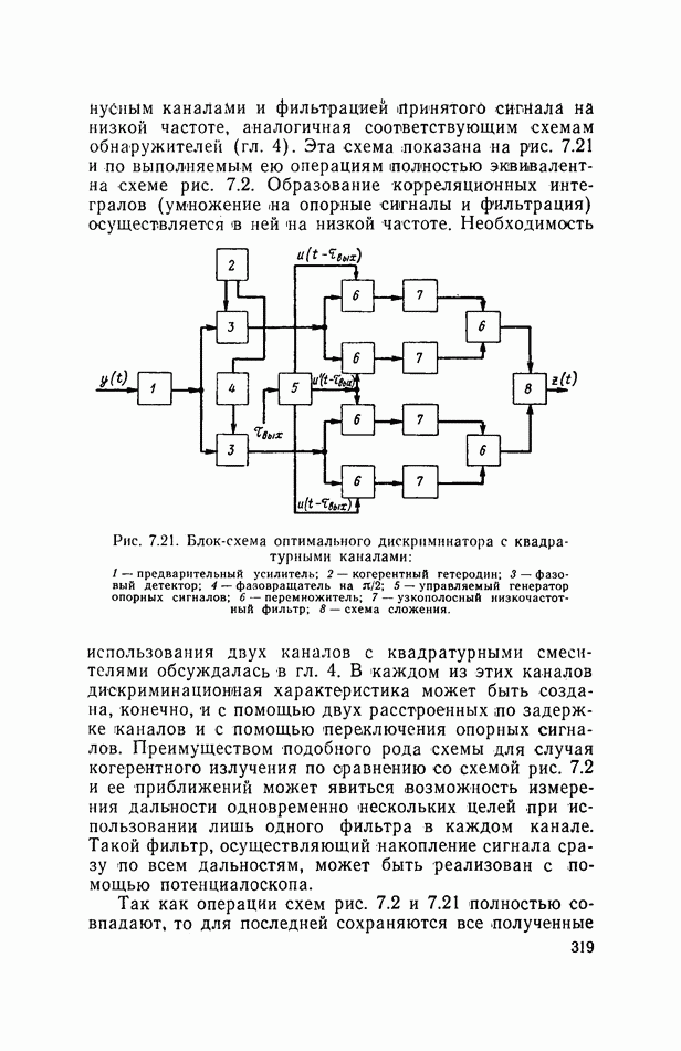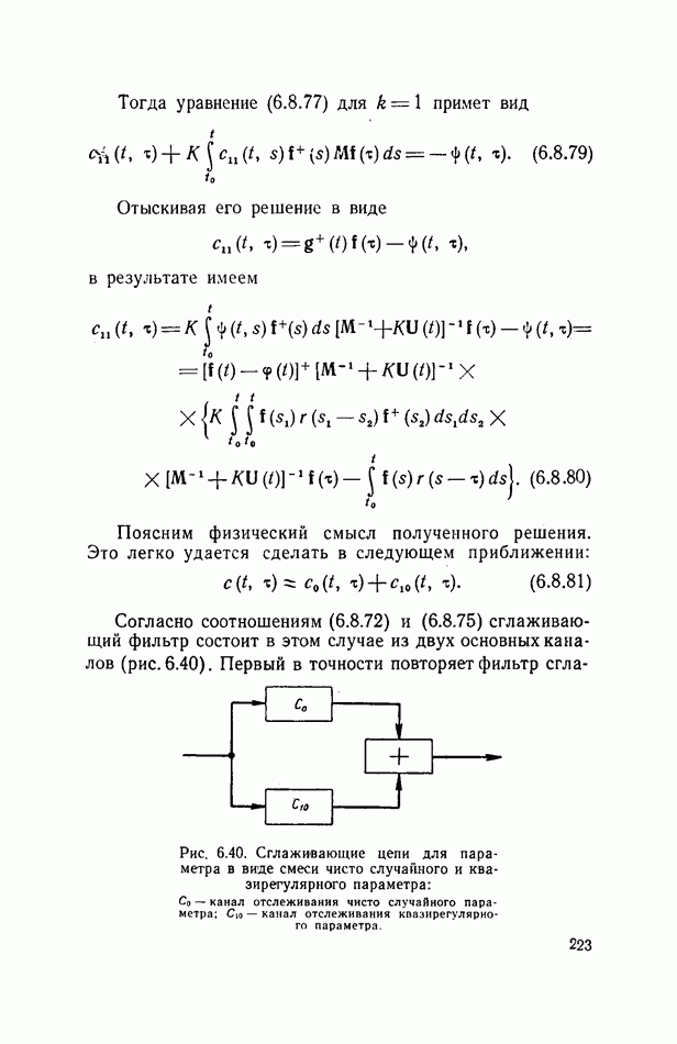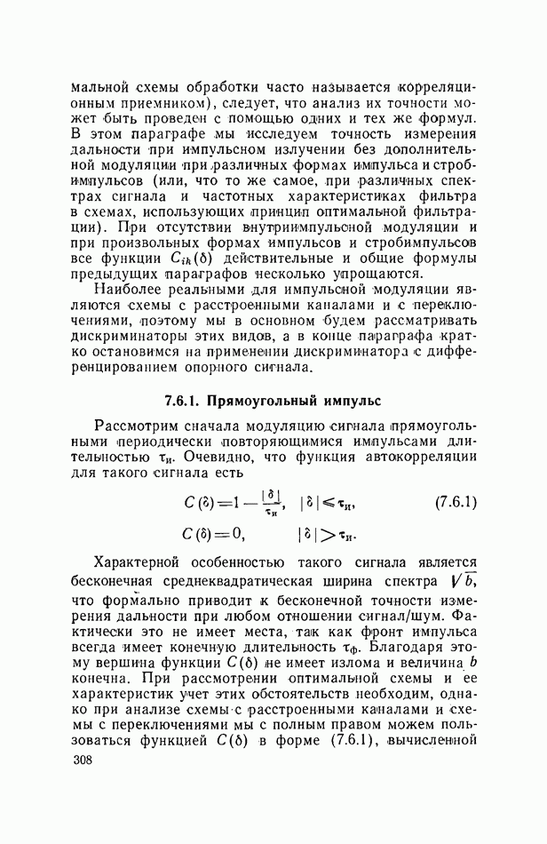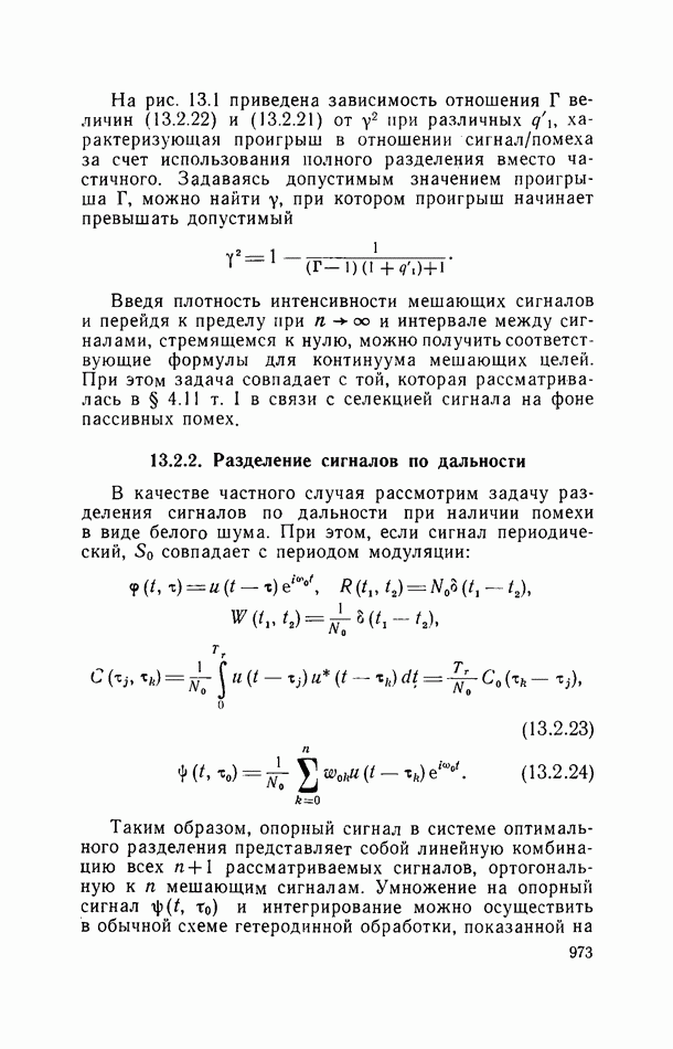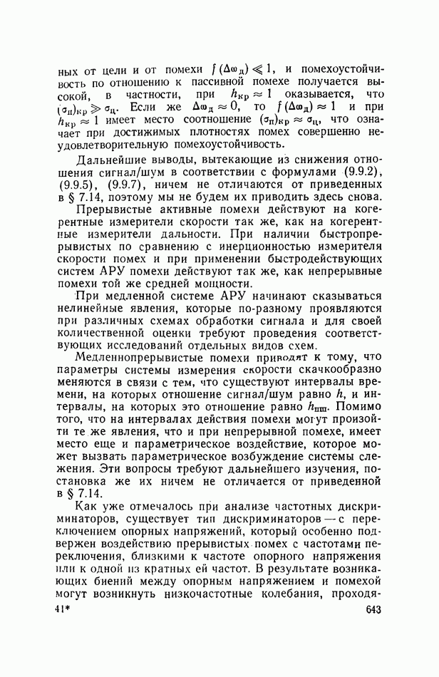 В случае быстрых флюктуаций сигналов сглаживающие цепи имеют меньшее отношение к вопросам разрешения. Вместе с тем их синтез при наличии многих целей и многих случайно изменяющихся во времени параметров, подлежащих измерению, представляет собой весьма сложную задачу. Этой задачи в настоящей книге мы касаться не будем — ограничимся лишь синтезом устройства, в котором сосредоточена собственно радиотехническая часть системы. Не делая различий между следящим и неследящим вариантами системы, назовем это устройство дискриминатором. Общие свойства оптимальных дискриминаторов, соответствующих многоцелевым задачам, будут сформулированы ниже.