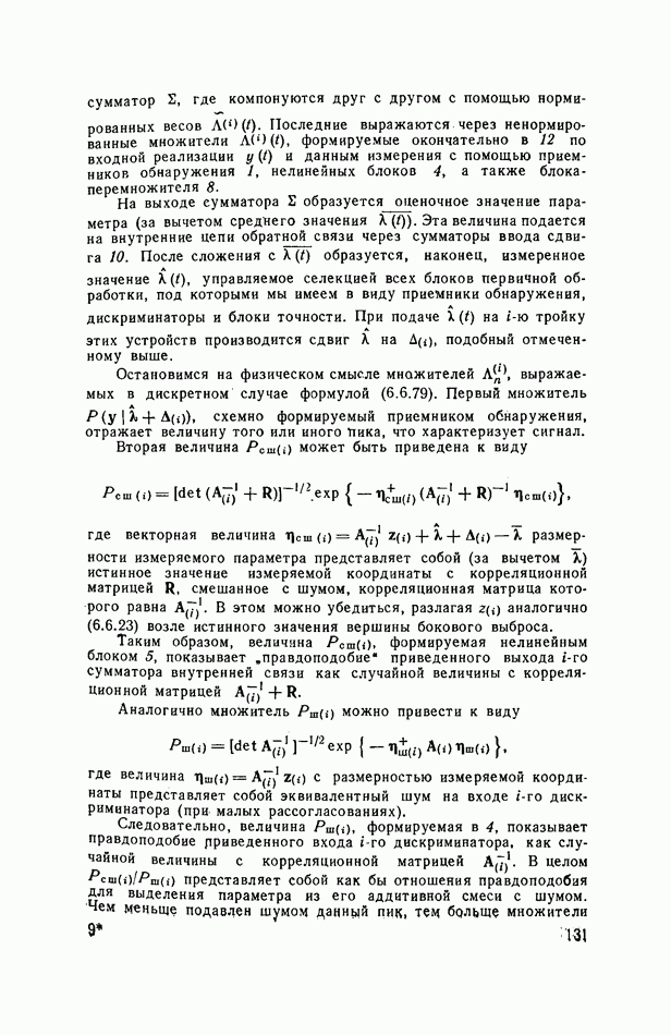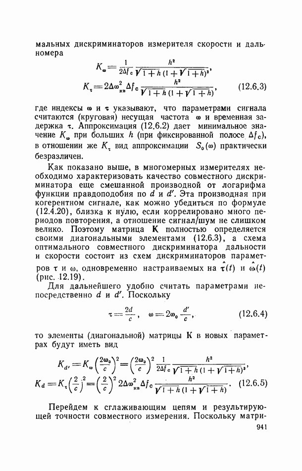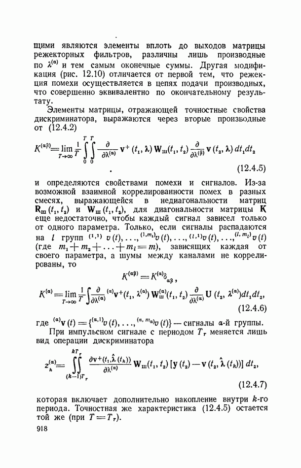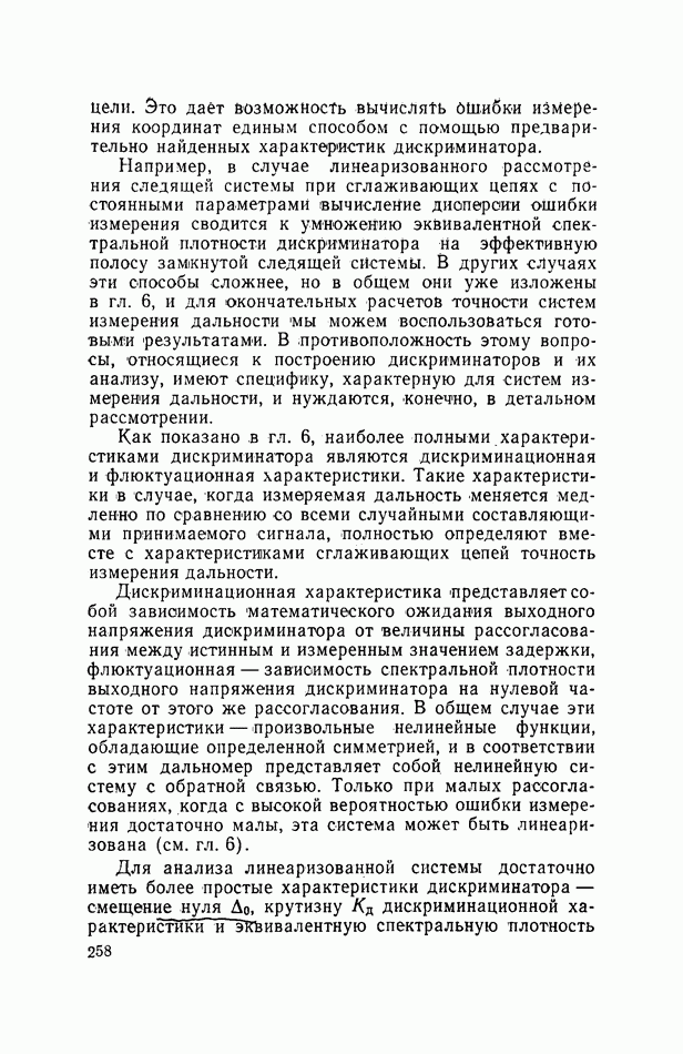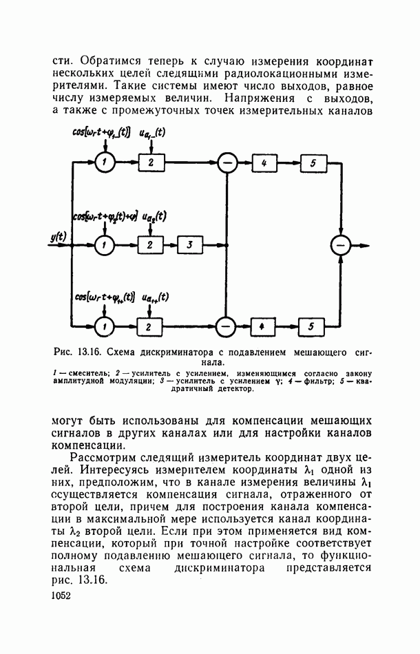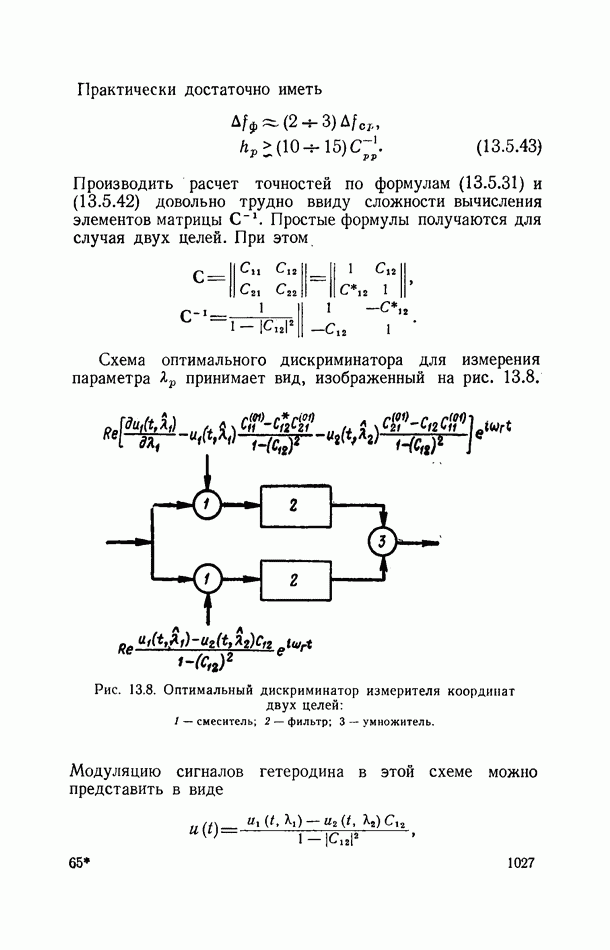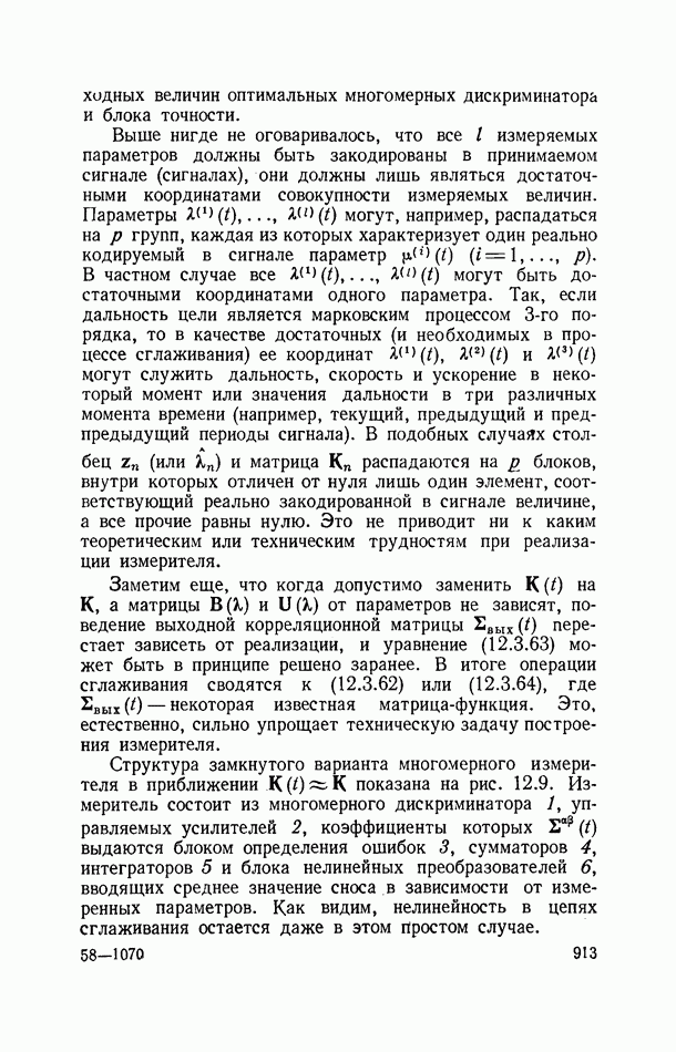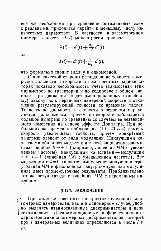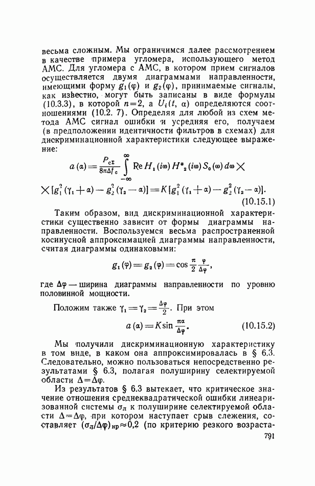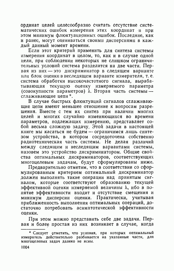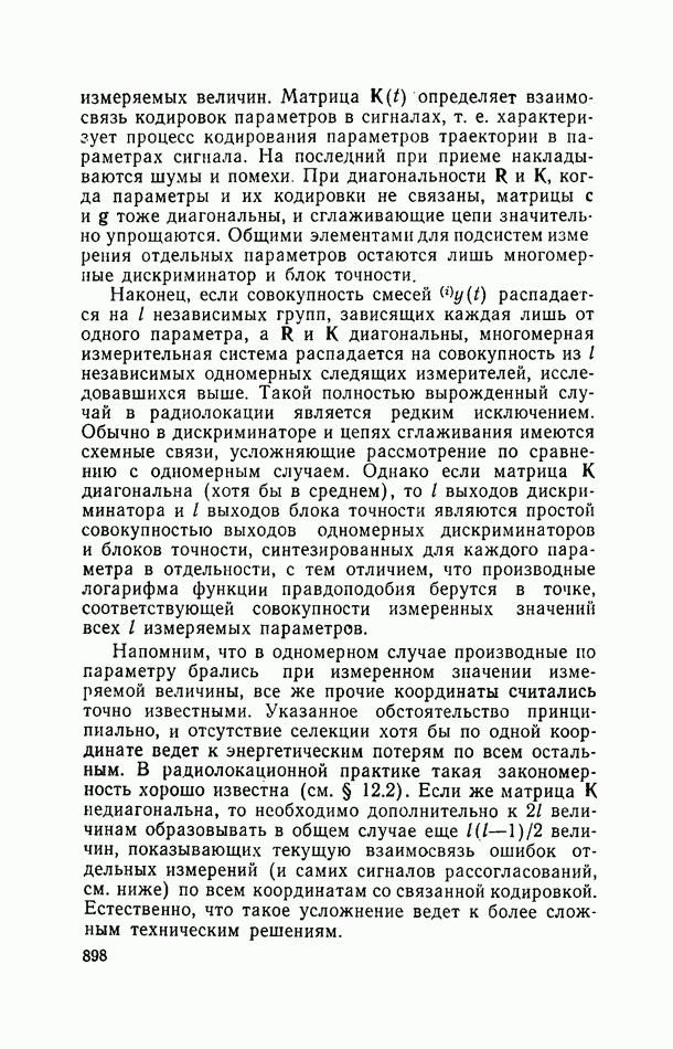 Если этот критерий применить для синтеза системы измерения координат в целом, то, как и в случае одной цели, при соблюдении некоторых не слишком ограничительных условий система разделится на две части. Первая из них — это дискриминатор в следящем варианте или блок оценки в неследящем варианте измерителя, т. е. система обработки высокочастотного сигнала, вырабатывающая текущую оценку измеряемого параметра (совокупности параметров)