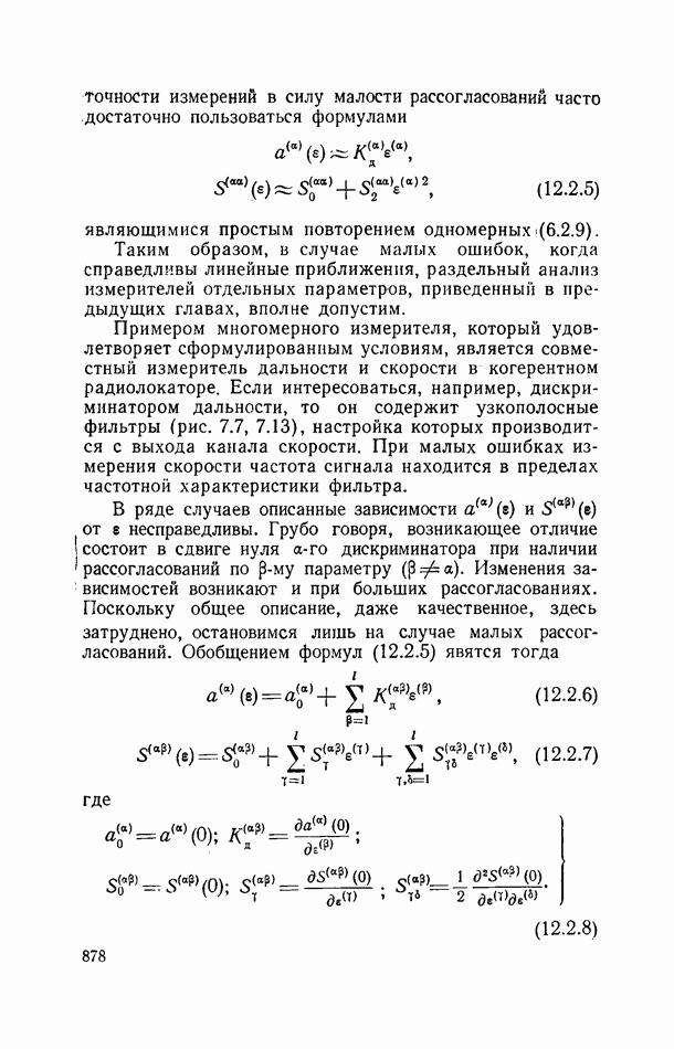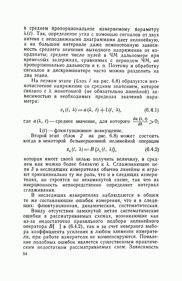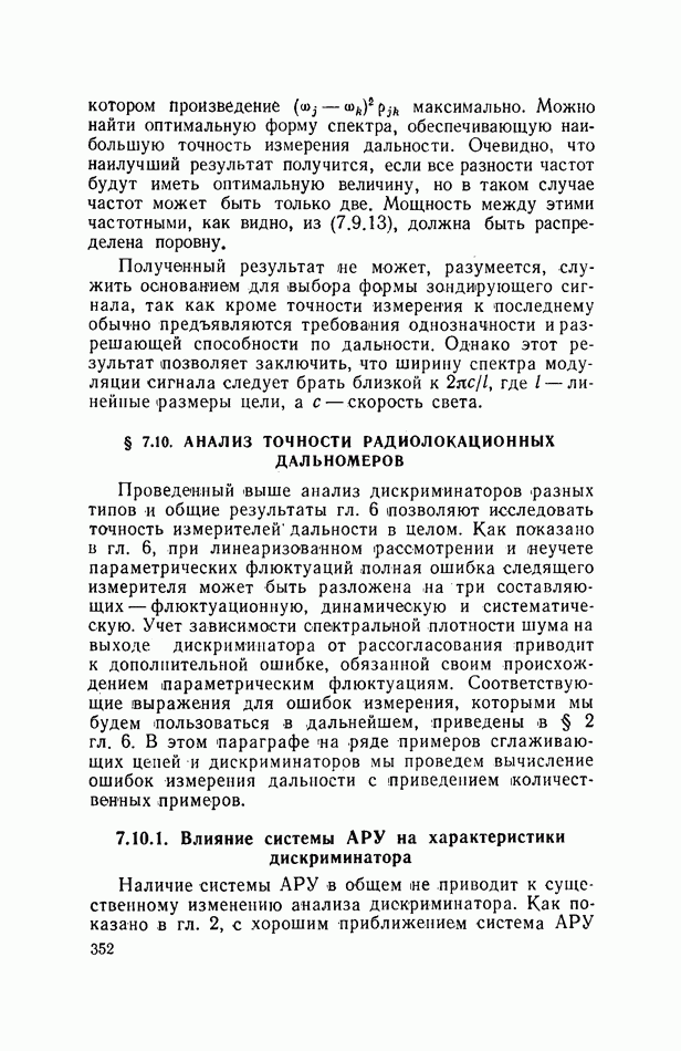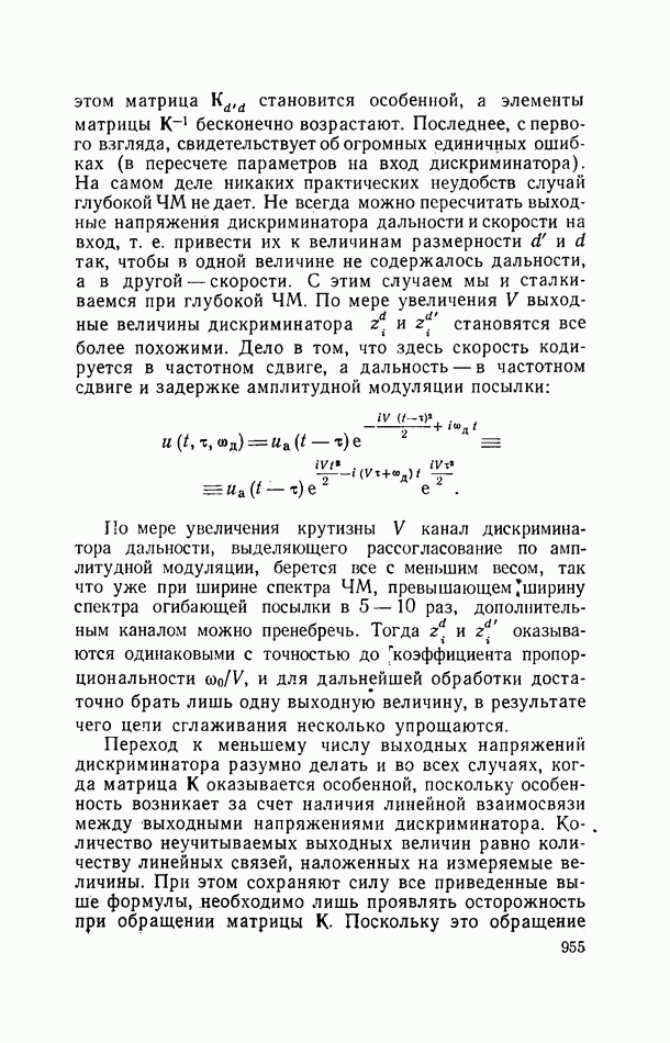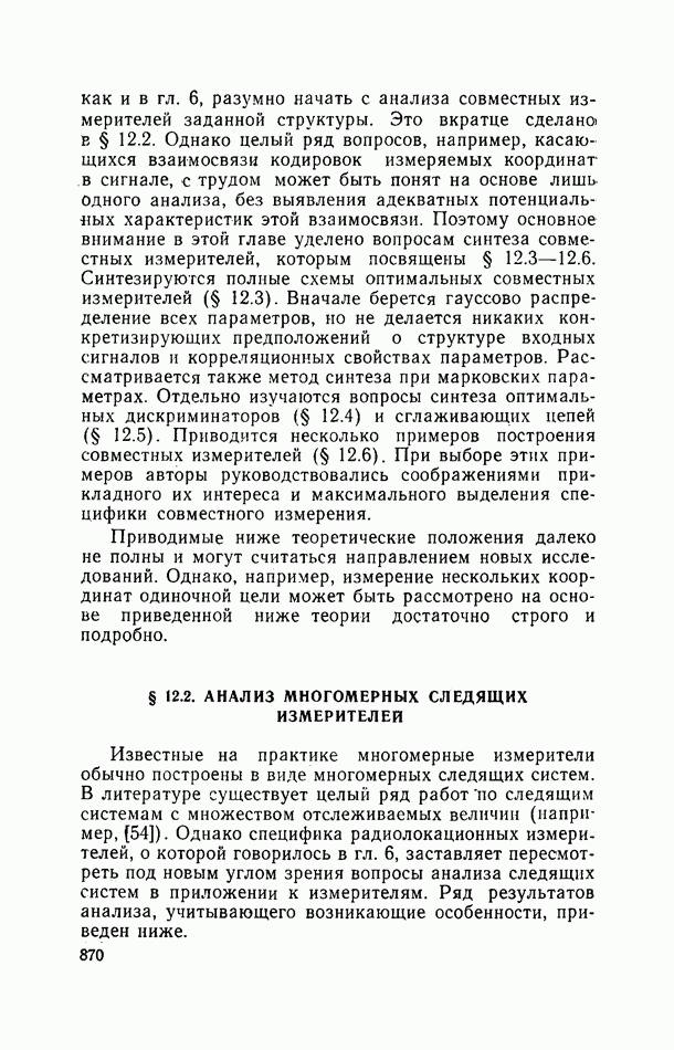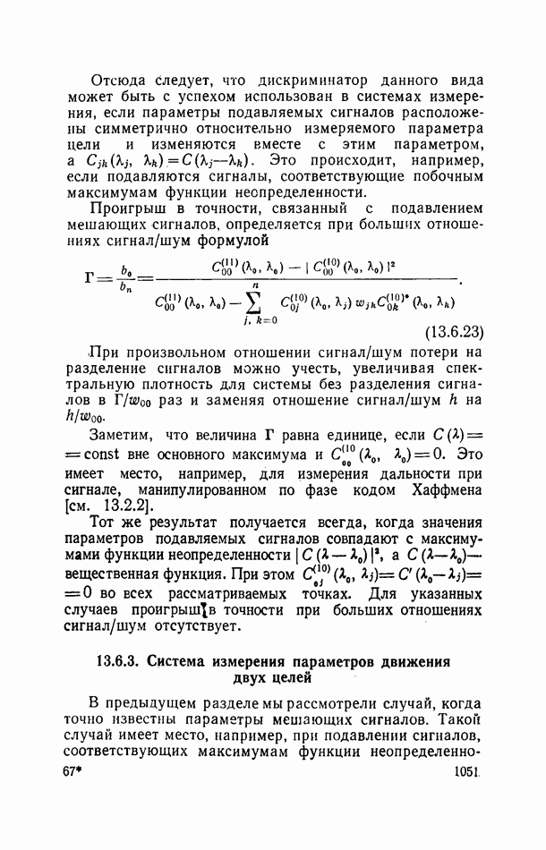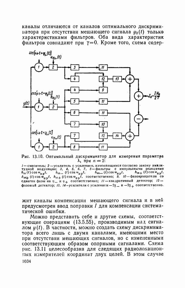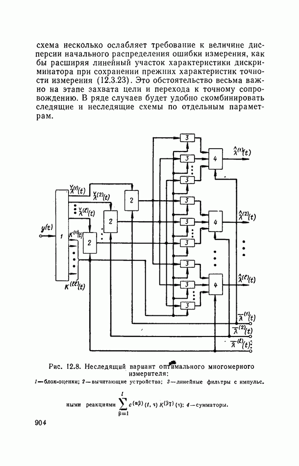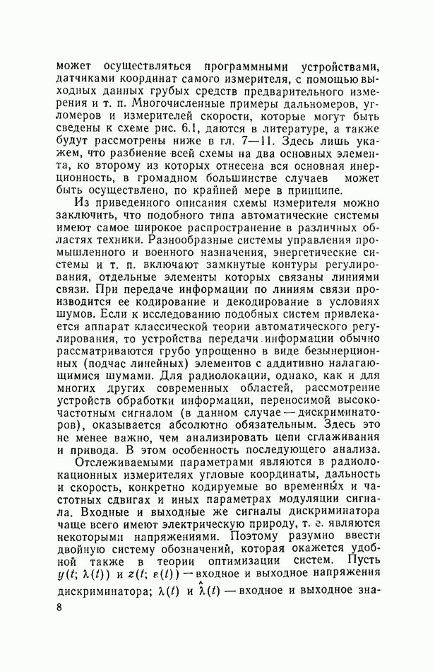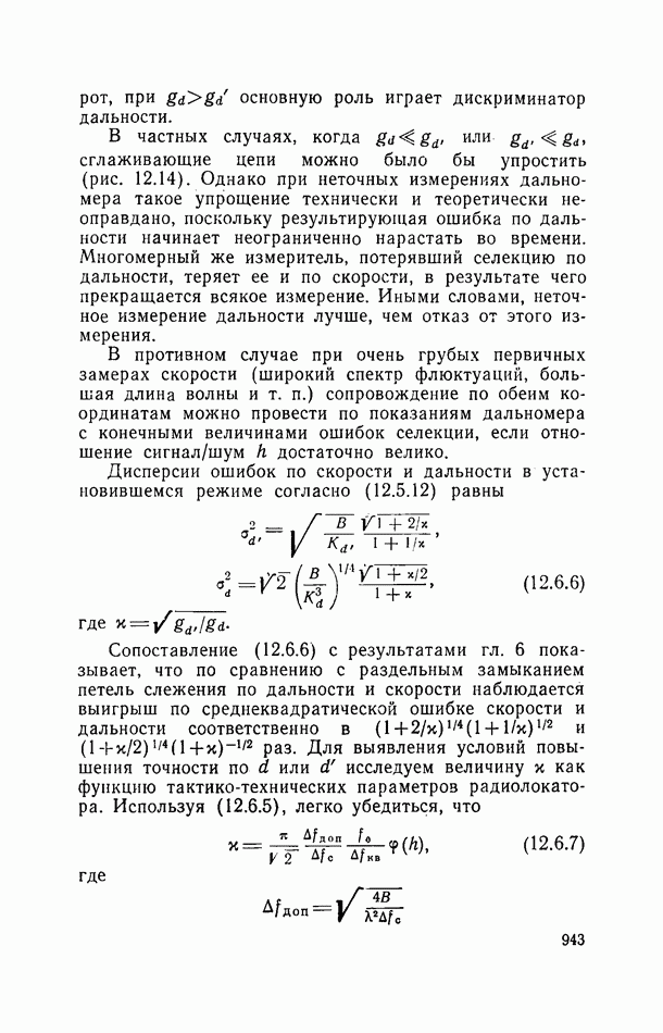 Если этот критерий применить для синтеза системы измерения координат в целом, то, как и в случае одной цели, при соблюдении некоторых не слишком ограничительных условий система разделится на две части. Первая из них — это дискриминатор в следящем варианте или блок оценки в неследящем варианте измерителя, т. е. система обработки высокочастотного сигнала, вырабатывающая текущую оценку измеряемого параметра (совокупности параметров)