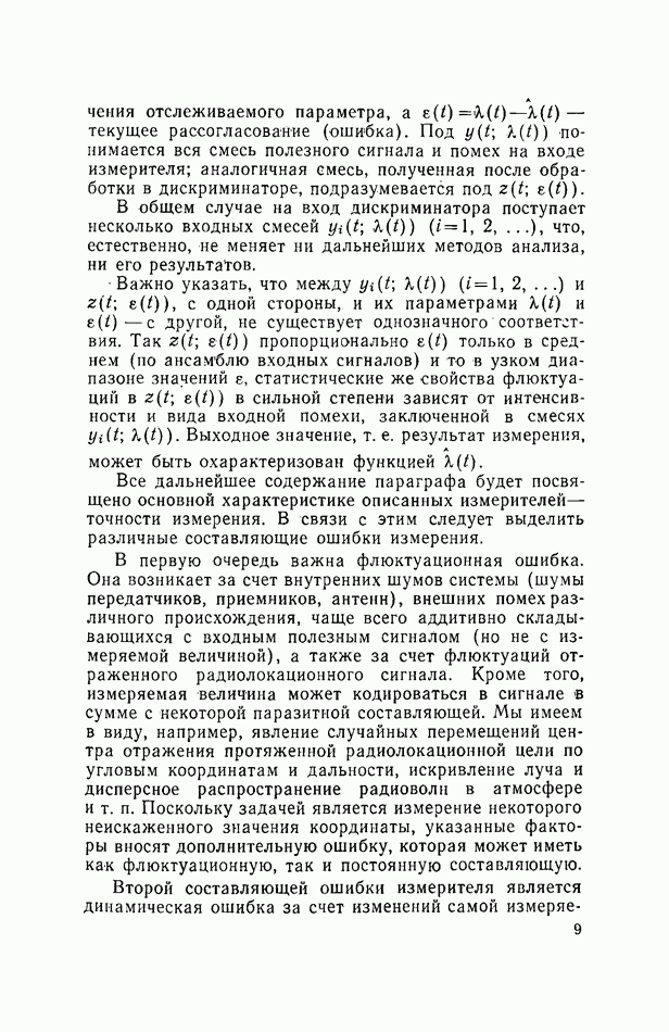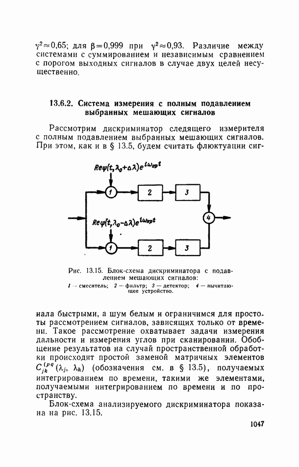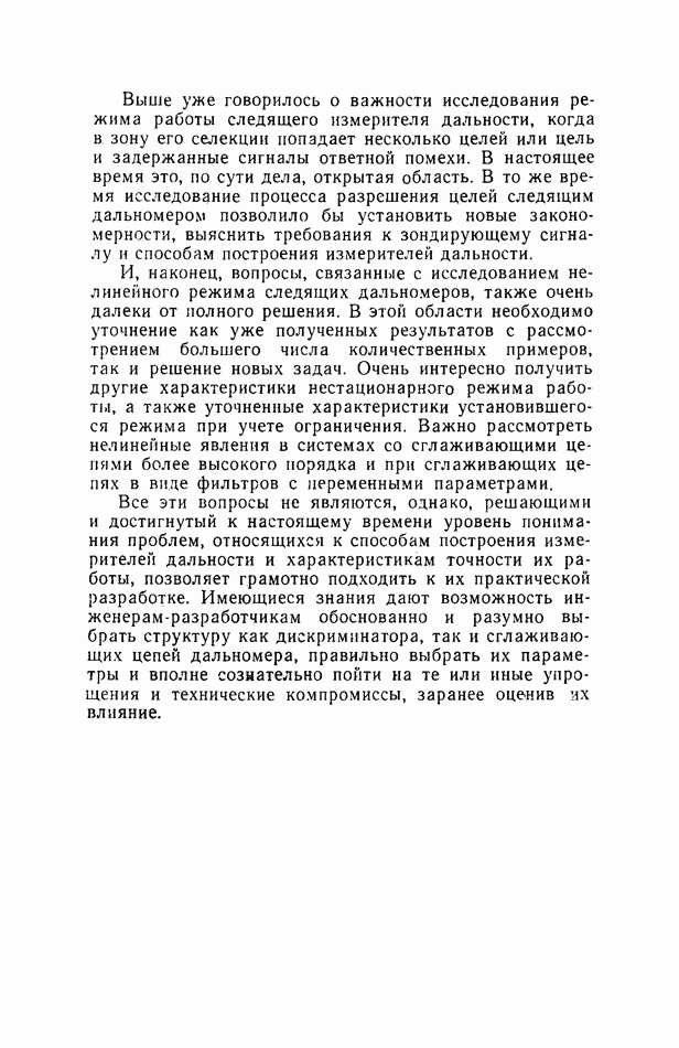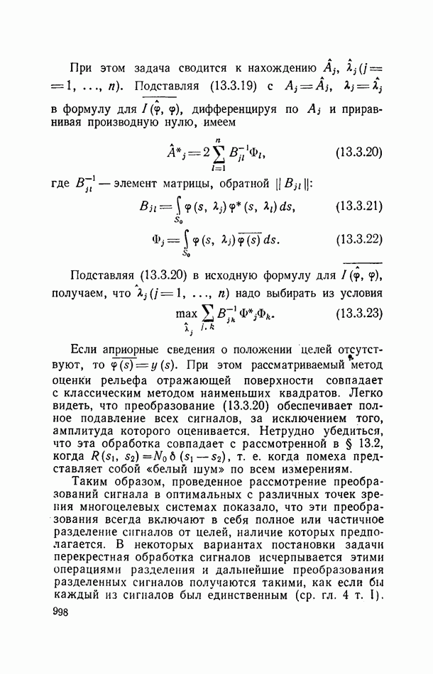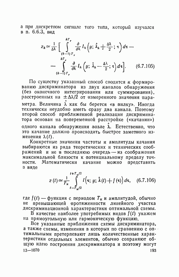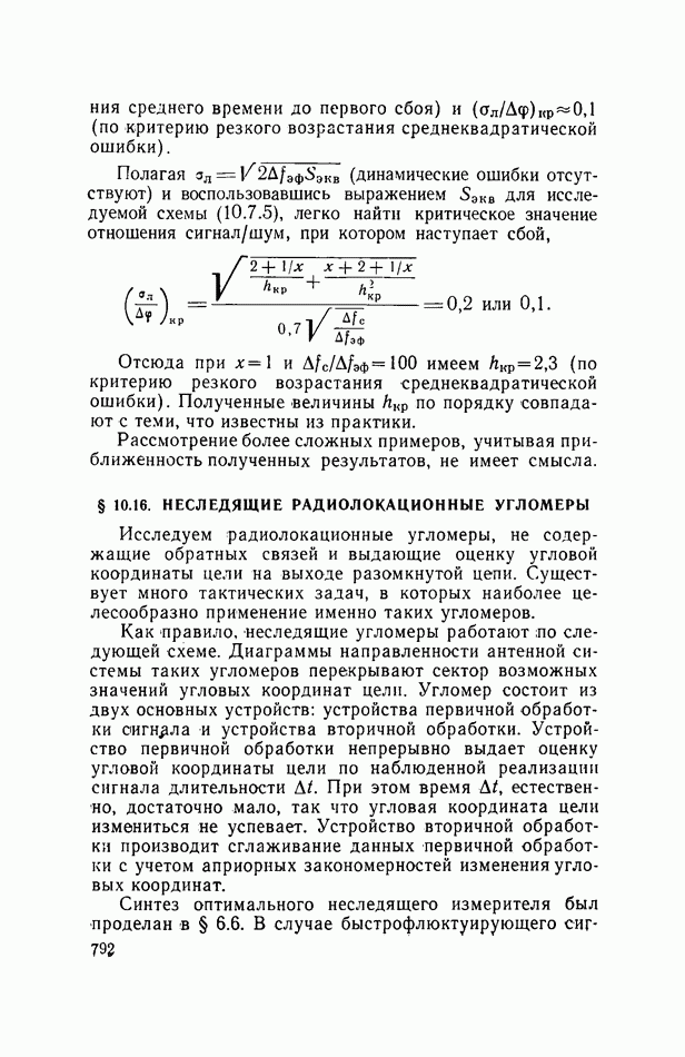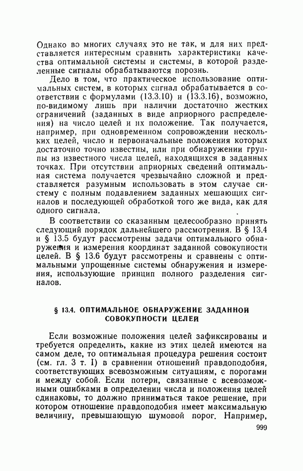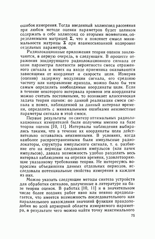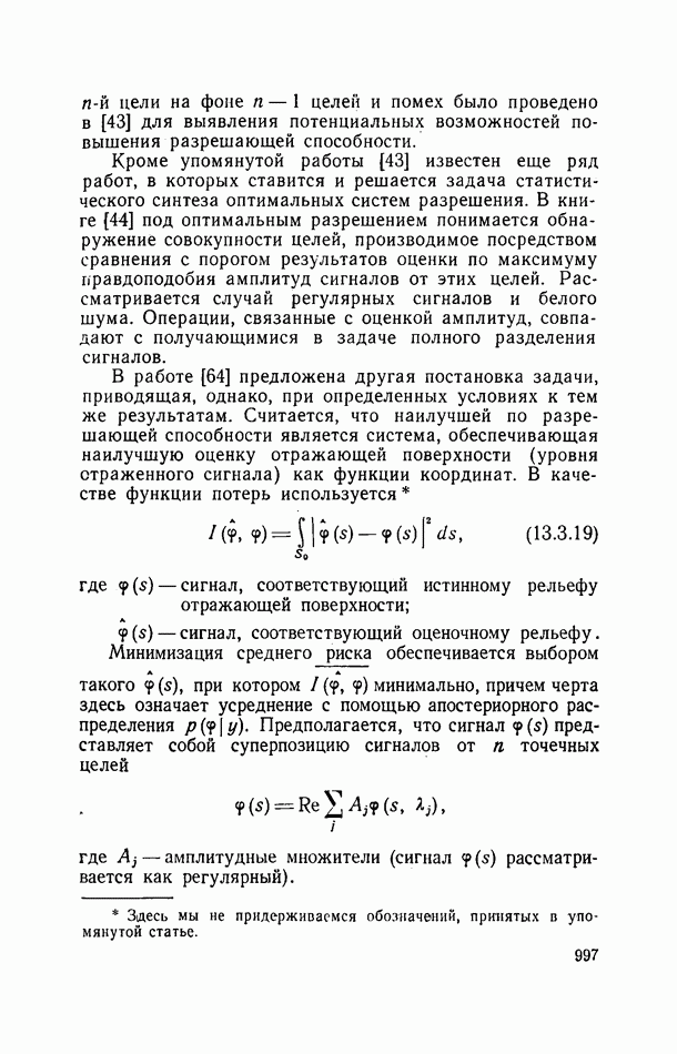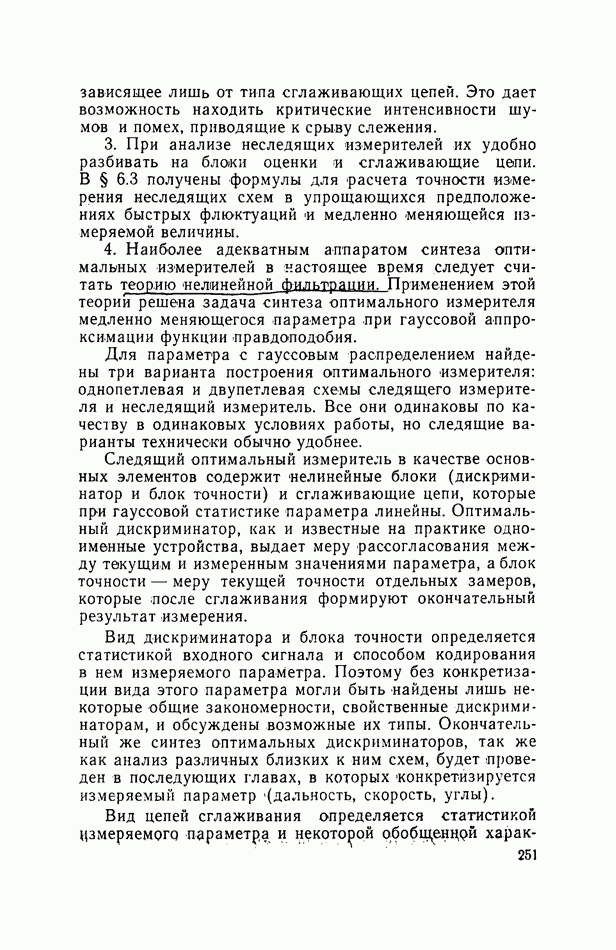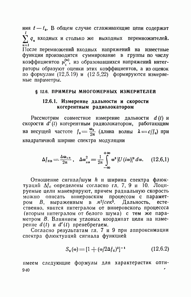 Если этот критерий применить для синтеза системы измерения координат в целом, то, как и в случае одной цели, при соблюдении некоторых не слишком ограничительных условий система разделится на две части. Первая из них — это дискриминатор в следящем варианте или блок оценки в неследящем варианте измерителя, т. е. система обработки высокочастотного сигнала, вырабатывающая текущую оценку измеряемого параметра (совокупности параметров)
