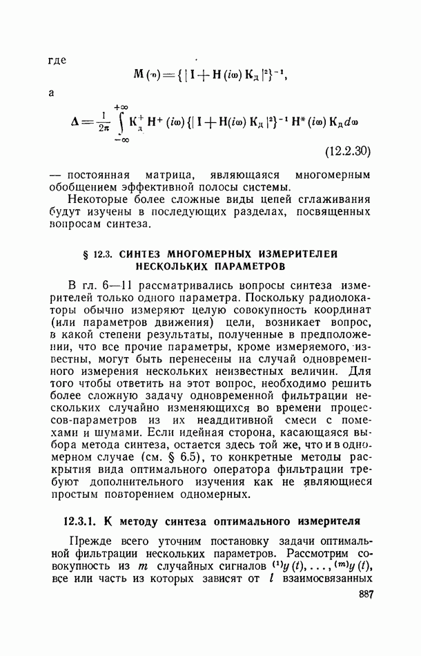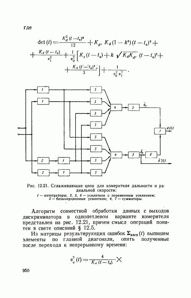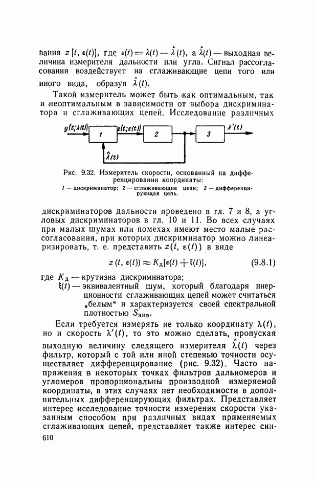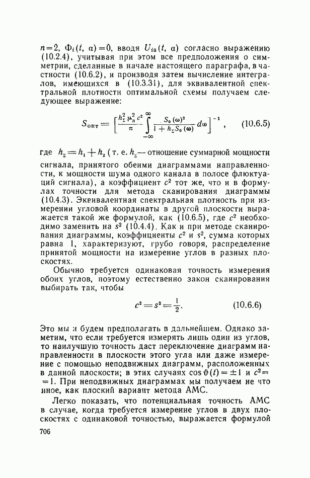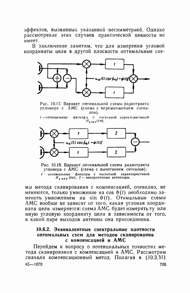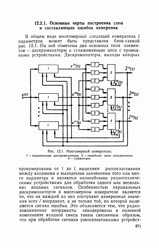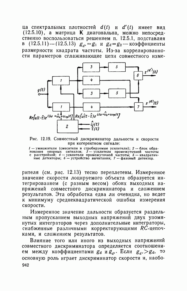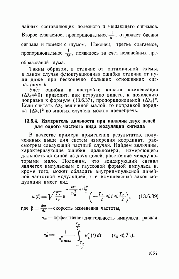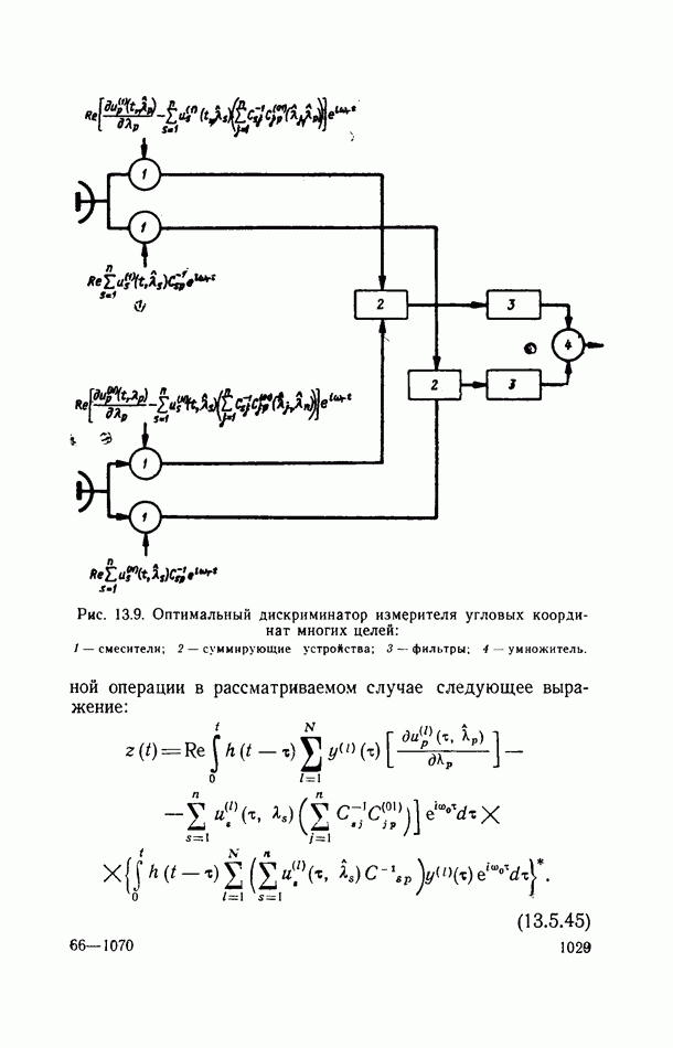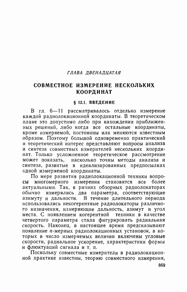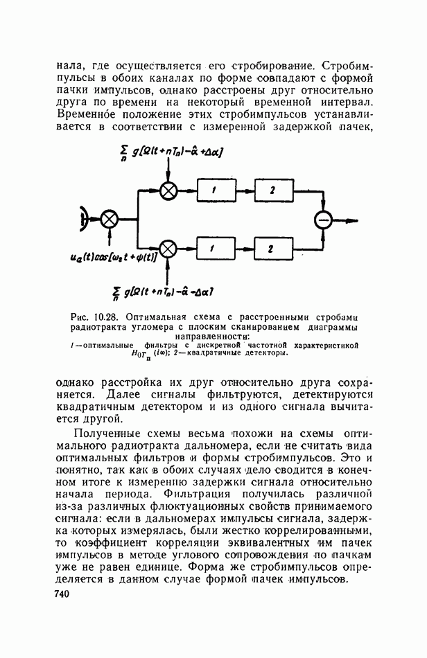 Если этот критерий применить для синтеза системы измерения координат в целом, то, как и в случае одной цели, при соблюдении некоторых не слишком ограничительных условий система разделится на две части. Первая из них — это дискриминатор в следящем варианте или блок оценки в неследящем варианте измерителя, т. е. система обработки высокочастотного сигнала, вырабатывающая текущую оценку измеряемого параметра (совокупности параметров)