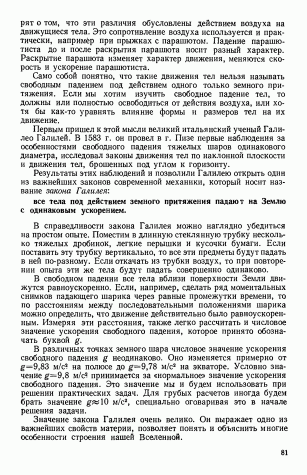 В справедливости закона Галилея можно наглядно убедиться на простом опыте. Поместим в длинную стеклянную трубку несколько тяжелых дробинок, легкие перышки и кусочки бумаги. Если поставить эту трубку вертикально, то все эти предметы будут падать в ней по-разному. Если откачать из трубки воздух, то при повторении опыта эти же тела будут падать совершенно одинаково.