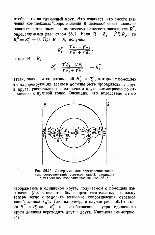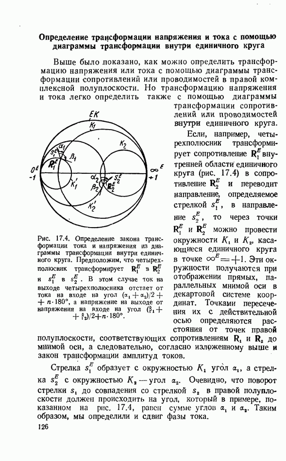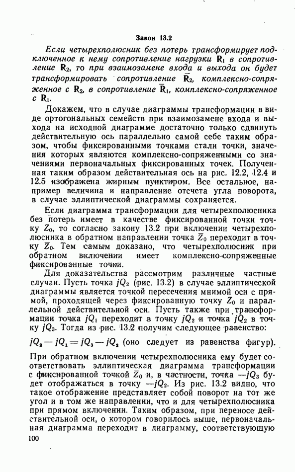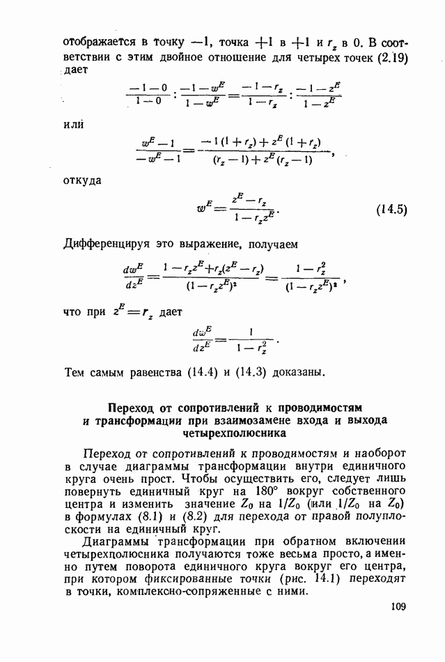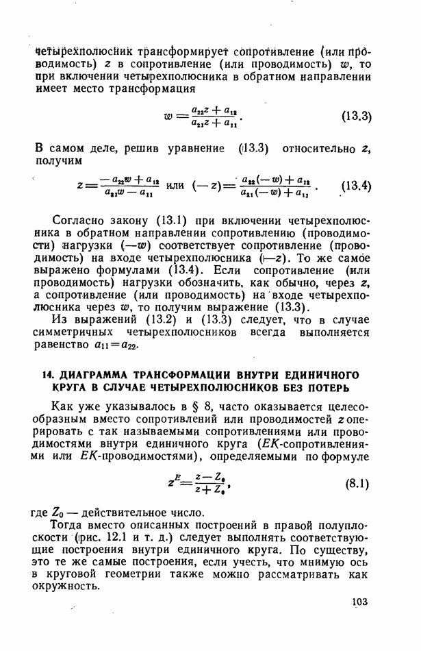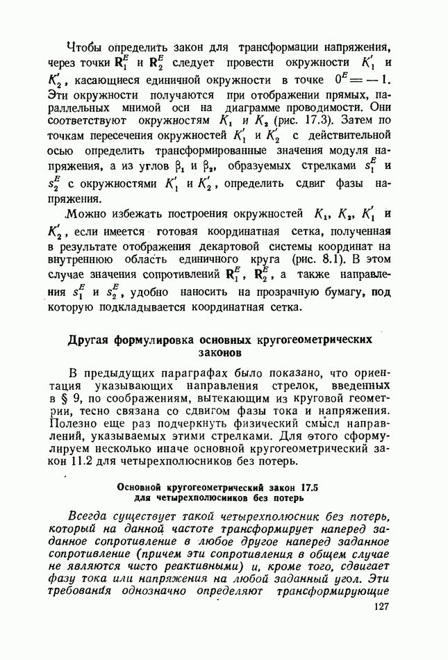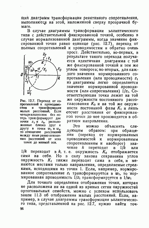 В случае диаграммы трансформации эллиптического типа с действительной фиксированной точкой, особенно в случае нормализованной диаграммы, когда значение фиксированной точки равно единице (рис. 12.7), переход от полных сопротивлений к проводимостям и обратно очень прост. Действительно, во-первых, в результате такого перехода получается идентичная диаграмма с той же фиксированной точкой и тем же углом поворота; во-вторых, для каждого значения нормированного сопротивления (или проводимости)