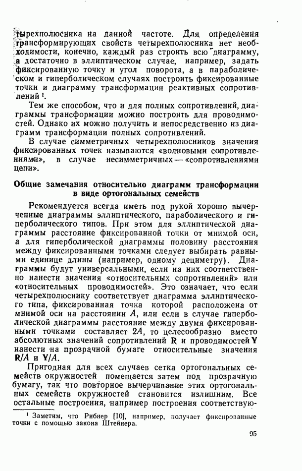 Рекомендуется всегда иметь под рукой хорошо вычерченные диаграммы эллиптического, параболического и гиперболического типов. При этом для эллиптической диаграммы расстояние фиксированной точки от мнимой оси, а для гиперболической диаграммы половину расстояния между фиксированными точками следует выбирать равными единице длины (например, одному дециметру). Диаграммы будут универсальными, если на них соответственно нанести значения «относительных сопротивлений» или «относительных проводимостей». Это означает, что если четырехполюснику соответствует диаграмма эллиптического типа, фиксированная точка которой расположена от мнимой оси на расстоянии А, или если в случае гиперболической диаграммы расстояние между двумя фиксированными точками составляет