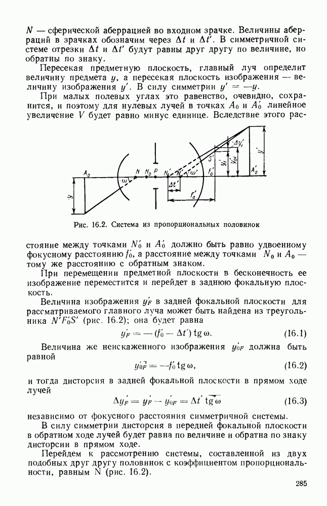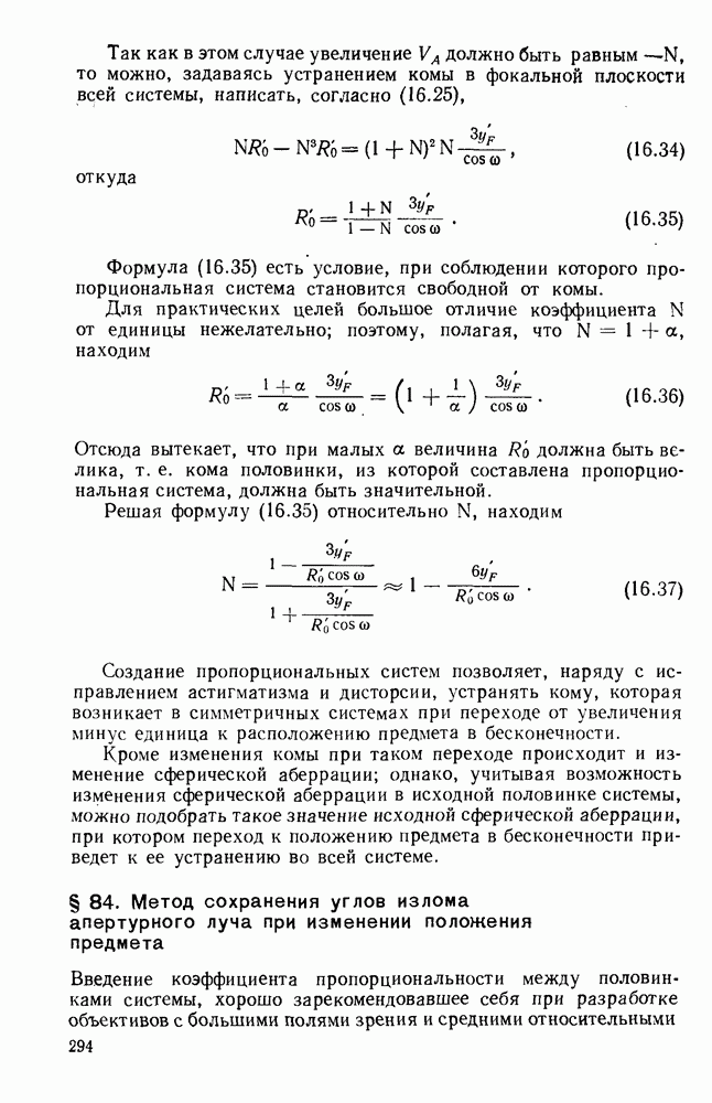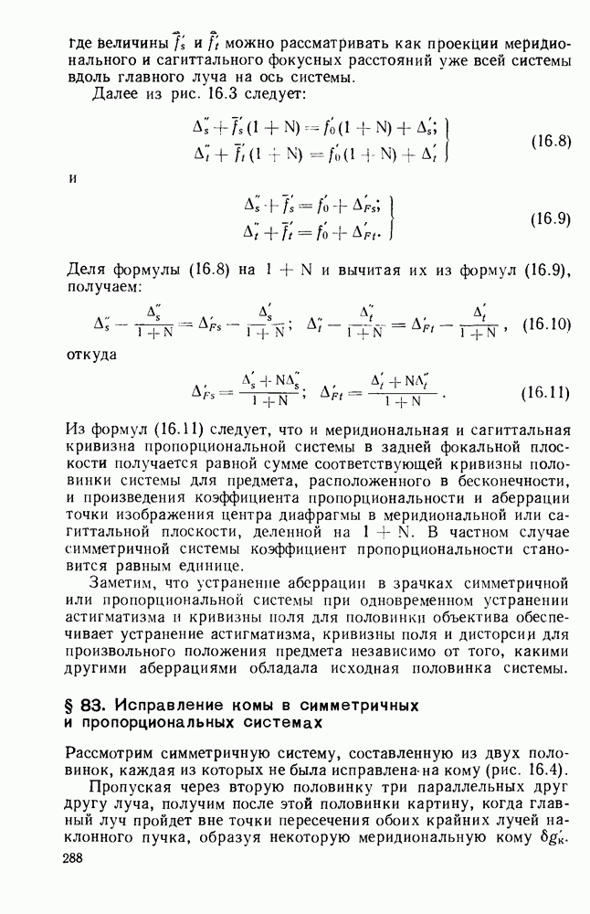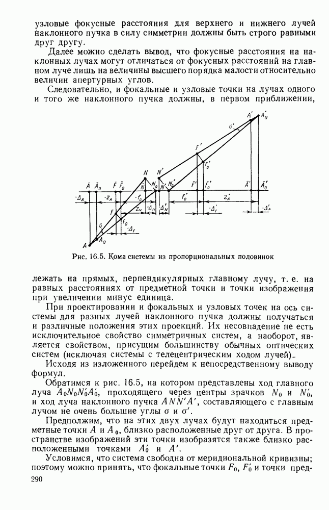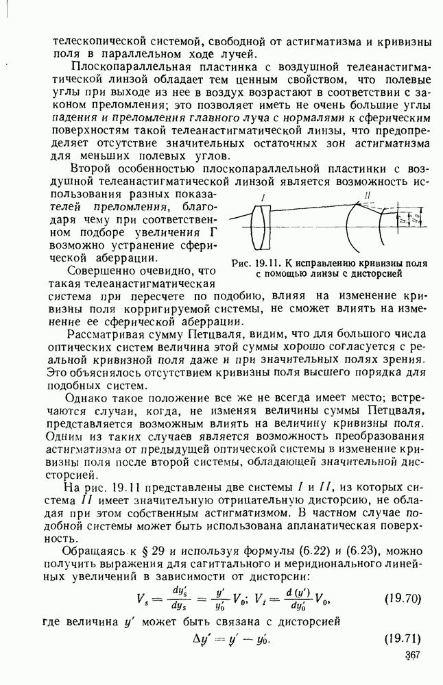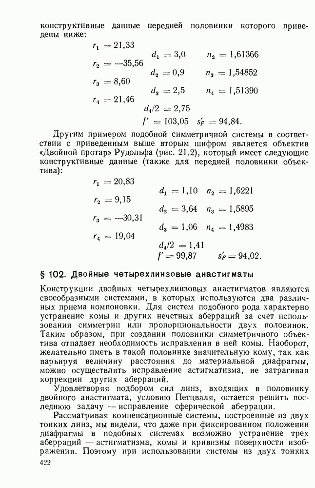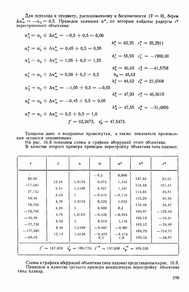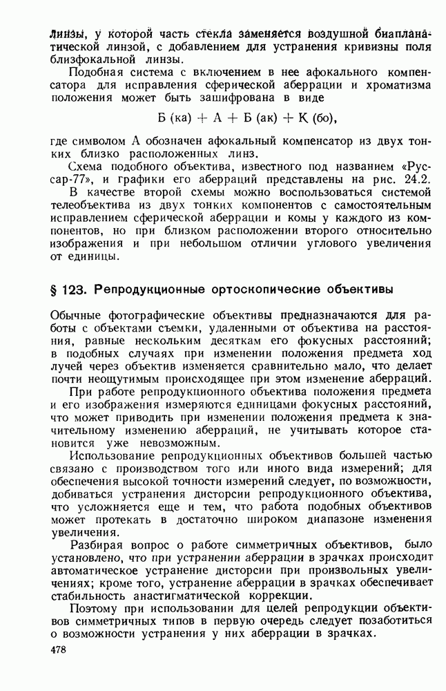 Заметим, что в репродукционных объективах, работающих с увеличениями, близкими к единице, можно было бы избежать большого изменения комы при изменении увеличения. Такие объективы должны строиться на основе систем симметричного типа с уменьшенным промежуточным изображением, расположенным в плоскости симметрии, и телецентрическим ходом лучей в пространстве между обеими половинками такой системы. При этом изменение увеличения достигается за счет изменения расстояния между половинками системы. К сожалению, систем подобного рода пока еще не имеется.