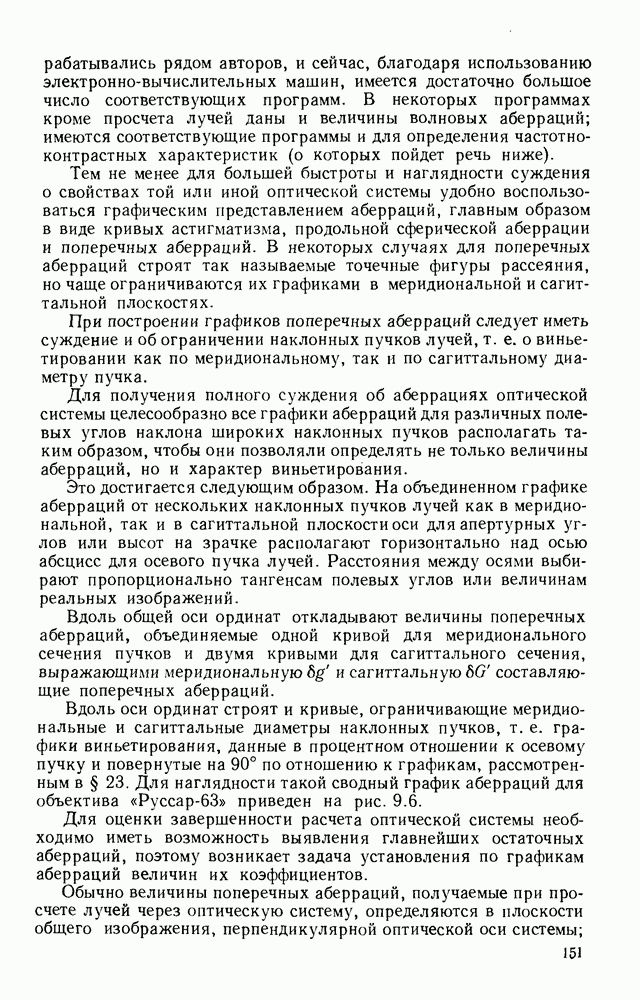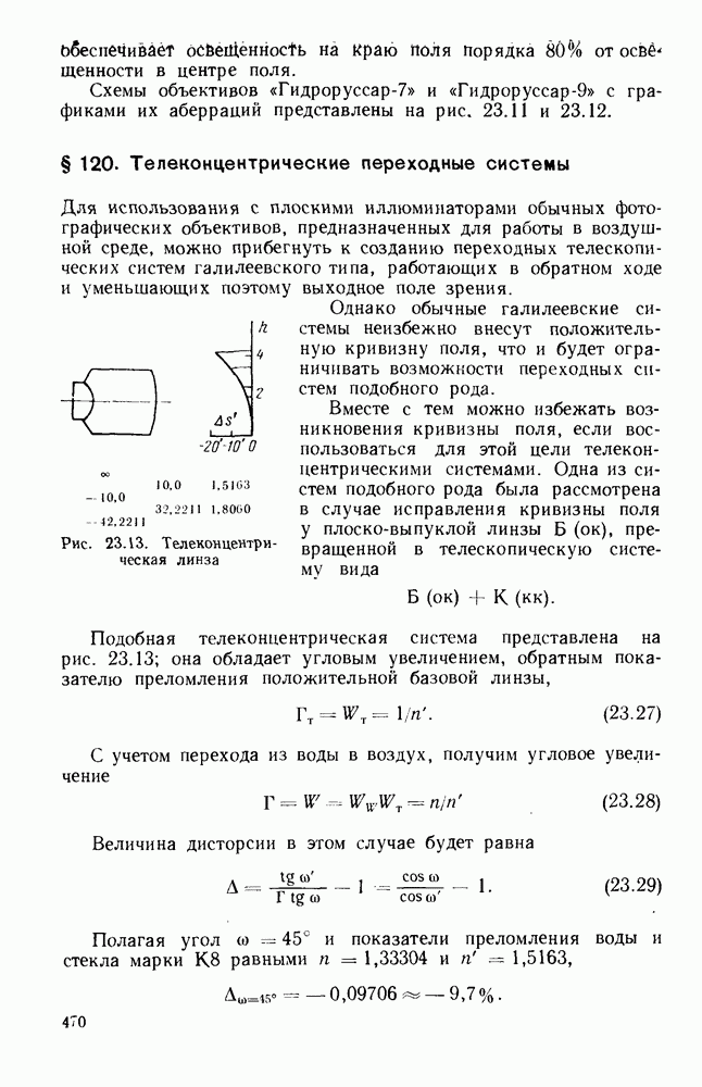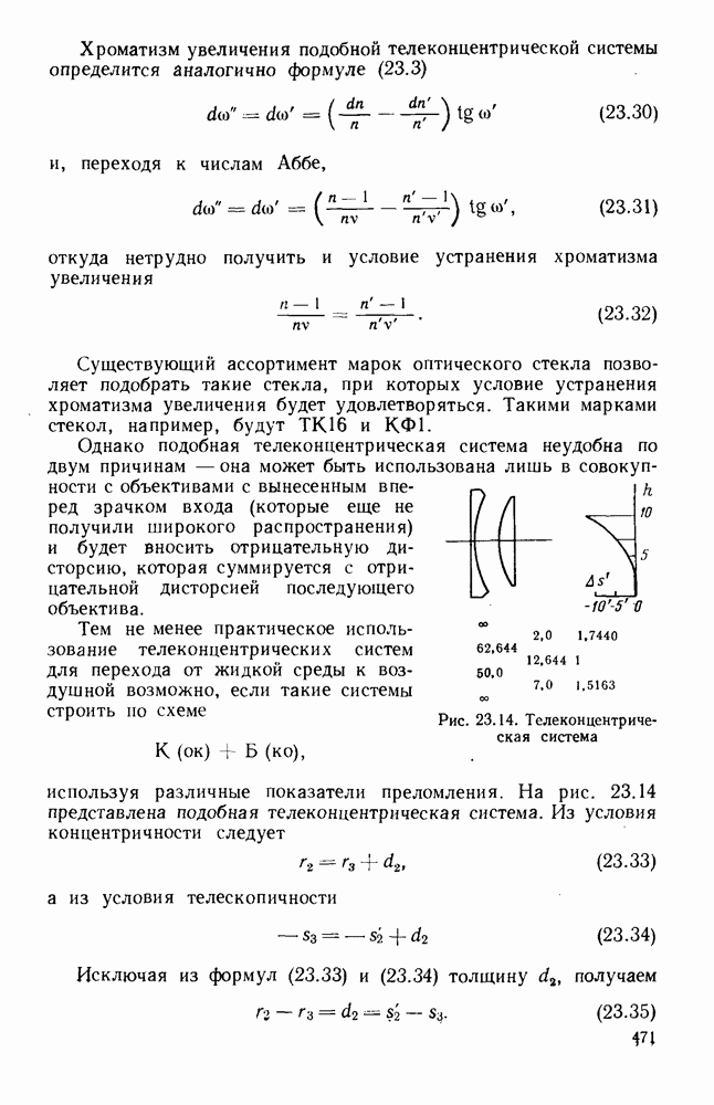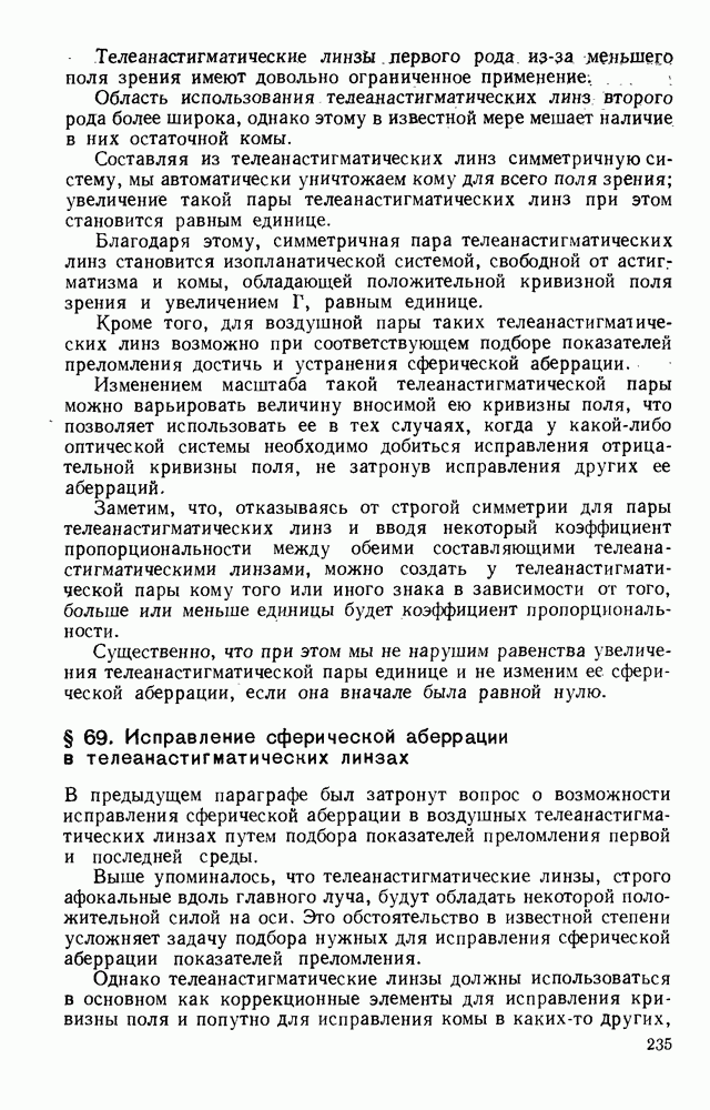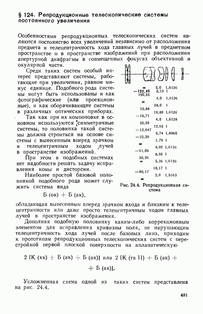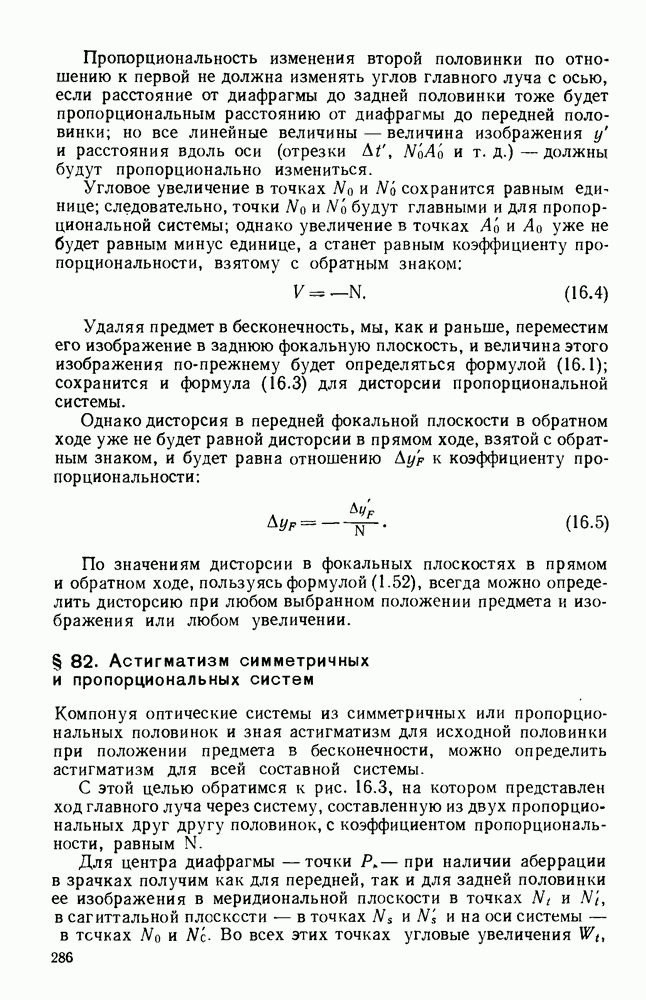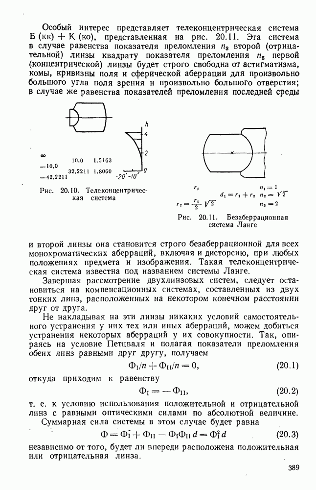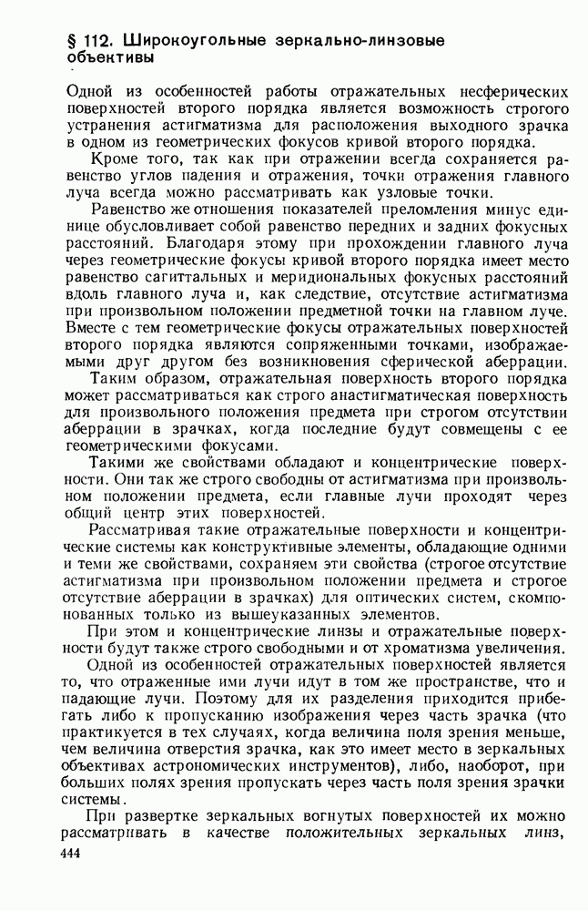 Заметим, что в репродукционных объективах, работающих с увеличениями, близкими к единице, можно было бы избежать большого изменения комы при изменении увеличения. Такие объективы должны строиться на основе систем симметричного типа с уменьшенным промежуточным изображением, расположенным в плоскости симметрии, и телецентрическим ходом лучей в пространстве между обеими половинками такой системы. При этом изменение увеличения достигается за счет изменения расстояния между половинками системы. К сожалению, систем подобного рода пока еще не имеется.