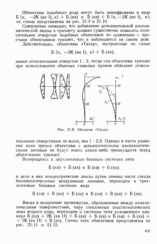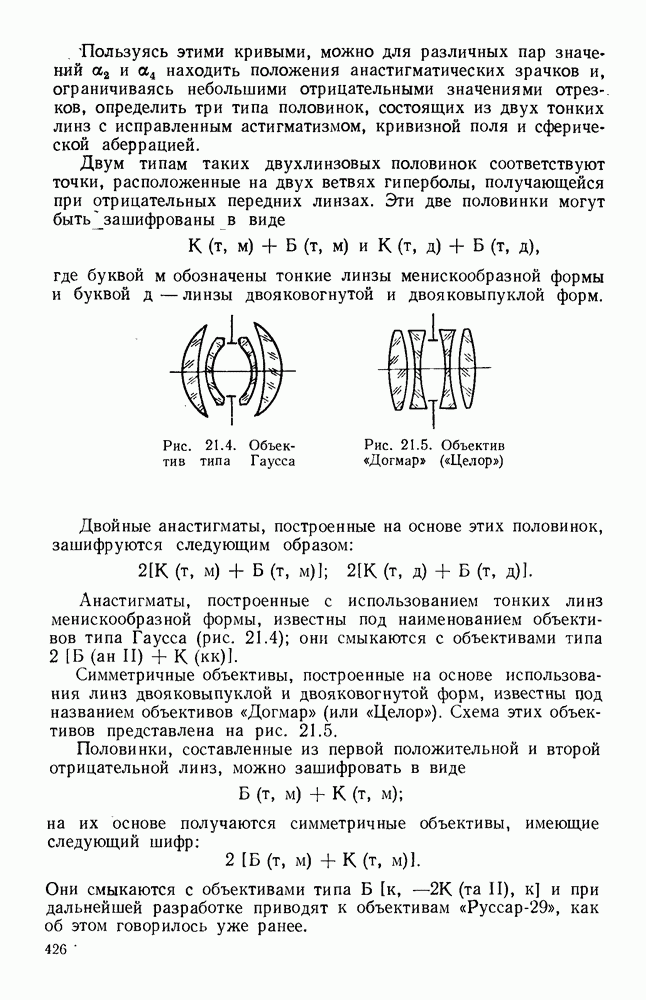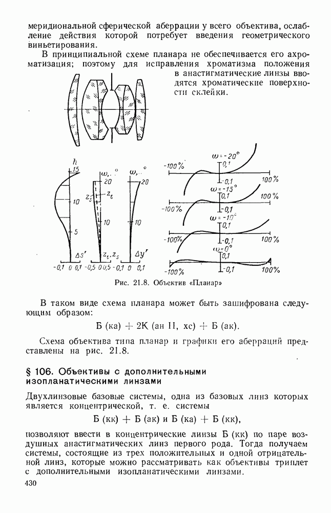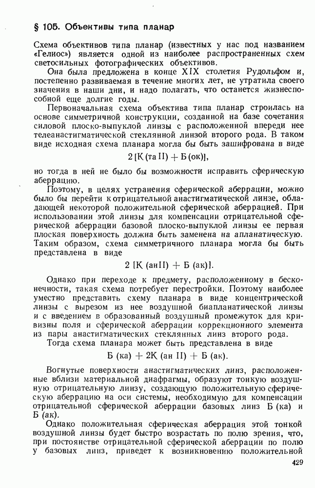 Вторая схема объективов типа Гаусса обладает небольшой отрицательной аберрацией в зрачках, устранение которой может быть легко осуществлено за счет введения до и после объектива плоскопараллельных пластинок соответственной толщины. Объективы, построенные по этой схеме, обладают хорошими возможностями исправления полевых аберраций и поэтому могут быть рекомендованы для использования их в качестве репродукционных объективов.