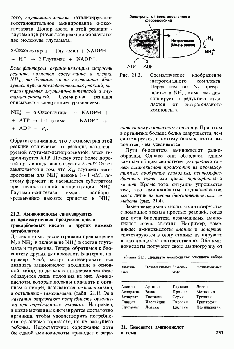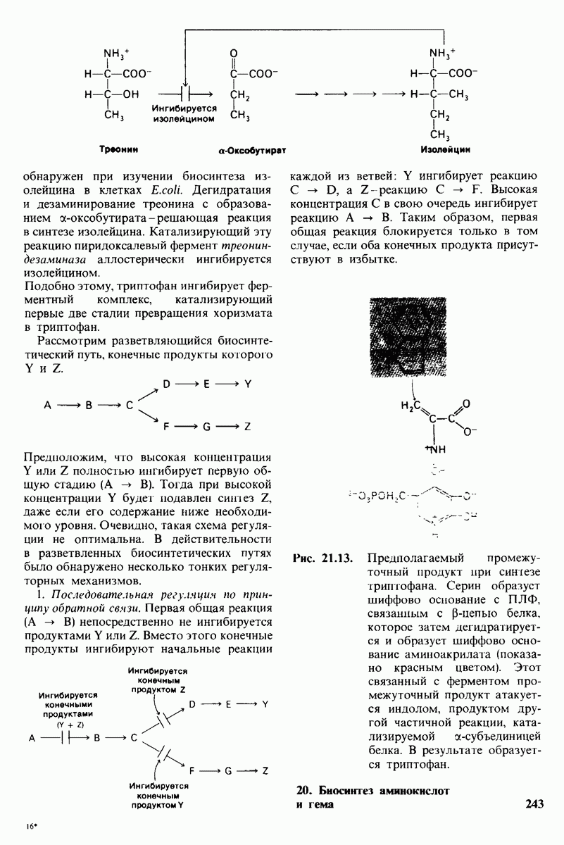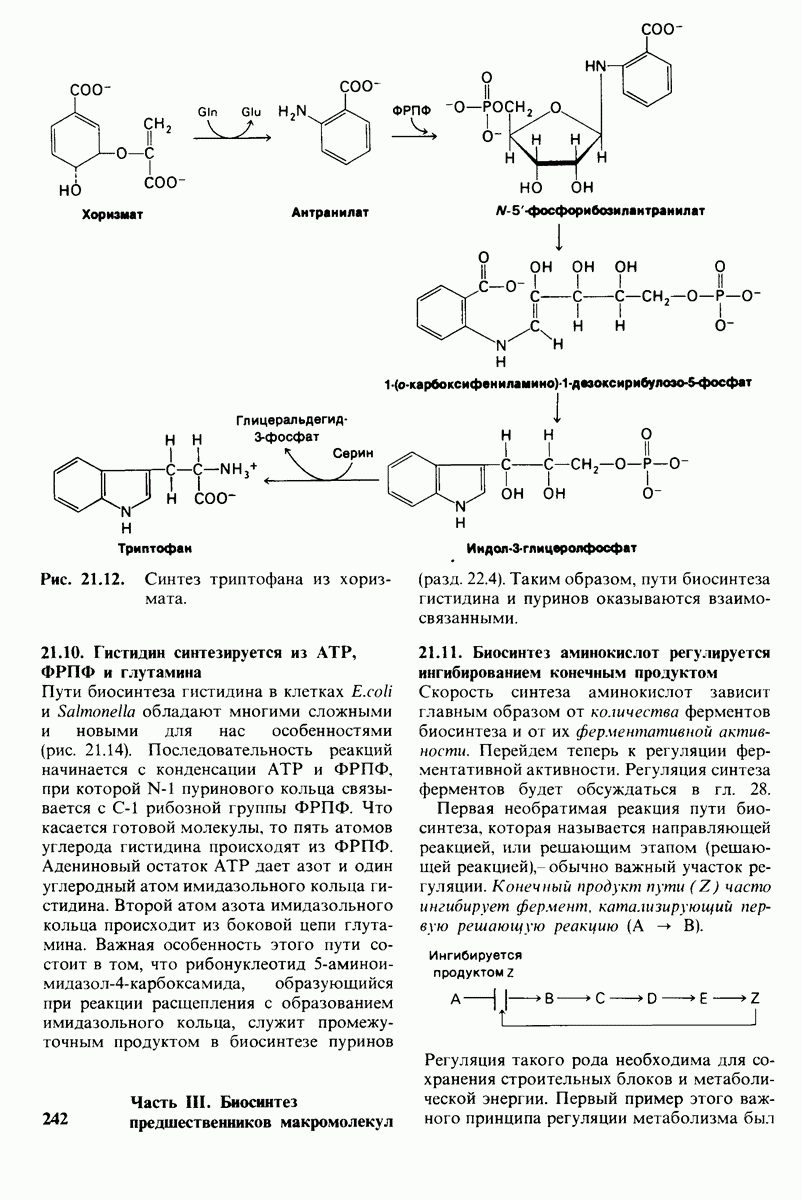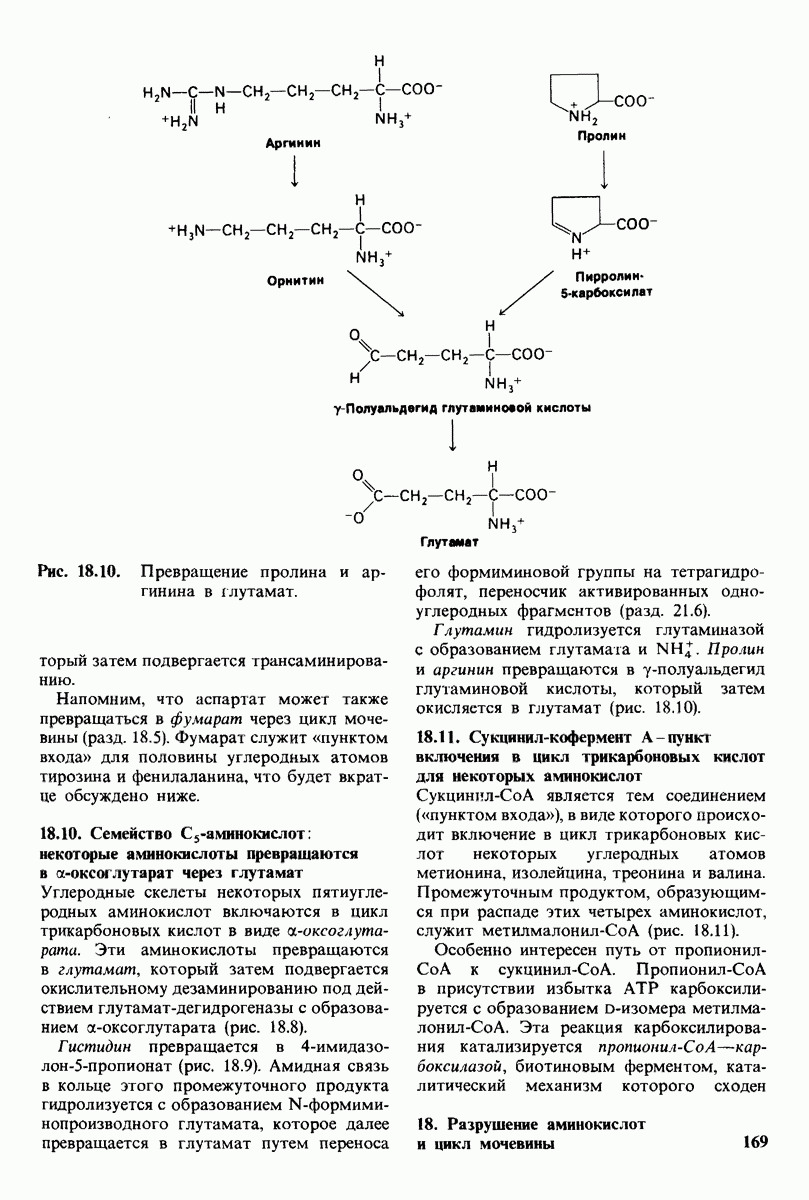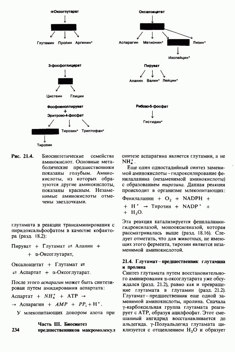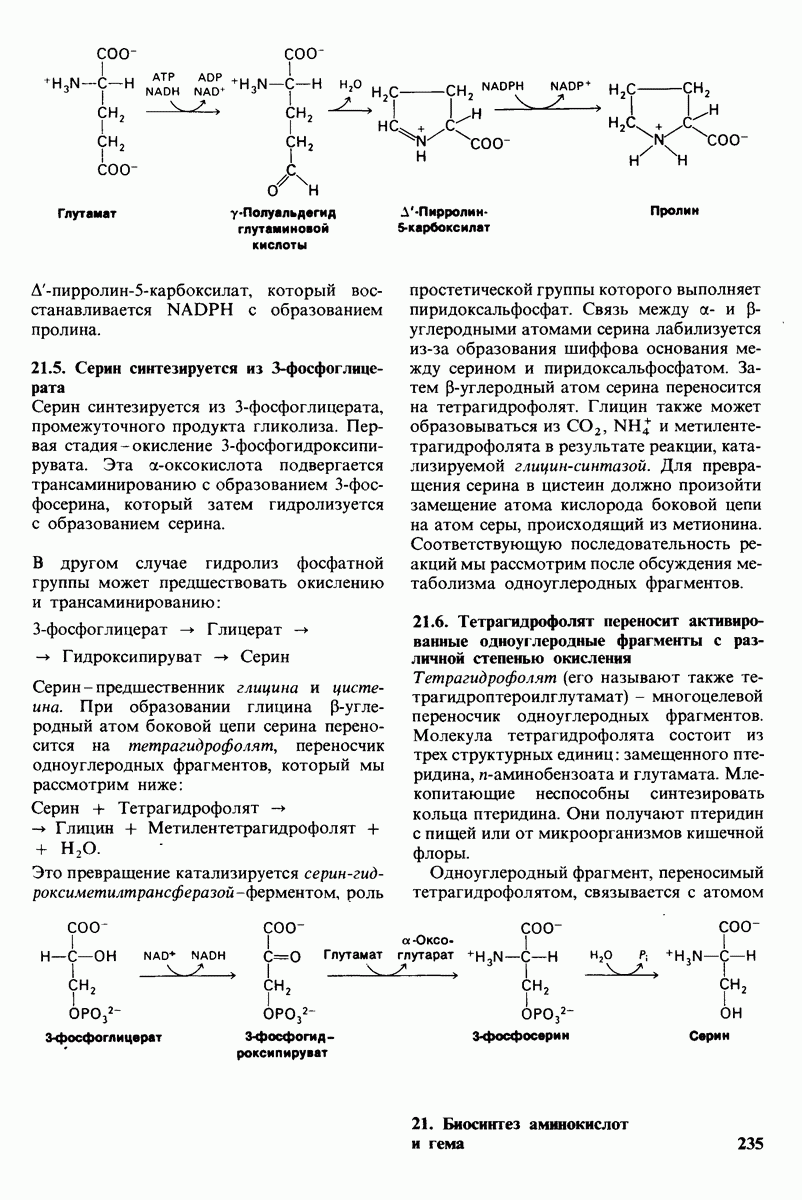 -оксоглутарата уже обсуждался (разд. 21.2), равно как и превращение глутамата в глутамин (разд. 21.2). Глутамат - предшественник еще одной заменимой аминокислоты, пролина. Сначала у-карбоксильная группа глутамата реагирует с АТР, образуя ацилфосфат. Этот смешанный ангидрид восстанавливается до альдегида. у-Полуальдегид глутамата циклизуется с отщеплением
