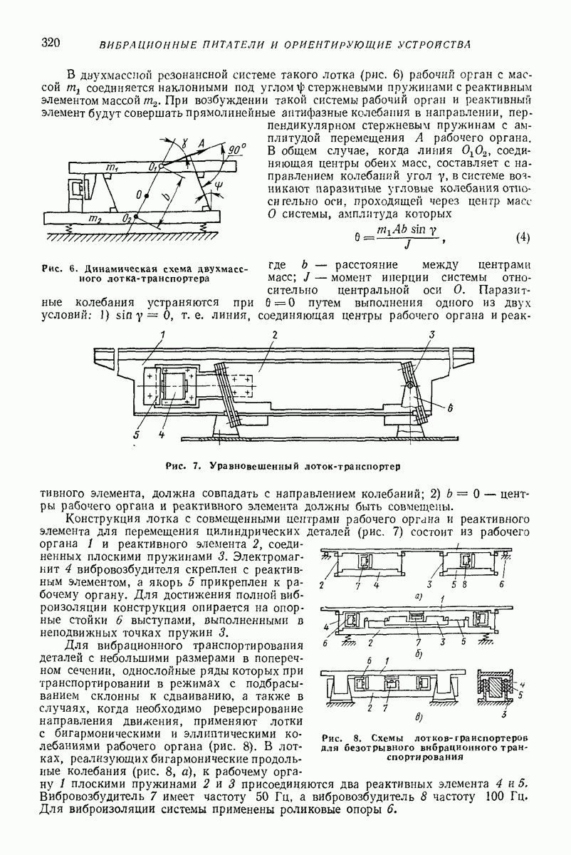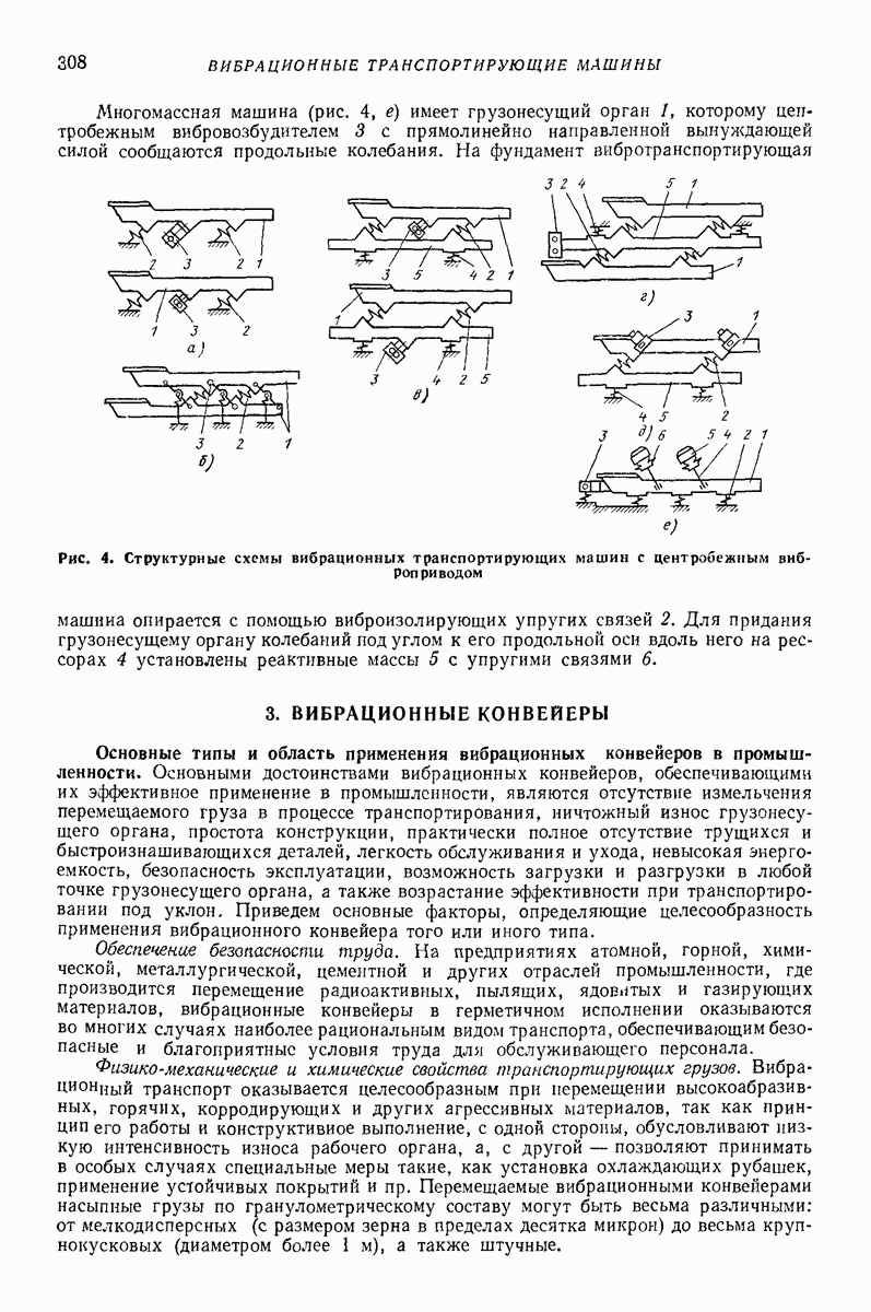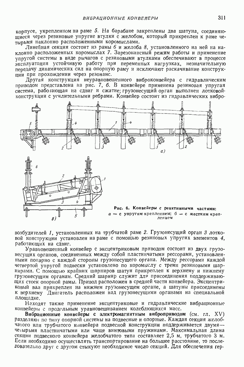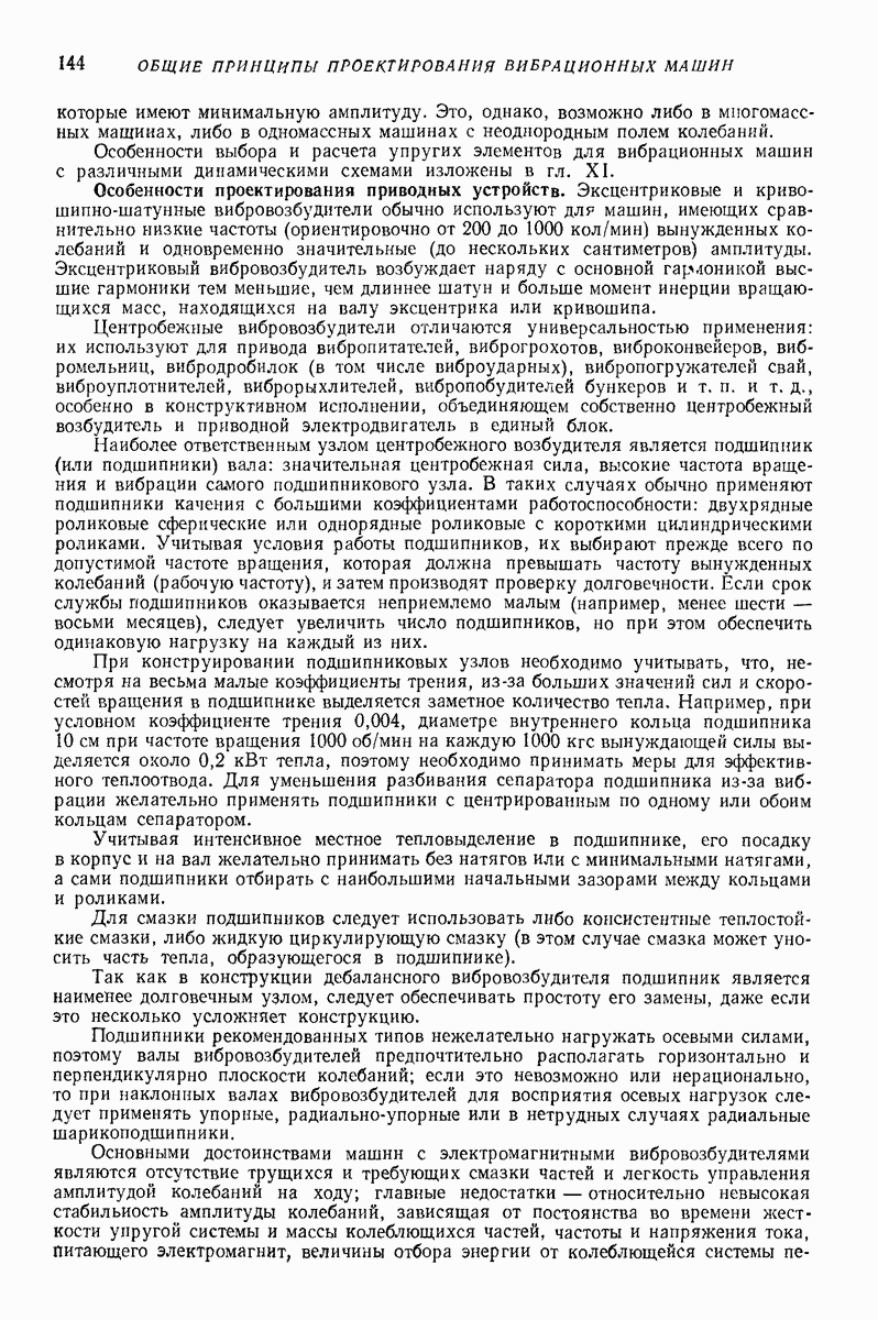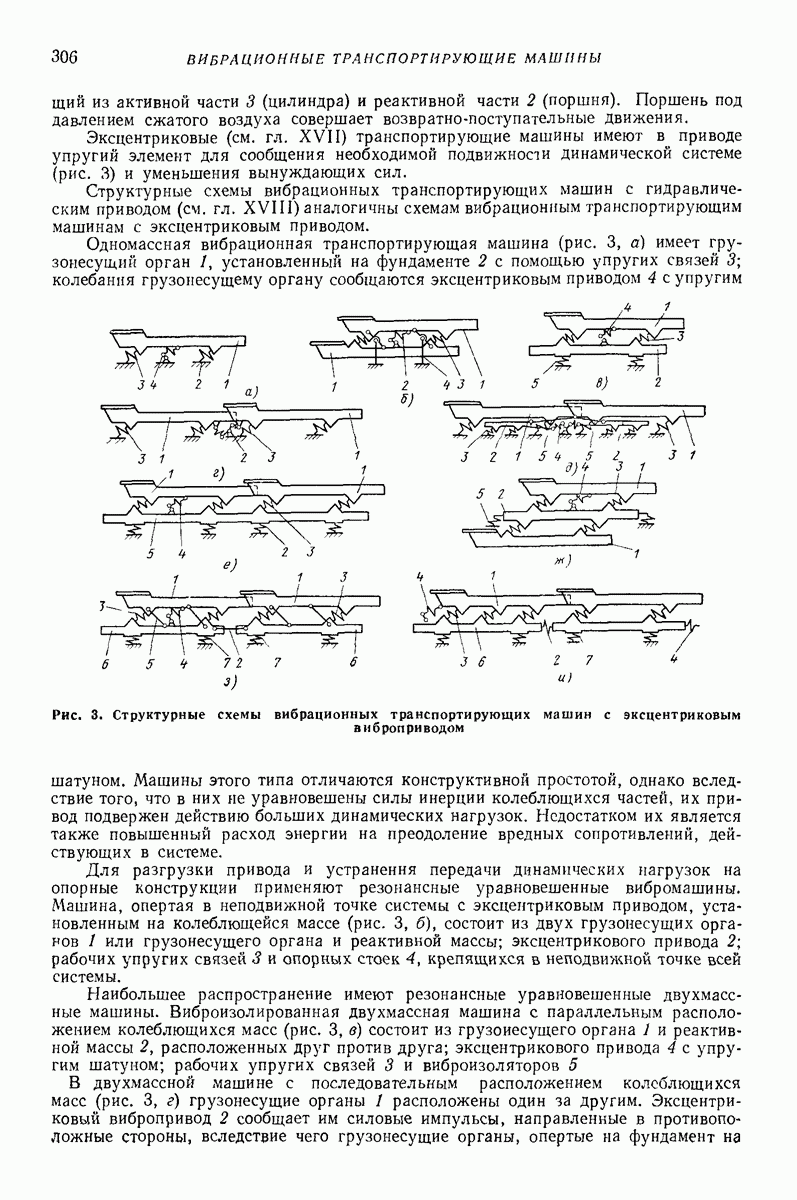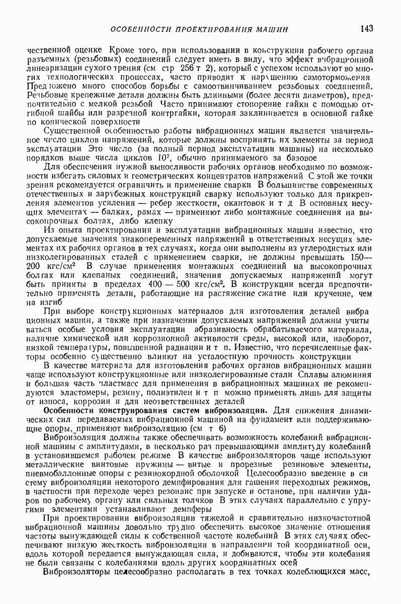 4. ОСОБЕННОСТИ ПРОЕКТИРОВАНИЯ МАШИНОдним из непременных условий успешной разработки и внедрения вибрационной машины является достаточно глубокая изученность соответствующего вибрационного процесса При этом должны быть известны если не оптимальные, то хотя бы приемлемые характер и параметры колебаний, обеспечивающие такое протекание процесса, при котором могут быть получены ощутимые технологические преимущества. При выборе параметров вибрационной машины должны приниматься во внимание пиковые и аварийные нагрузки, а также нагрузки в переходных нестационарных режимах Компоновка вибрационной машины в производственном помещении в совокупности с питающими, подводящими, отводящими и ограждающими устройствами должна допускать возможность кратковременных колебаний машины на внброизолирующих опорах с амплитудами, в несколько раз превышающими номинальные амплитуды колебаний в установившемся режиме (см гл X) В тех случаях, когда обрабатываемая среда или объект имеют массу, сопоставимую с массой рабочего органа машины, либо обладают значительным энергопоглощением, их необходимо тем или иным способом учитывать при анализе динамической схемы машины и расчете параметров колебаний [2, 11, 13, 14] Особенности проектирования рабочих органов машин. Рабочий орган вибрационной машины является узлом, который непосредственно передает вибрационное воздействие вызванное вибровозбудителями, обрабатываемой среде или объекту Форма и размеры рабочего органа определяются главным образом характером выполняемого машиной технологического процесса и заданной пронзьодительностью В общем случае рабочий орган представляет собой плоскую (деки концентрационных столов, сепараторов) или пространственную (коробы грохотов лотки конвейеров и питателей) металлоконструкции, либо массивное тело (бойки ударно вибрационных машин и т. п.) произвольной формы Основным требованием к конструкциям рабочих органов вибрационных машин (помимо чисто технологических) являются достаточная жесткость и уровень выносливости При достаточной жесткости обеспечиваются колебания рабочего органа с частотой вынуждающей силы как единого твердого тела и гарантируется отсутствие существенных дополнительных упругих колебаний рабочего органа, отдельных его элементов или участков (см также гл VII) Такие дополнительные упругие колебания рабочего органа возникают, как правило, на частоте вынуждающей силы или на кратных ей Вызывая дополнительные воздействия на обрабатываемую среду или объект, упругие колебания рабочего органа чаще нарушают нормальный ход технологического процесса и приводят, как правило, к появлению в элементах рабочего органа дополнительных знакопеременных напряжений Обычно необходимая жесткость рабочего органа достигается правильным выбором геометрических форм и размеров элементов, введением в конструкцию специальных элементов жесткости ребер, окантовок, поясов, распорок Число разъемных соединений должно быть по возможности минимальным Зачастую стремление сделать рабочий орган вибрационной машины универсальным сборно разборным (блочным) для быстрой переналадки или для унификации однотипных машин нескольких типоразмеров приводит к появлению большого числа разъемных соединений, в этих случаях жесткость рабочего органа существ