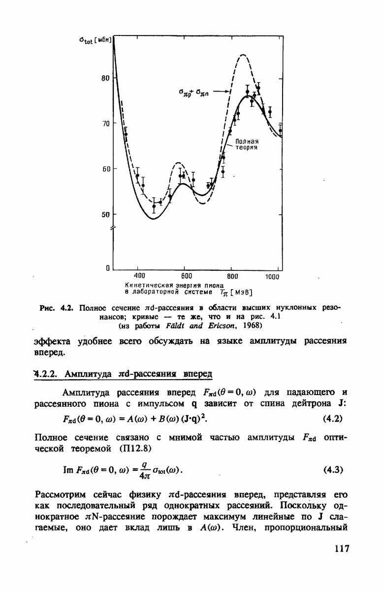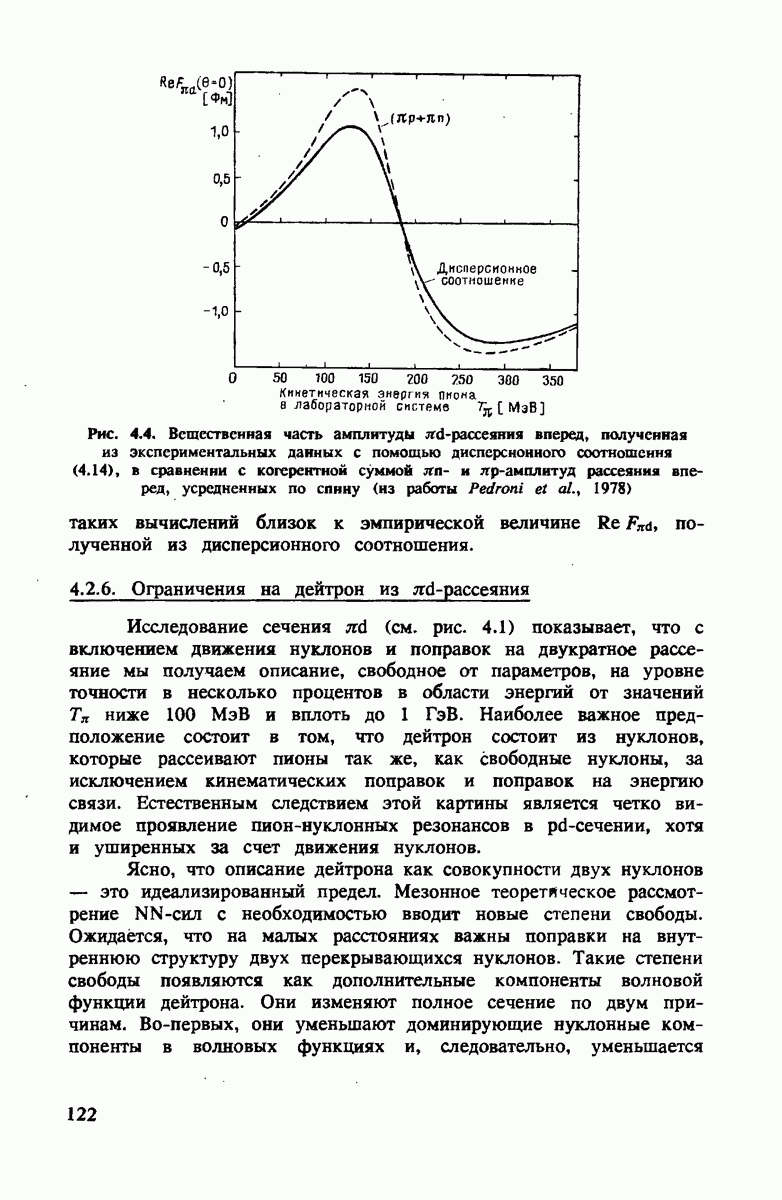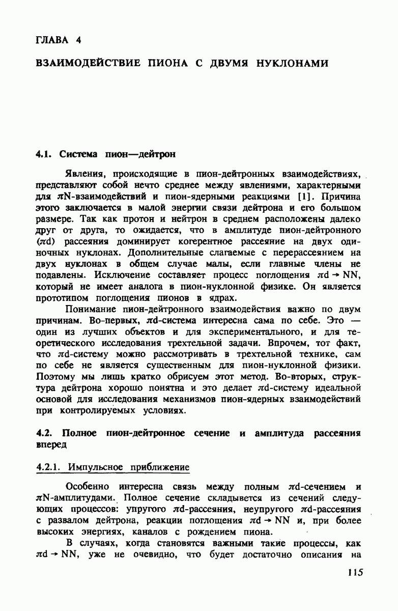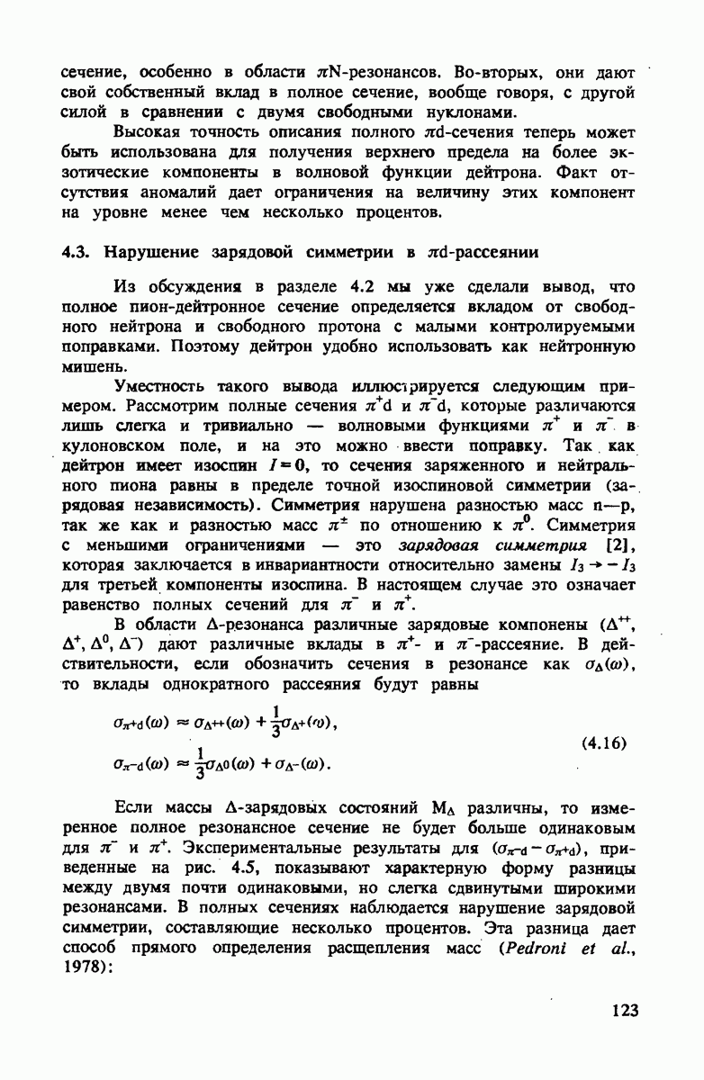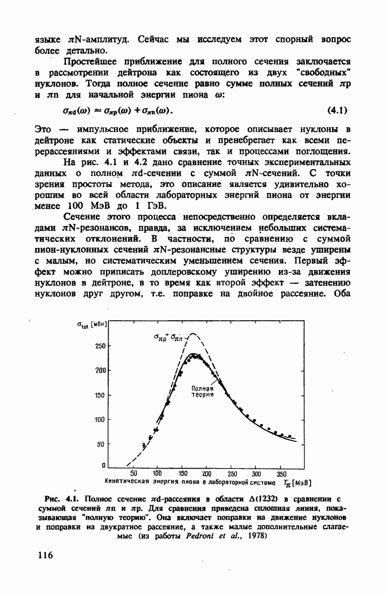 ниже 100 МэВ и вплоть до 1 ГэВ. Наиболее важное предположение состоит в том, что дейтрон состоит из нуклонов, которые рассеивают пионы так же, как свободные нуклоны, за исключением кинематических поправок и поправок на энергию связи. Естественным следствием этой картины является четко видимое проявление пион-нуклонных резонансов в