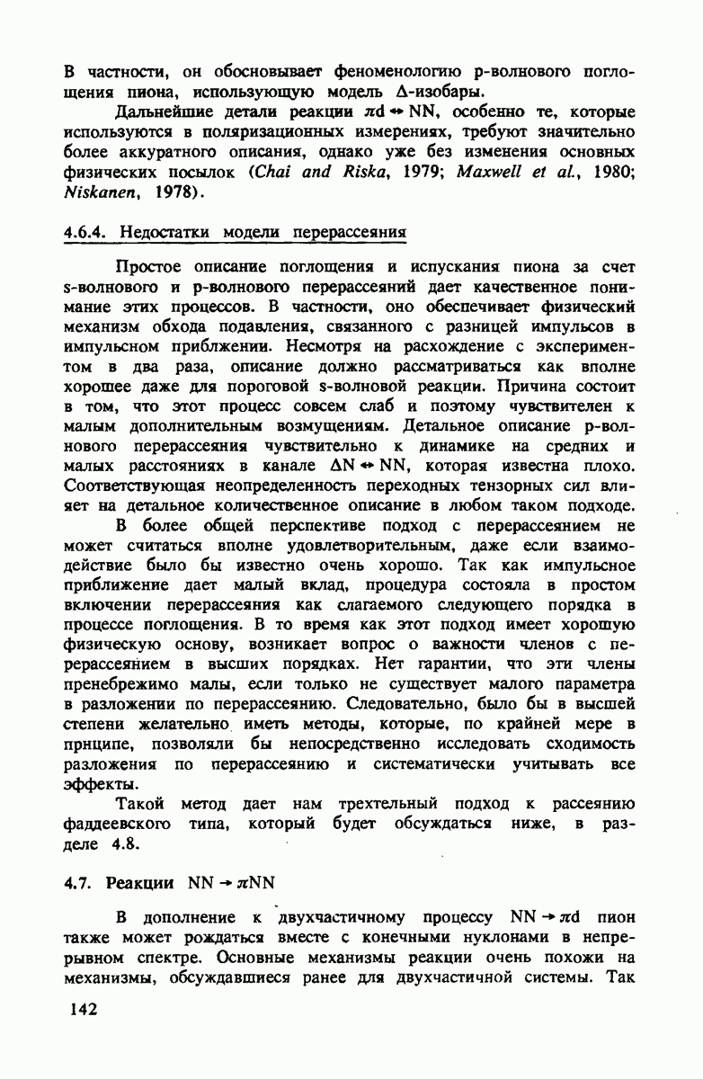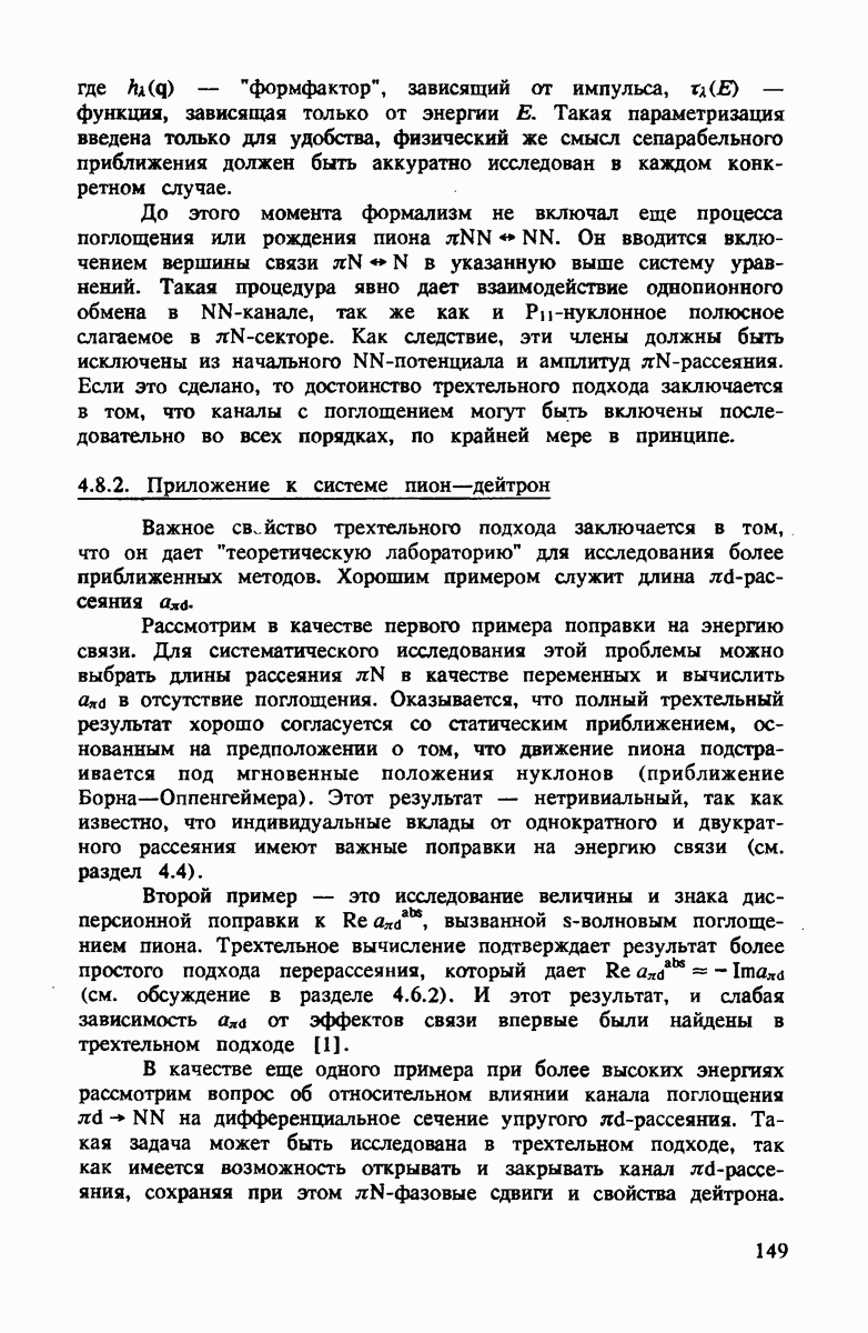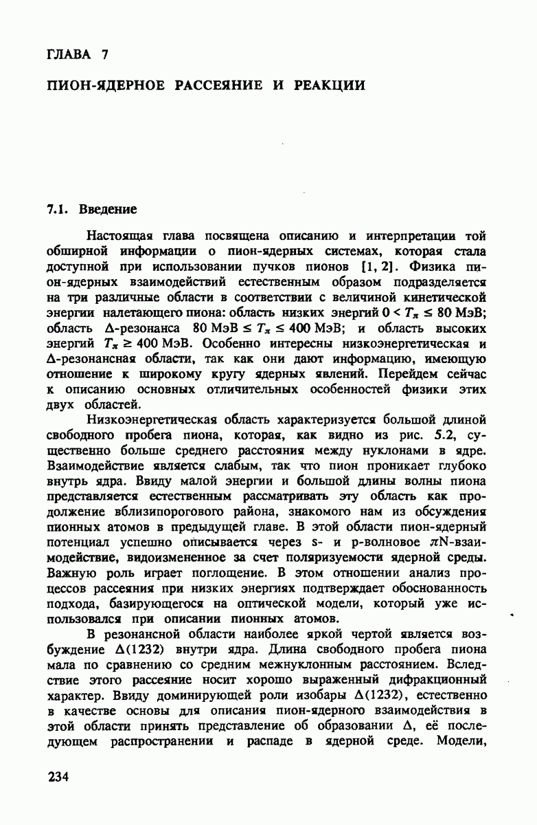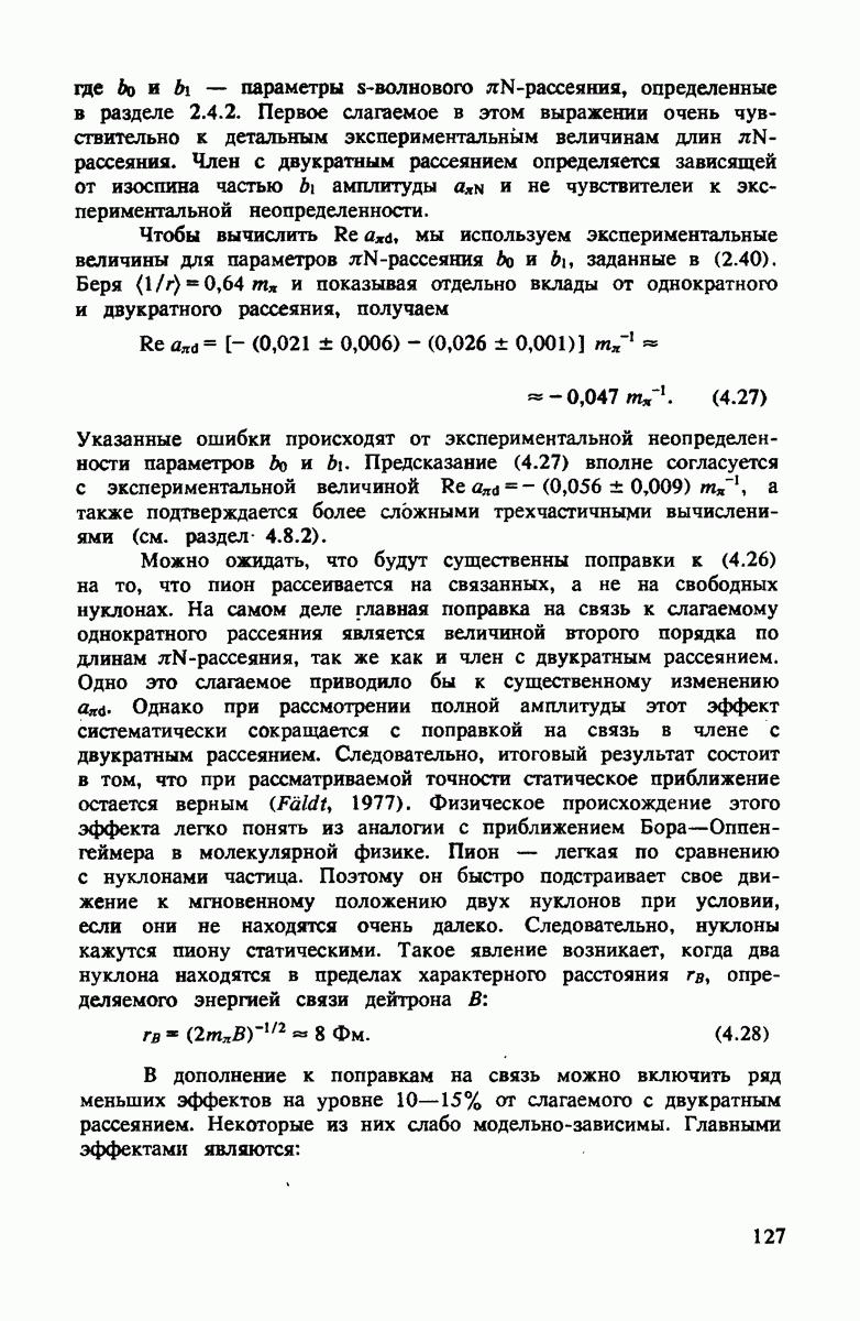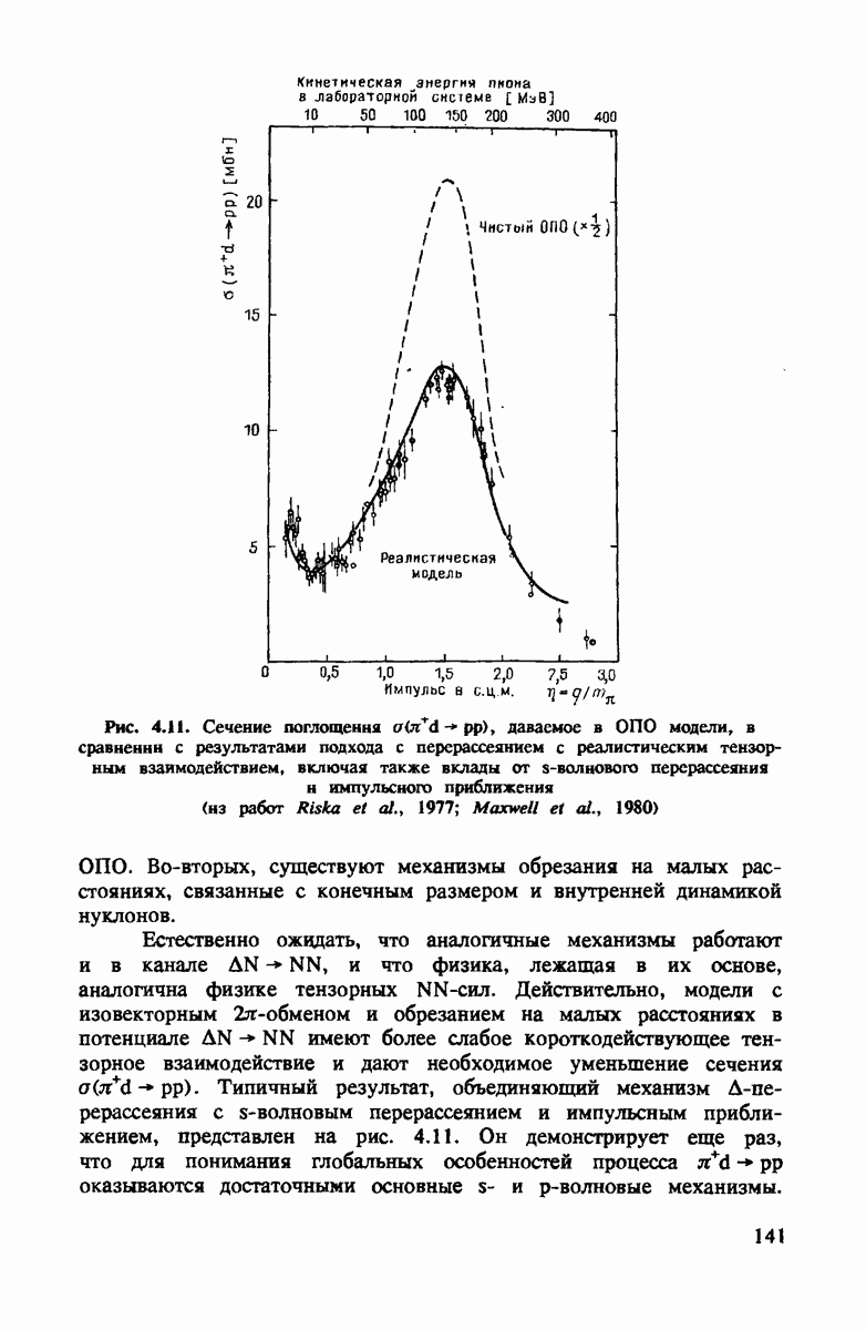 ниже 100 МэВ и вплоть до 1 ГэВ. Наиболее важное предположение состоит в том, что дейтрон состоит из нуклонов, которые рассеивают пионы так же, как свободные нуклоны, за исключением кинематических поправок и поправок на энергию связи. Естественным следствием этой картины является четко видимое проявление пион-нуклонных резонансов в