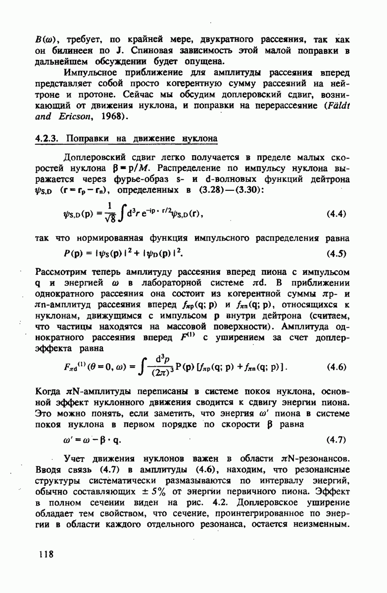 Импульсное приближение для амплитуды рассеяния вперед представляет собой просто когерентную сумму рассеяний на нейтроне и протоне. Сейчас мы обсудим доплеровский сдвиг, возникающий от движения нуклона, и поправки на перерассеяние (Faldt and Ericson, 1968).