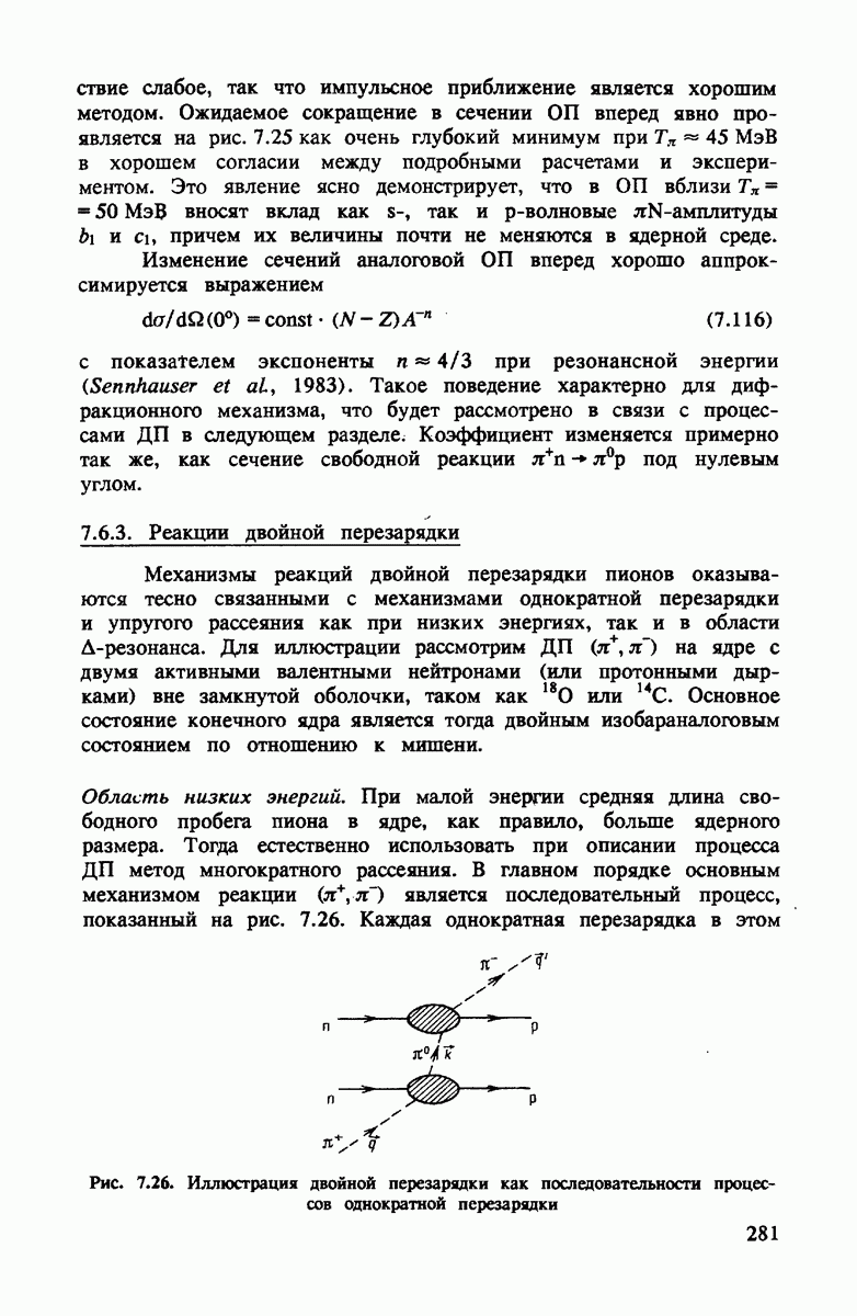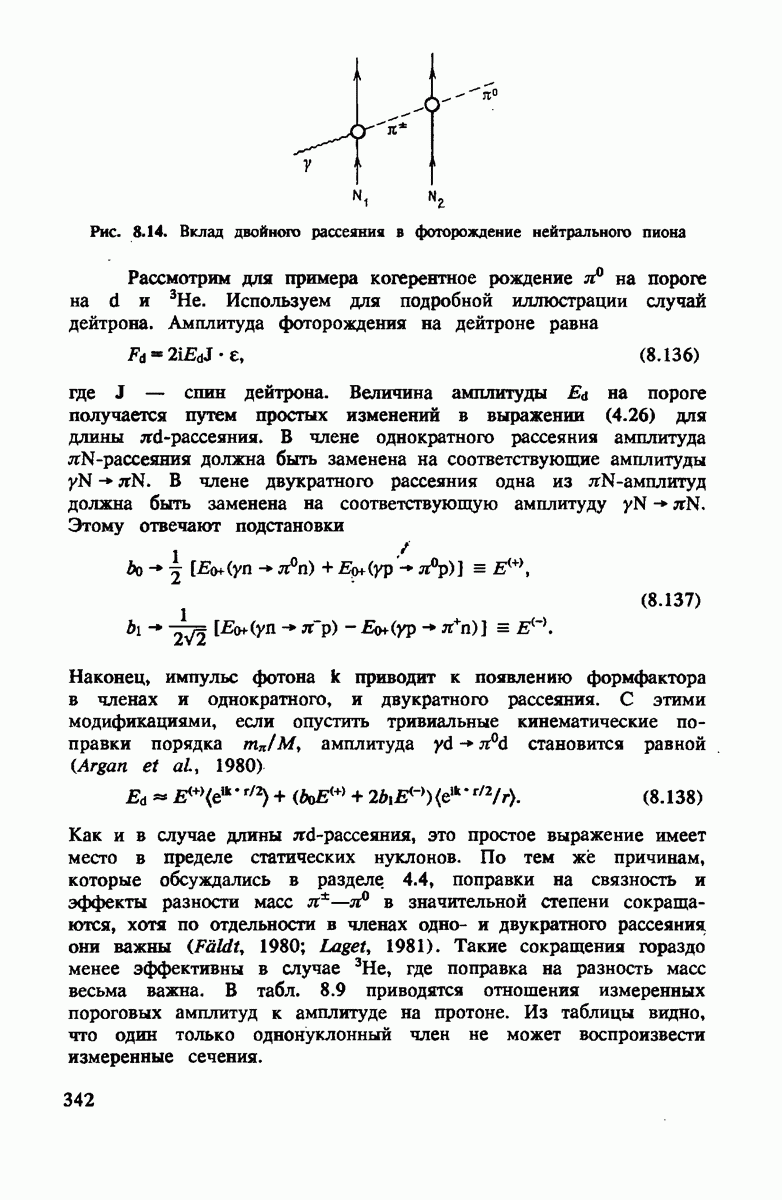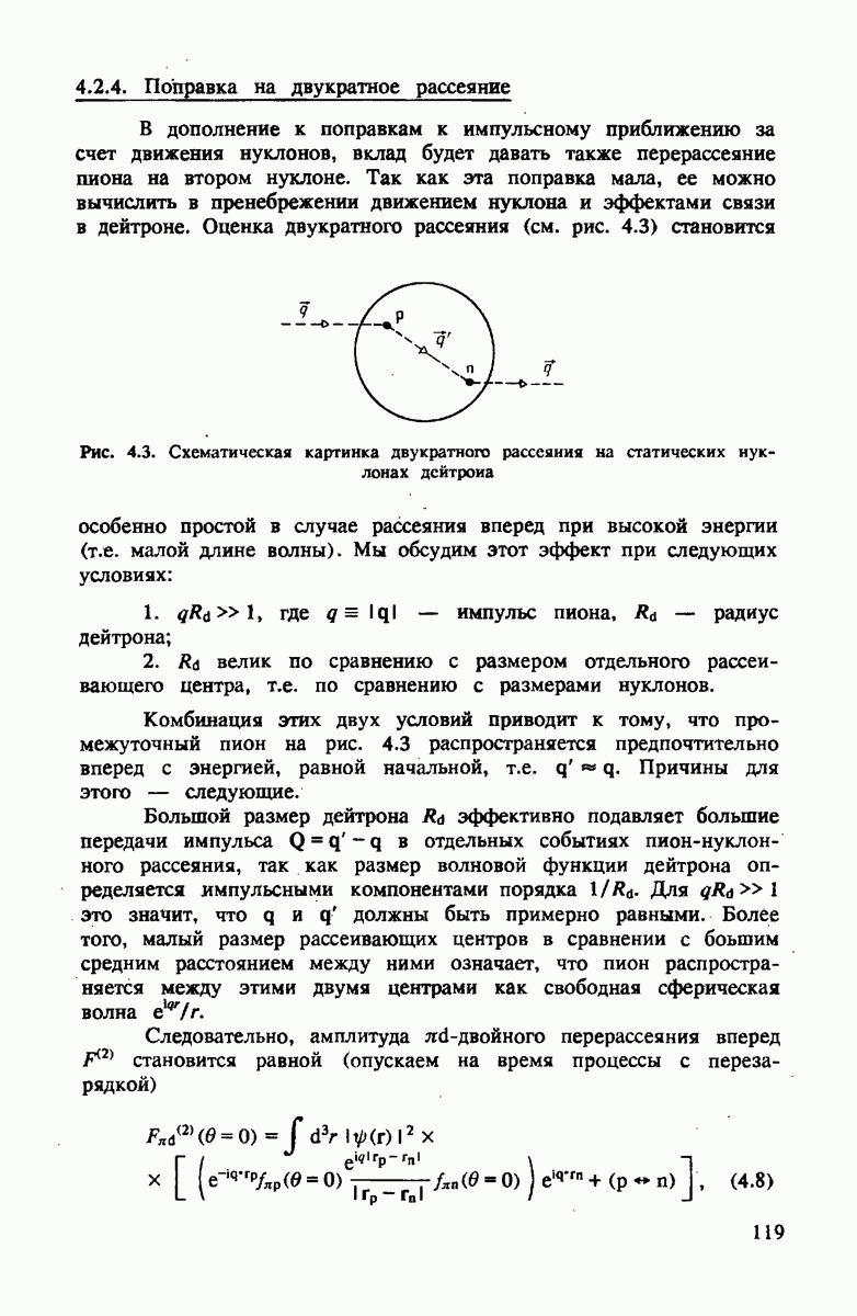 В дополнение к поправкам к импульсному приближению за счет движения нуклонов, вклад будет давать также перерассеяние пиона на втором нуклоне. Так как эта поправка мала, ее можно вычислить в пренебрежении движением нуклона и эффектами связи в дейтроне. Оценка двукратного рассеяния (см. рис. 4.3) становится особенно простой в случае рассеяния вперед при высокой энергии (т.е. малой длине волны).
