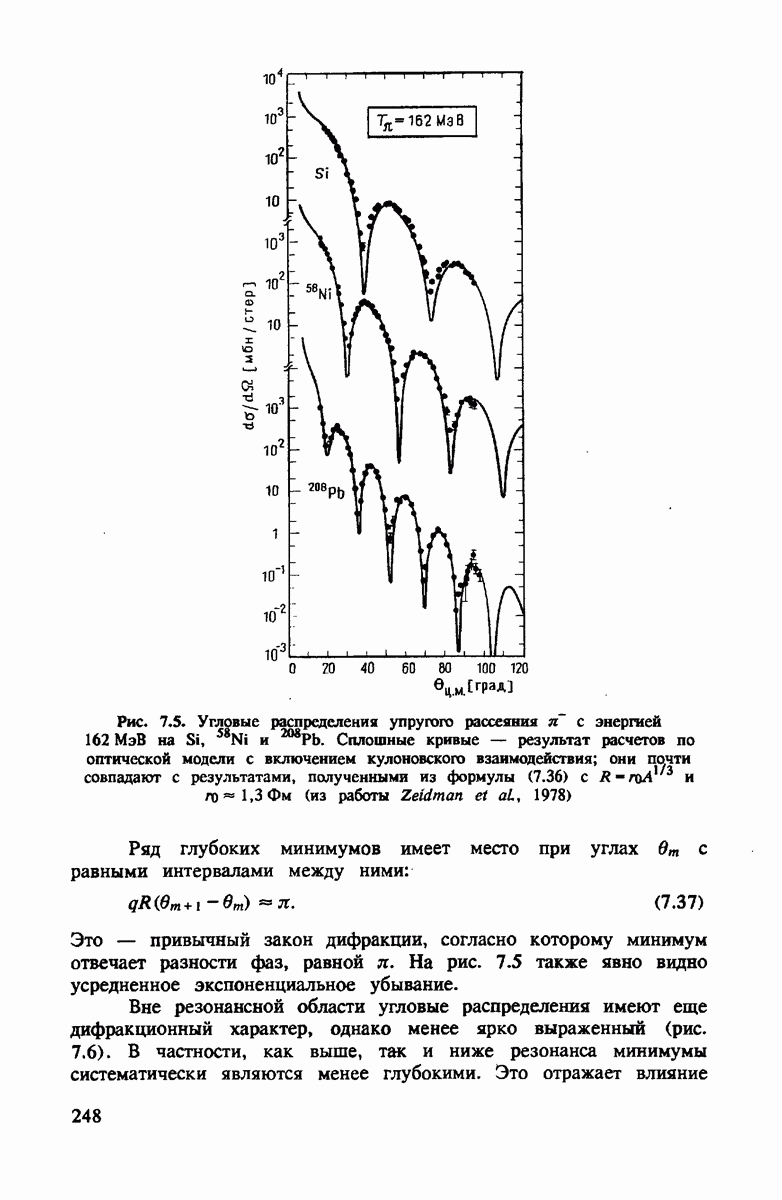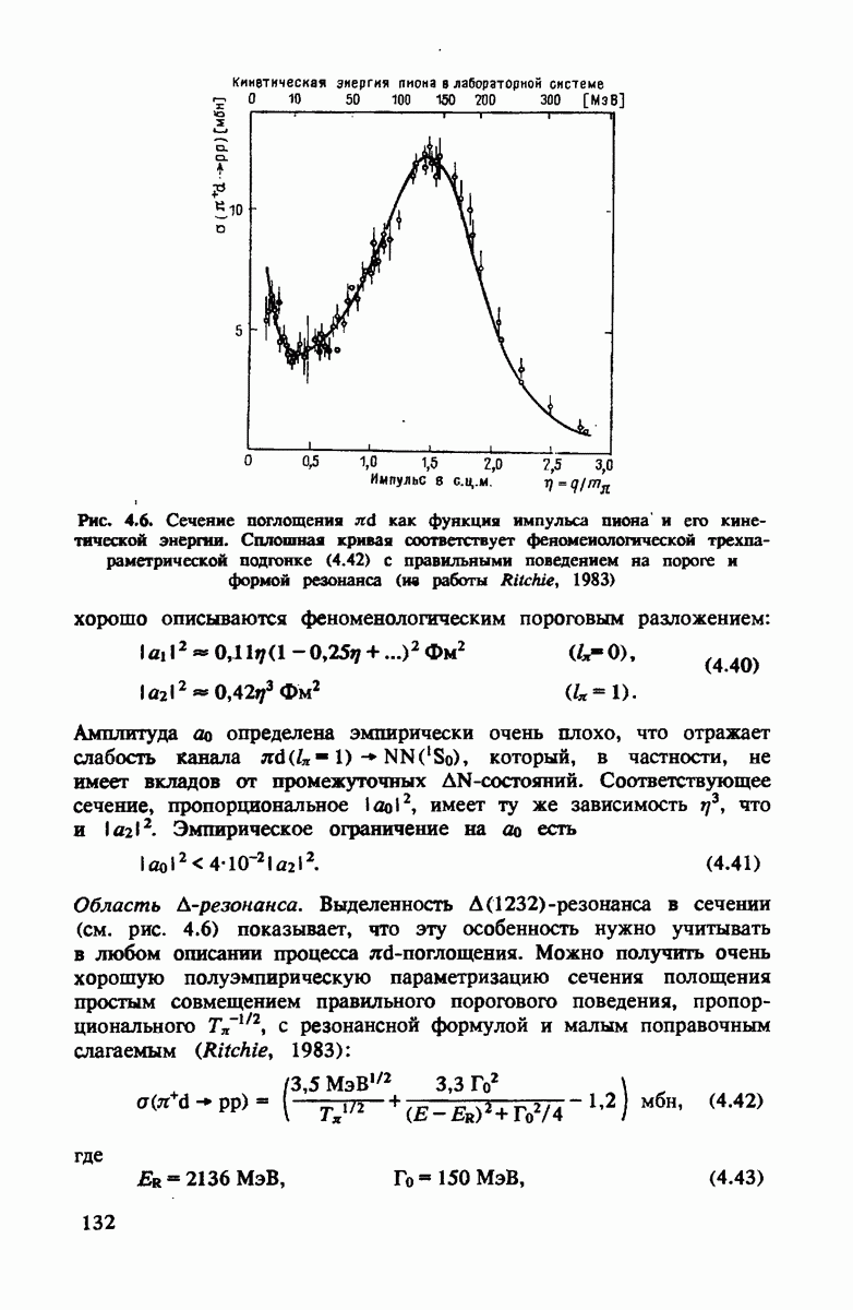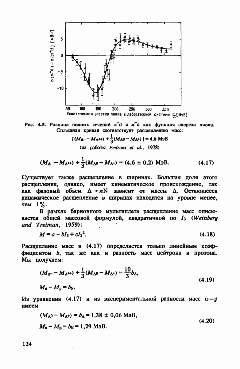 -резонансов. Вводя связь (4.7) в амплитуды (4.6), находим, что резонансные структуры систематически размазываются по интервалу энергий, обычно составляющих ±5% от энергии первичного пиона. Эффект в полном сечении виден на рис. 4.2. Доплеровское уширение обладает тем свойством, что сечение, проинтегрированное по энергии в области каждого отдельного резонанса, остается неизменным.