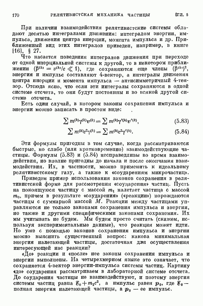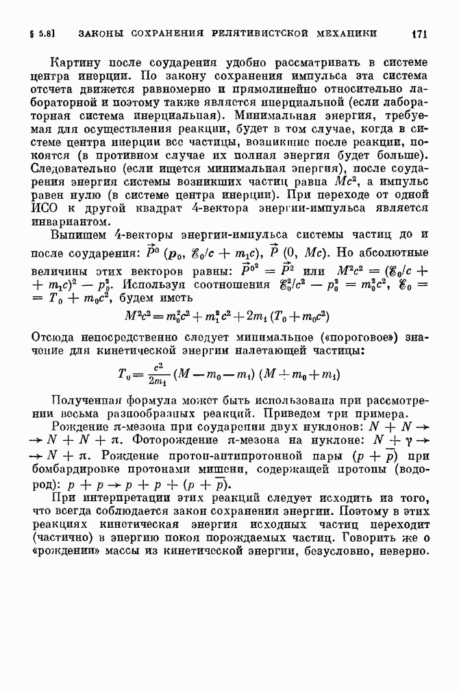 Эти формулы пригодны в том случае, когда рассматриваются быстрые, но слабо (или кратковременно) взаимодействующие частицы. Формулы (5.83) и (5.84) несправедливы во время взаимодействия, но вполне пригодны до начала и после окончания взаимодействия. Их, в частности, можно применить к идеальному релятивистскому газу, а также к «соударениям микрочастиц». Приведем пример использования законов сохранения в релятивистской форме для рассмотрения «соударепия» частиц. Пусть на покоящуюся частицу с массой налетает частица с массой «До» реакции и «после» нее законы сохранения импульса и энергии выполнены. На четырехмерном языке это означает, что сохраняется 4-вектор энергии-импульса системы частиц. Картину «до» соударения рассматриваем в лабораторной системе отсчета. До соударения частицы не взаимодействуют, и поэтому энергия системы частиц равна Картину после соударения удобно рассматривать в системе центра инерции. По закону сохранения импульса эта система отсчета движется равномерно и прямолинейно относительно лабораторной и поэтому также является инерциальной (если лабораторная система инерциальная). Минимальная энергия, требуемая для осуществления реакции, будет в том случае, когда в системе центра инерции все частицы, возникшие после реакции, покоятся (в противном случае их полная энергия будет больше). Следовательно (если ищется минимальная эпергия), после соударения энергия системы возникших частиц равна Выпишем 4-векторы энергии-имнульса системы частиц до и после соударения: