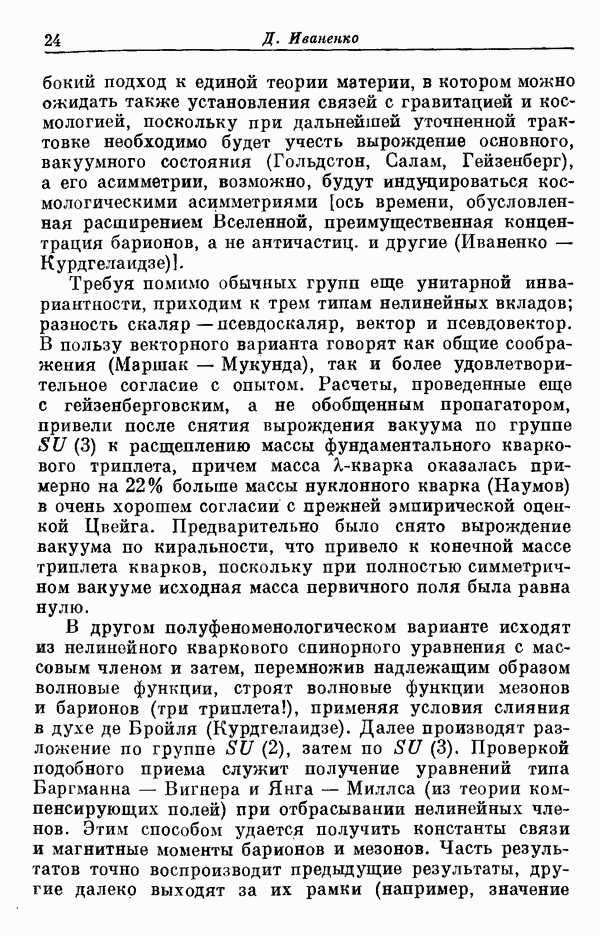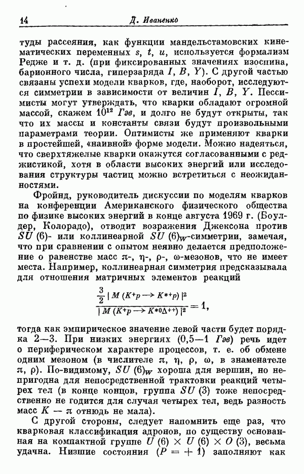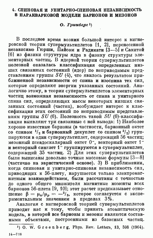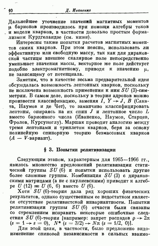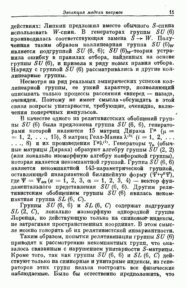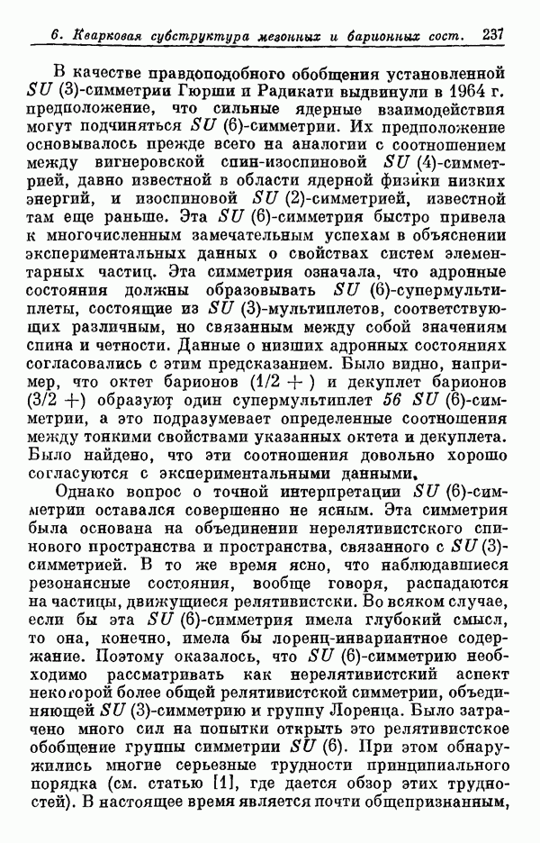 Однако вопрос о точной интерпретации -симметрии оставался совершенно не ясным. Эта симметрия была основана на объединении нерелятивистского спинового пространства и пространства, связанного с -симметрией. В то же время ясно, что наблюдавшиеся резонансные состояния, вообще говоря, распадаются на частицы, движущиеся релятивистски. Во всяком случае, если бы эта -симметрия имела глубокий смысл, то она, конечно, имела бы лоренц-инвариантное содержание. Поэтому оказалось, что -симметрию необходимо рассматривать как нерелятивистский аспект некоторой более общей релятивистской симметрии, объединяющей -симметрию и группу Лоренца. Было затрачено много сил на попытки открыть это релятивистское обобщение группы симметрии При этом обнаружились многие серьезные трудности принципиального порядка (см. статью [1], где дается обзор этих трудностей). В настоящее время является почти общепризнанным,