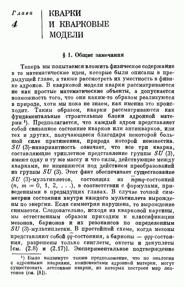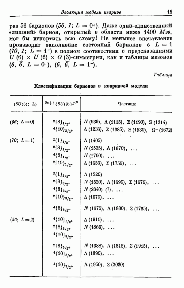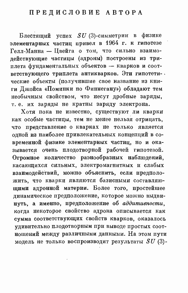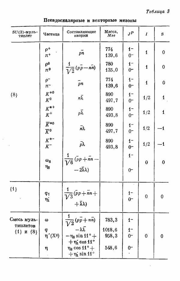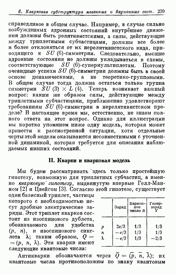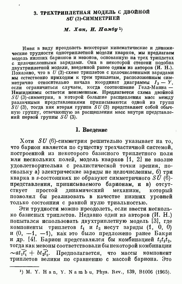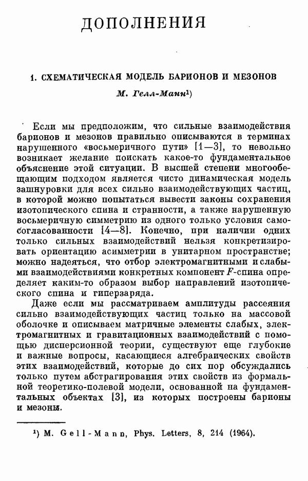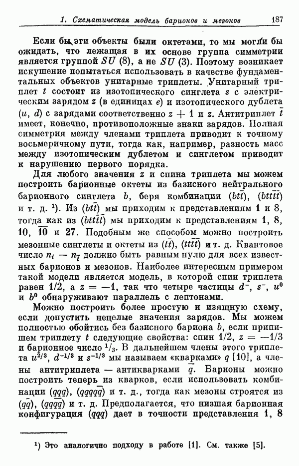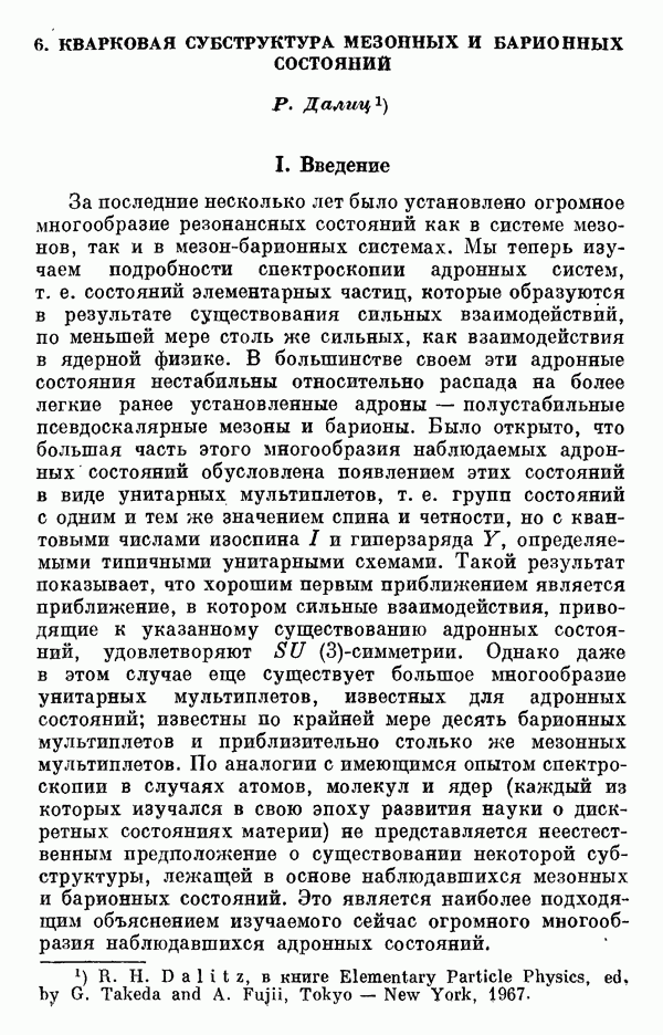 За последние несколько лет было установлено огромное многообразие резонансных состояний как в системе мезонов, так и в мезон-барионных системах. Мы теперь изучаем подробности спектроскопии адронных систем, т. е. состояний элементарных частиц, которые образуются в результате существования сильных взаимодействий, по меньшей мере столь же сильных, как взаимодействия в ядерной физике. В большинстве своем эти адронные состояния нестабильны относительно распада на более легкие ранее установленные адроны — полустабильные псевдоскалярные мезоны и барионы. Было открыто, что большая часть этого многообразия наблюдаемых адронных состояний обусловлена появлением этих состояний в виде унитарных мультиплетов, т. е. групп состояний с одним и тем же значением спина и четности, но с квантовыми числами изоспина I и гиперзаряда Y, определяемыми типичными унитарными схемами. Такой результат показывает, что хорошим первым приближением является приближение, в котором сильные взаимодействия, приводящие к указанному существованию адронных состояний, удовлетворяют -симметрии. Однако даже в этом случае еще существует большое многообразие унитарных мультиплетов, известных для адронных состояний; известны по крайней мере десять барионных мультиплетов и приблизительно столько же мезонных мультиплетов. По аналогии с имеющимся опытом спектроскопии в случаях атомов, молекул и ядер (каждый из которых изучался в свою эпоху развития науки о дискретных состояниях материи) не представляется неестественным предположение о существовании некоторой субструктуры, лежащей в основе наблюдавшихся мезонных и барионных состояний. Это является наиболее подходящим объяснением изучаемого сейчас огромного многообразия наблюдавшихся адронных состояний.