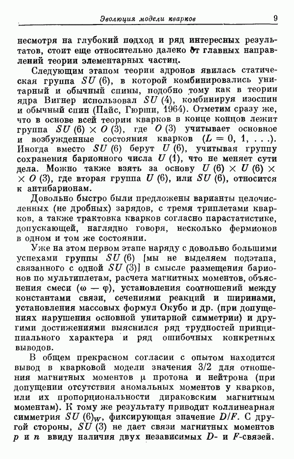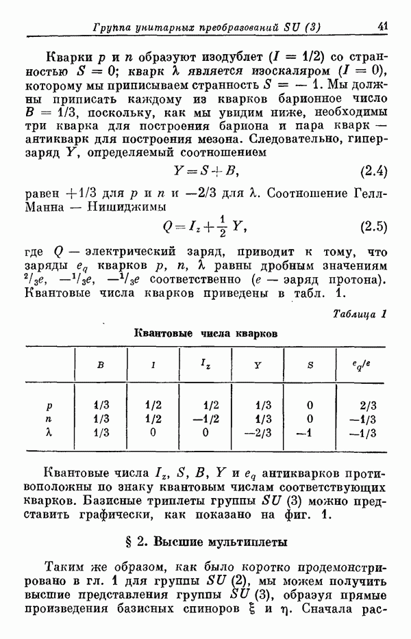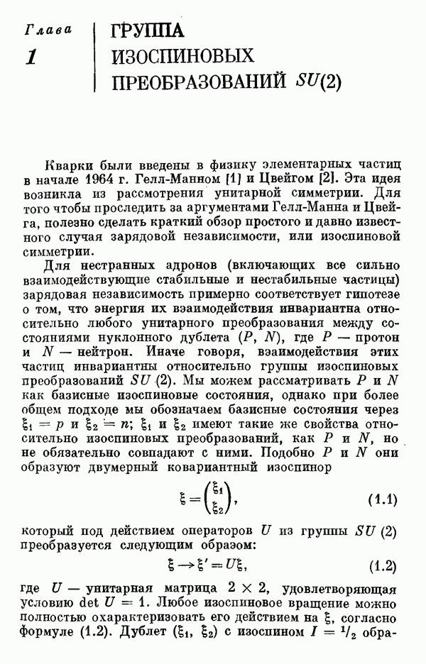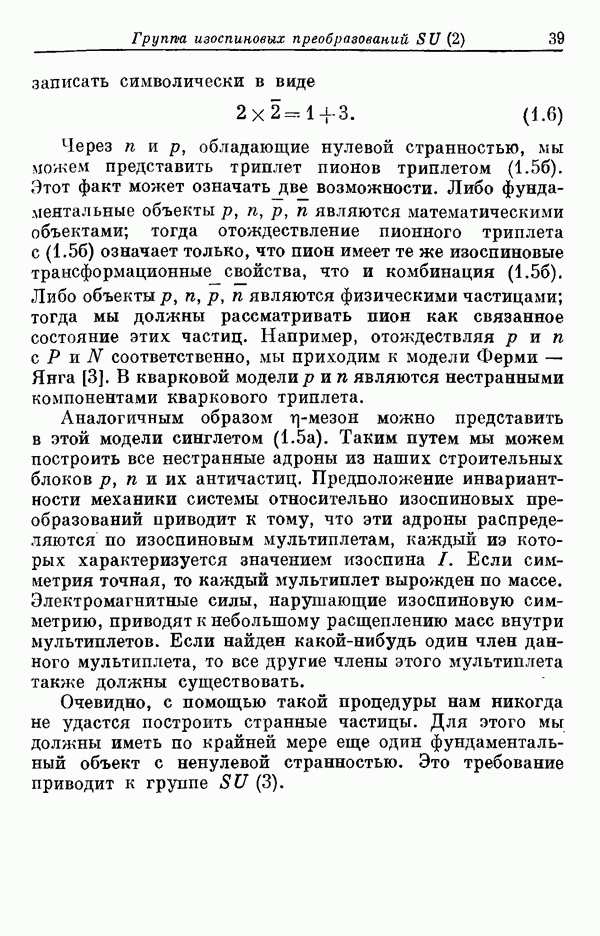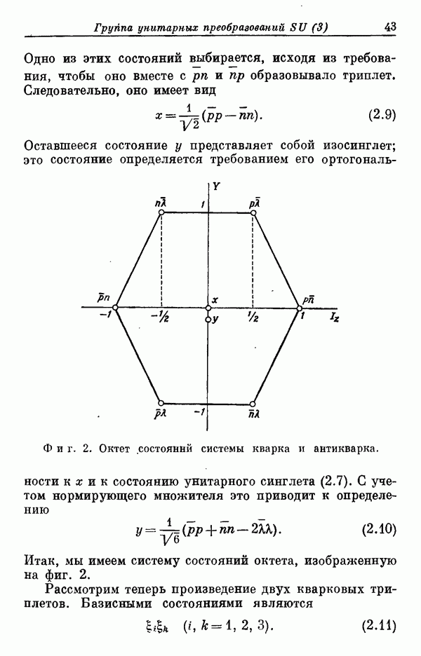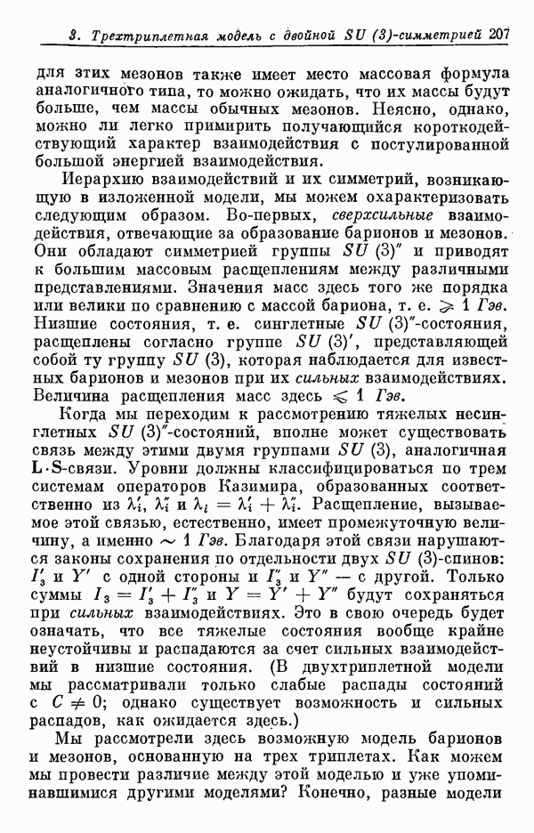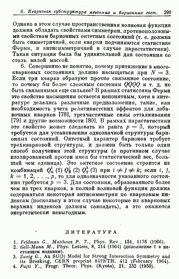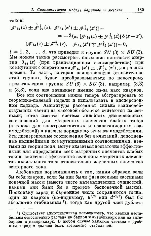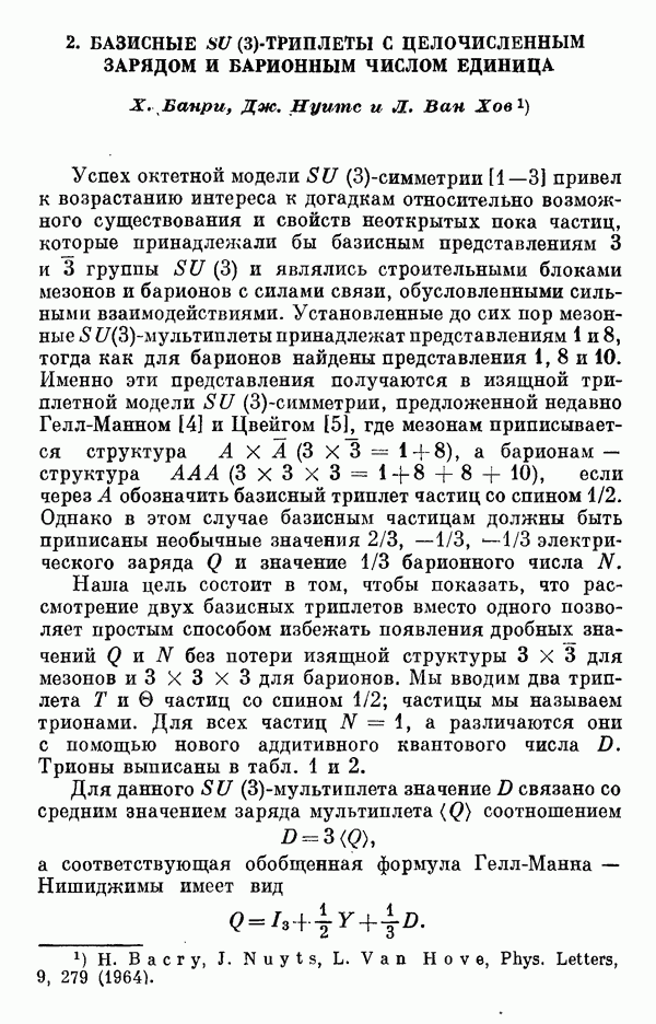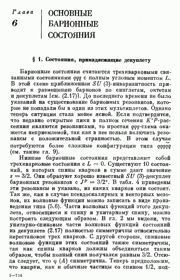За последние несколько лет было установлено огромное многообразие резонансных состояний как в системе мезонов, так и в мезон-барионных системах. Мы теперь изучаем подробности спектроскопии адронных систем, т. е. состояний элементарных частиц, которые образуются в результате существования сильных взаимодействий, по меньшей мере столь же сильных, как взаимодействия в ядерной физике. В большинстве своем эти адронные состояния нестабильны относительно распада на более легкие ранее установленные адроны — полустабильные псевдоскалярные мезоны и барионы. Было открыто, что большая часть этого многообразия наблюдаемых адронных состояний обусловлена появлением этих состояний в виде унитарных мультиплетов, т. е. групп состояний с одним и тем же значением спина и четности, но с квантовыми числами изоспина I и гиперзаряда Y, определяемыми типичными унитарными схемами. Такой результат показывает, что хорошим первым приближением является приближение, в котором сильные взаимодействия, приводящие к указанному существованию адронных состояний, удовлетворяют -симметрии. Однако даже в этом случае еще существует большое многообразие унитарных мультиплетов, известных для адронных состояний; известны по крайней мере десять барионных мультиплетов и приблизительно столько же мезонных мультиплетов. По аналогии с имеющимся опытом спектроскопии в случаях атомов, молекул и ядер (каждый из которых изучался в свою эпоху развития науки о дискретных состояниях материи) не представляется неестественным предположение о существовании некоторой субструктуры, лежащей в основе наблюдавшихся мезонных и барионных состояний. Это является наиболее подходящим объяснением изучаемого сейчас огромного многообразия наблюдавшихся адронных состояний.