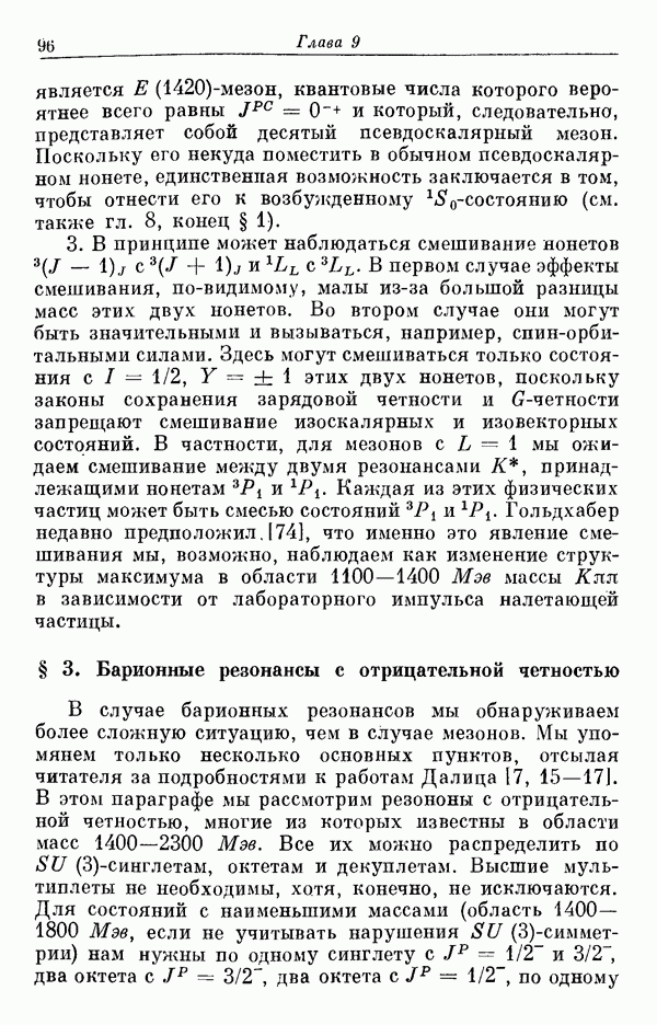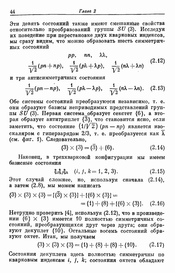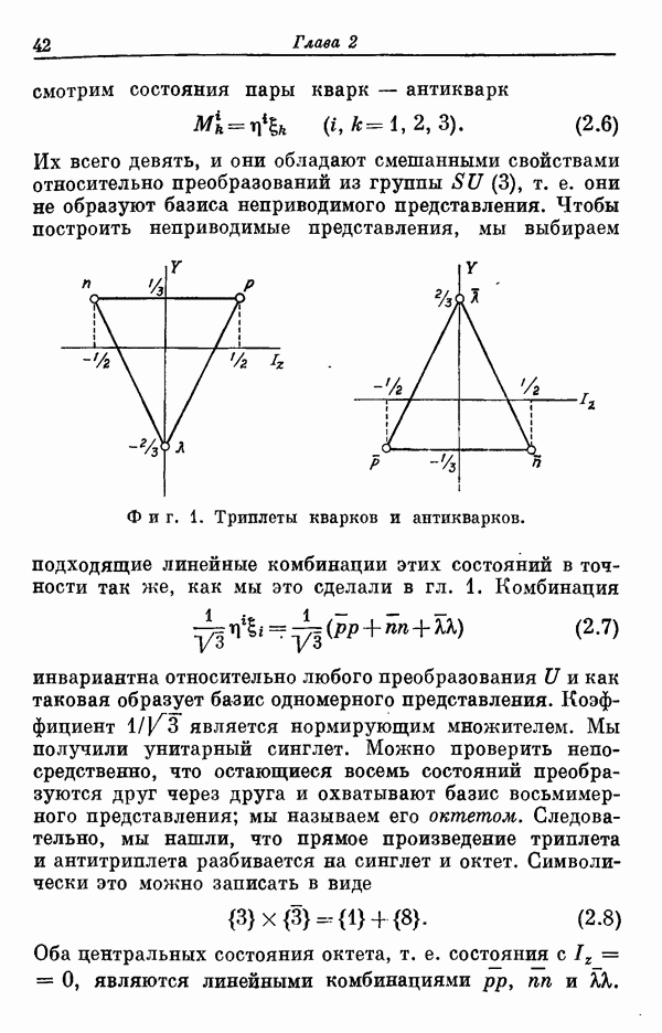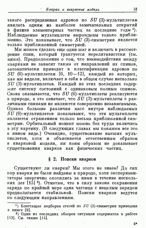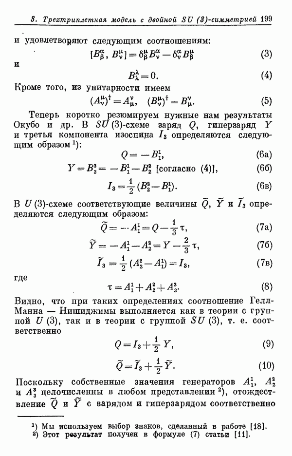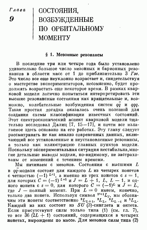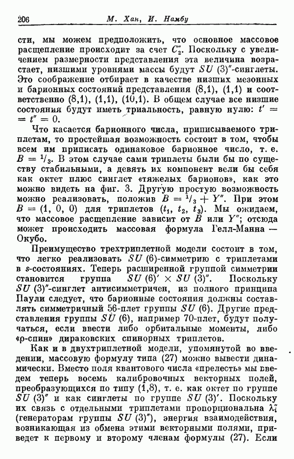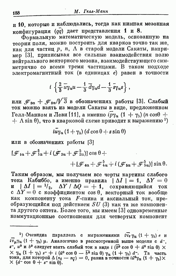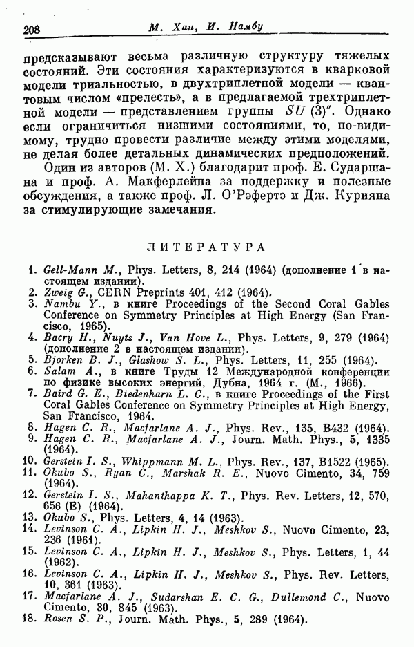 За последние несколько лет было установлено огромное многообразие резонансных состояний как в системе мезонов, так и в мезон-барионных системах. Мы теперь изучаем подробности спектроскопии адронных систем, т. е. состояний элементарных частиц, которые образуются в результате существования сильных взаимодействий, по меньшей мере столь же сильных, как взаимодействия в ядерной физике. В большинстве своем эти адронные состояния нестабильны относительно распада на более легкие ранее установленные адроны — полустабильные псевдоскалярные мезоны и барионы. Было открыто, что большая часть этого многообразия наблюдаемых адронных состояний обусловлена появлением этих состояний в виде унитарных мультиплетов, т. е. групп состояний с одним и тем же значением спина и четности, но с квантовыми числами изоспина I и гиперзаряда Y, определяемыми типичными унитарными схемами. Такой результат показывает, что хорошим первым приближением является приближение, в котором сильные взаимодействия, приводящие к указанному существованию адронных состояний, удовлетворяют -симметрии. Однако даже в этом случае еще существует большое многообразие унитарных мультиплетов, известных для адронных состояний; известны по крайней мере десять барионных мультиплетов и приблизительно столько же мезонных мультиплетов. По аналогии с имеющимся опытом спектроскопии в случаях атомов, молекул и ядер (каждый из которых изучался в свою эпоху развития науки о дискретных состояниях материи) не представляется неестественным предположение о существовании некоторой субструктуры, лежащей в основе наблюдавшихся мезонных и барионных состояний. Это является наиболее подходящим объяснением изучаемого сейчас огромного многообразия наблюдавшихся адронных состояний.