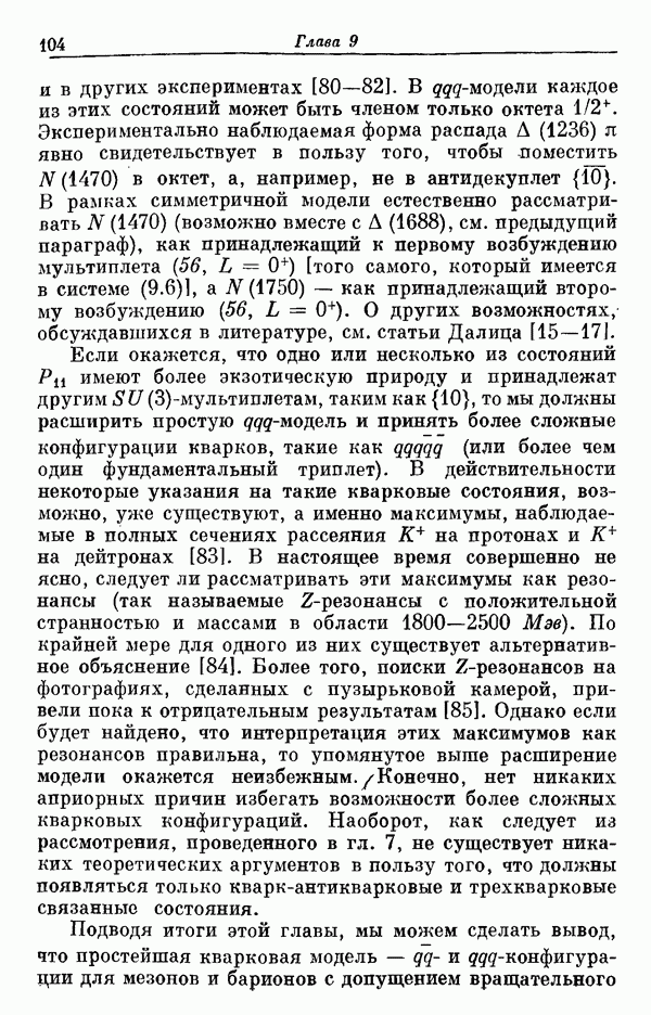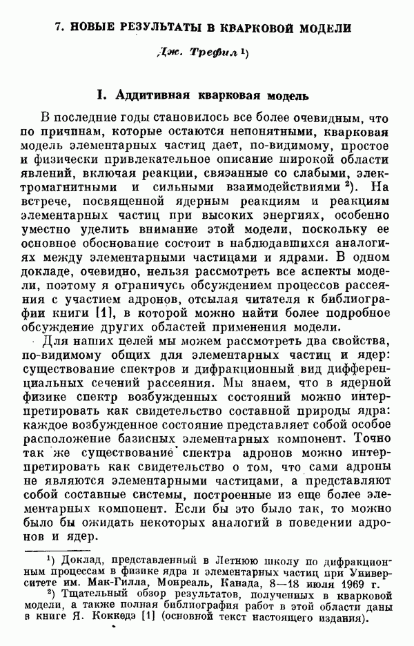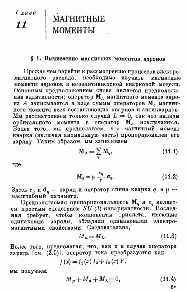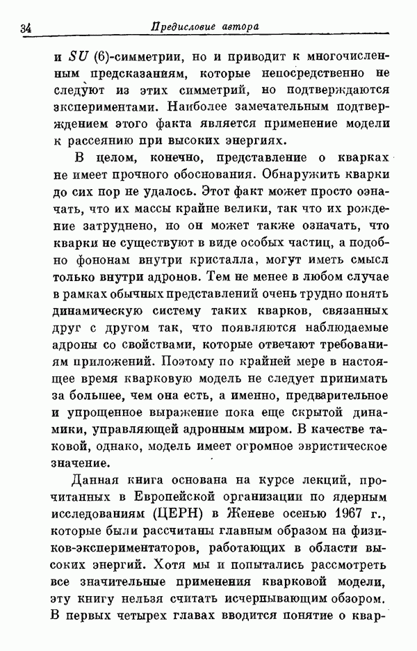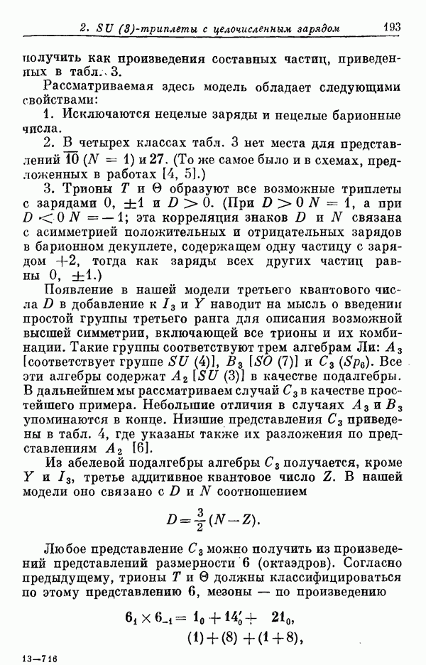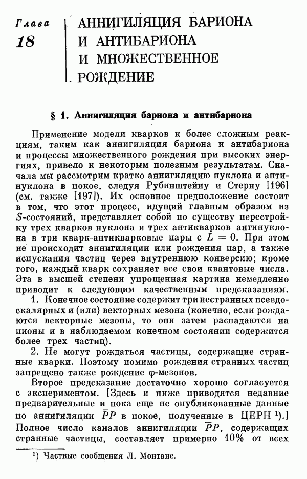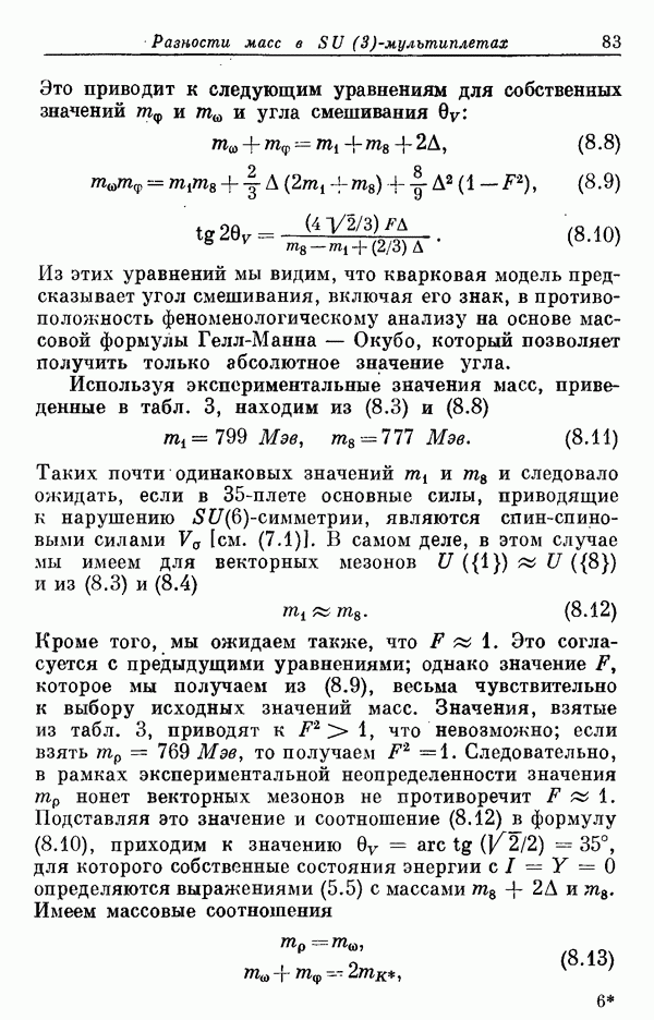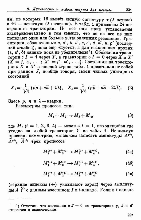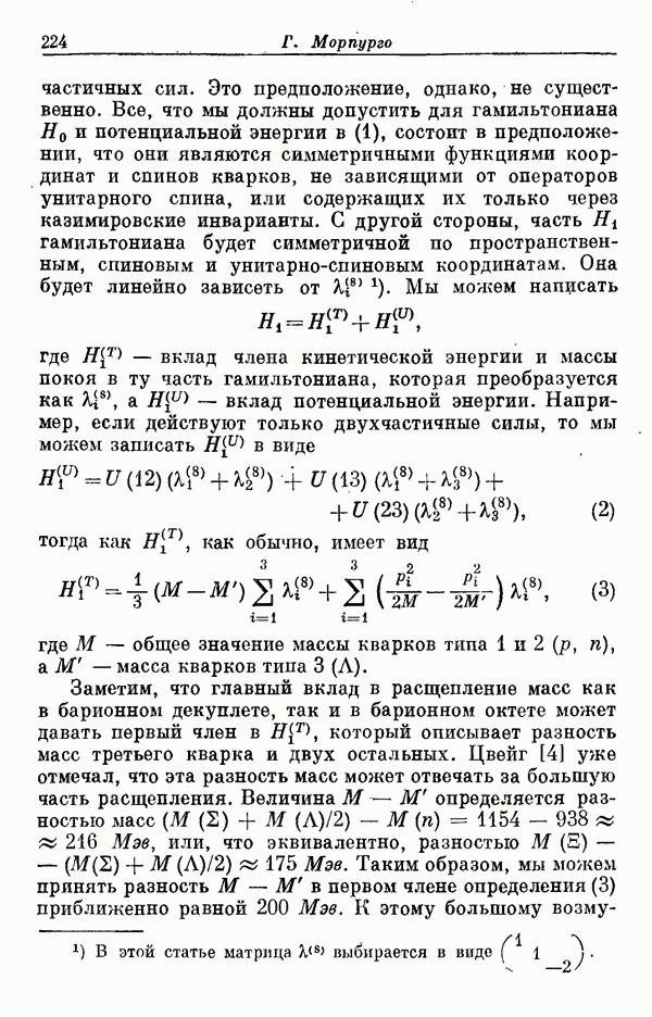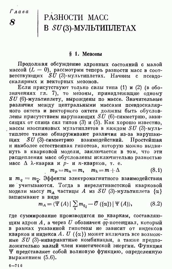 За последние несколько лет было установлено огромное многообразие резонансных состояний как в системе мезонов, так и в мезон-барионных системах. Мы теперь изучаем подробности спектроскопии адронных систем, т. е. состояний элементарных частиц, которые образуются в результате существования сильных взаимодействий, по меньшей мере столь же сильных, как взаимодействия в ядерной физике. В большинстве своем эти адронные состояния нестабильны относительно распада на более легкие ранее установленные адроны — полустабильные псевдоскалярные мезоны и барионы. Было открыто, что большая часть этого многообразия наблюдаемых адронных состояний обусловлена появлением этих состояний в виде унитарных мультиплетов, т. е. групп состояний с одним и тем же значением спина и четности, но с квантовыми числами изоспина I и гиперзаряда Y, определяемыми типичными унитарными схемами. Такой результат показывает, что хорошим первым приближением является приближение, в котором сильные взаимодействия, приводящие к указанному существованию адронных состояний, удовлетворяют -симметрии. Однако даже в этом случае еще существует большое многообразие унитарных мультиплетов, известных для адронных состояний; известны по крайней мере десять барионных мультиплетов и приблизительно столько же мезонных мультиплетов. По аналогии с имеющимся опытом спектроскопии в случаях атомов, молекул и ядер (каждый из которых изучался в свою эпоху развития науки о дискретных состояниях материи) не представляется неестественным предположение о существовании некоторой субструктуры, лежащей в основе наблюдавшихся мезонных и барионных состояний. Это является наиболее подходящим объяснением изучаемого сейчас огромного многообразия наблюдавшихся адронных состояний.