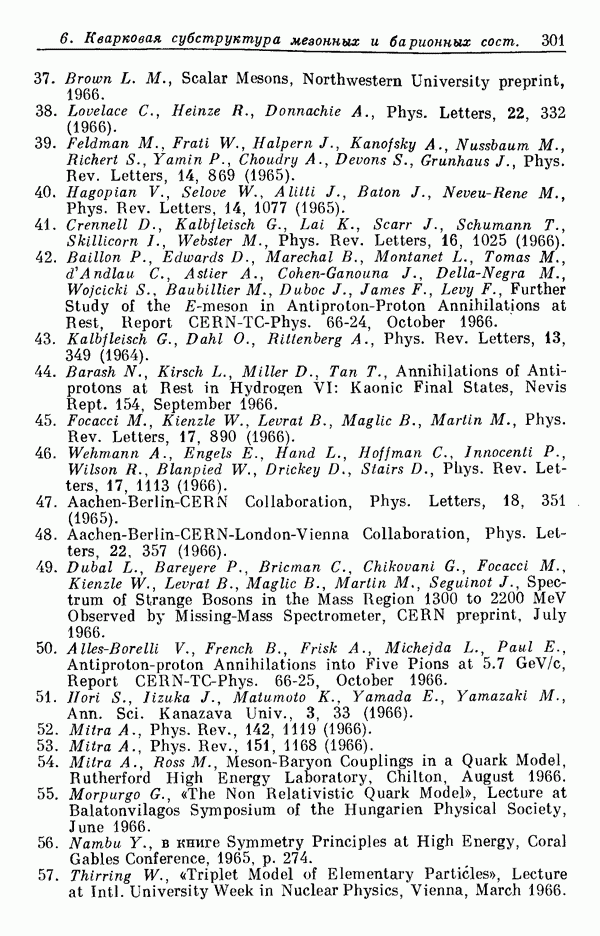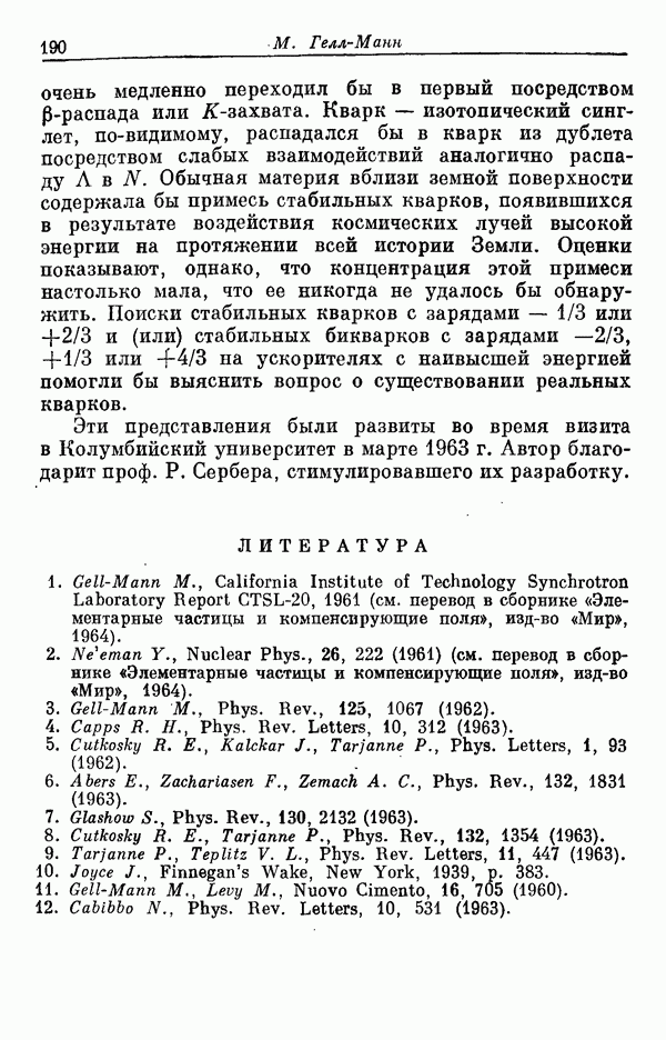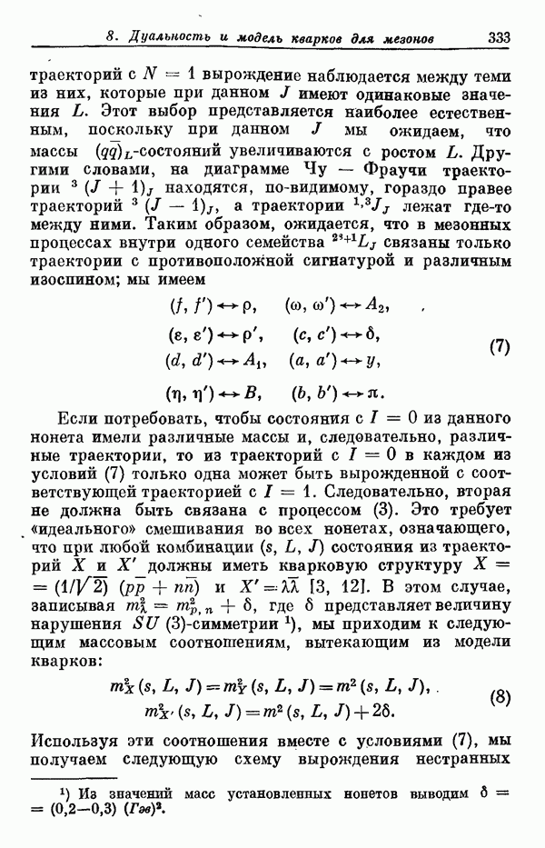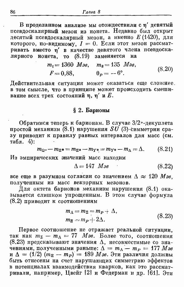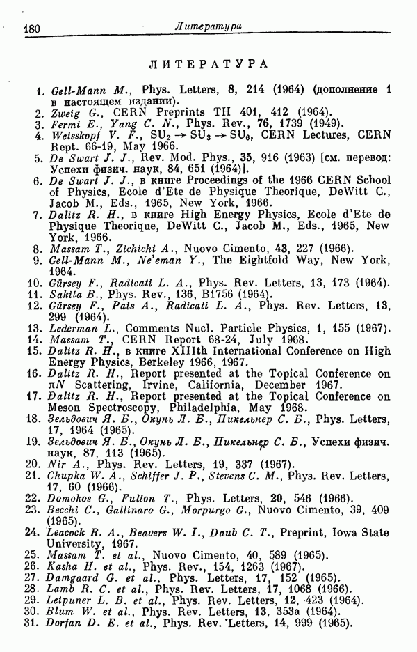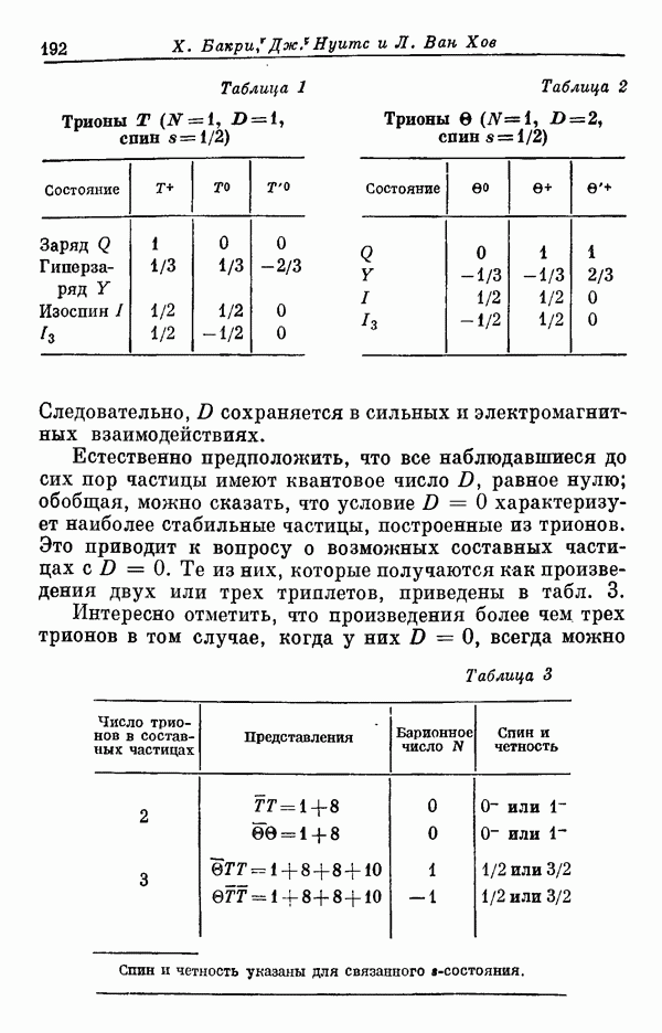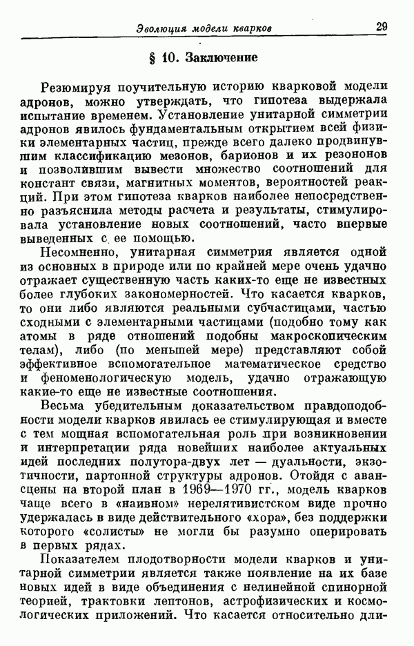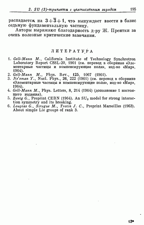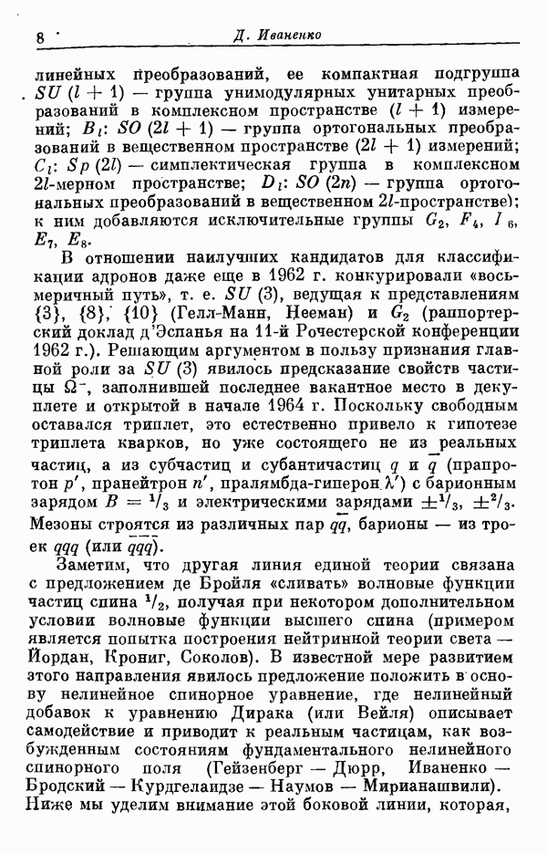 За последние несколько лет было установлено огромное многообразие резонансных состояний как в системе мезонов, так и в мезон-барионных системах. Мы теперь изучаем подробности спектроскопии адронных систем, т. е. состояний элементарных частиц, которые образуются в результате существования сильных взаимодействий, по меньшей мере столь же сильных, как взаимодействия в ядерной физике. В большинстве своем эти адронные состояния нестабильны относительно распада на более легкие ранее установленные адроны — полустабильные псевдоскалярные мезоны и барионы. Было открыто, что большая часть этого многообразия наблюдаемых адронных состояний обусловлена появлением этих состояний в виде унитарных мультиплетов, т. е. групп состояний с одним и тем же значением спина и четности, но с квантовыми числами изоспина I и гиперзаряда Y, определяемыми типичными унитарными схемами. Такой результат показывает, что хорошим первым приближением является приближение, в котором сильные взаимодействия, приводящие к указанному существованию адронных состояний, удовлетворяют -симметрии. Однако даже в этом случае еще существует большое многообразие унитарных мультиплетов, известных для адронных состояний; известны по крайней мере десять барионных мультиплетов и приблизительно столько же мезонных мультиплетов. По аналогии с имеющимся опытом спектроскопии в случаях атомов, молекул и ядер (каждый из которых изучался в свою эпоху развития науки о дискретных состояниях материи) не представляется неестественным предположение о существовании некоторой субструктуры, лежащей в основе наблюдавшихся мезонных и барионных состояний. Это является наиболее подходящим объяснением изучаемого сейчас огромного многообразия наблюдавшихся адронных состояний.