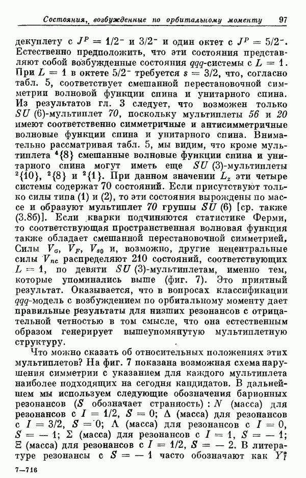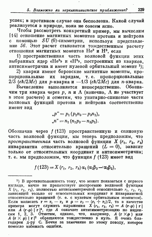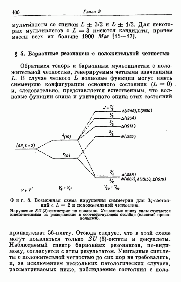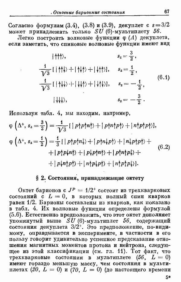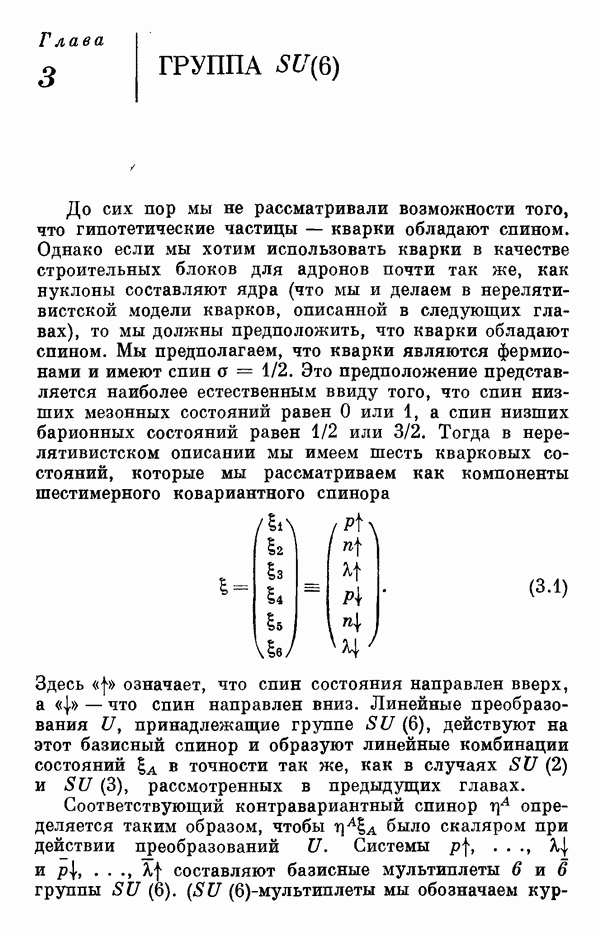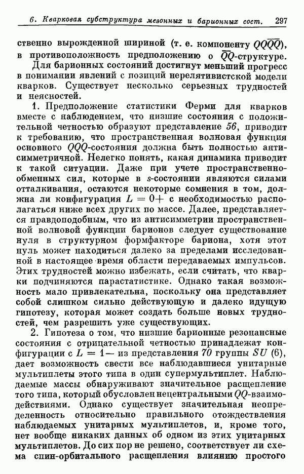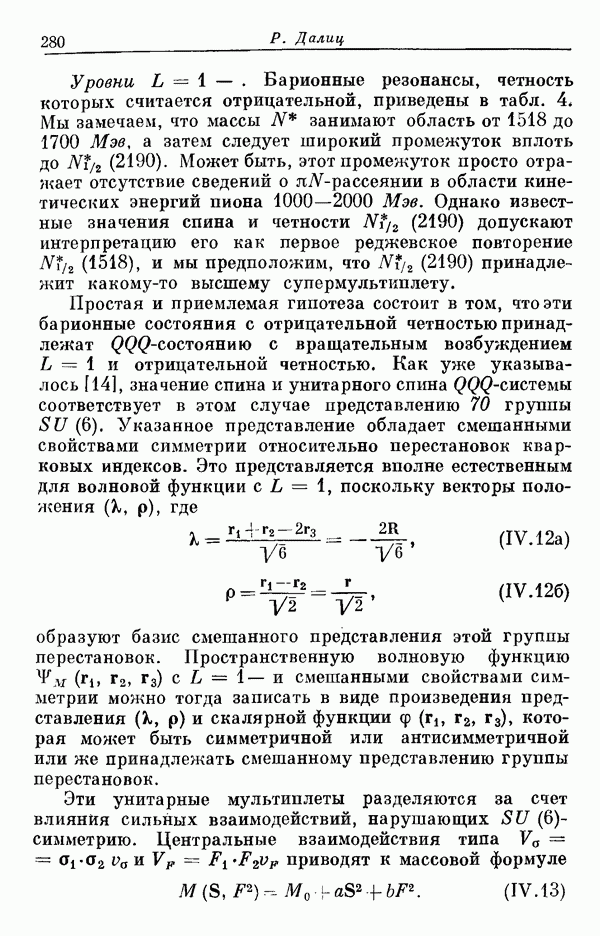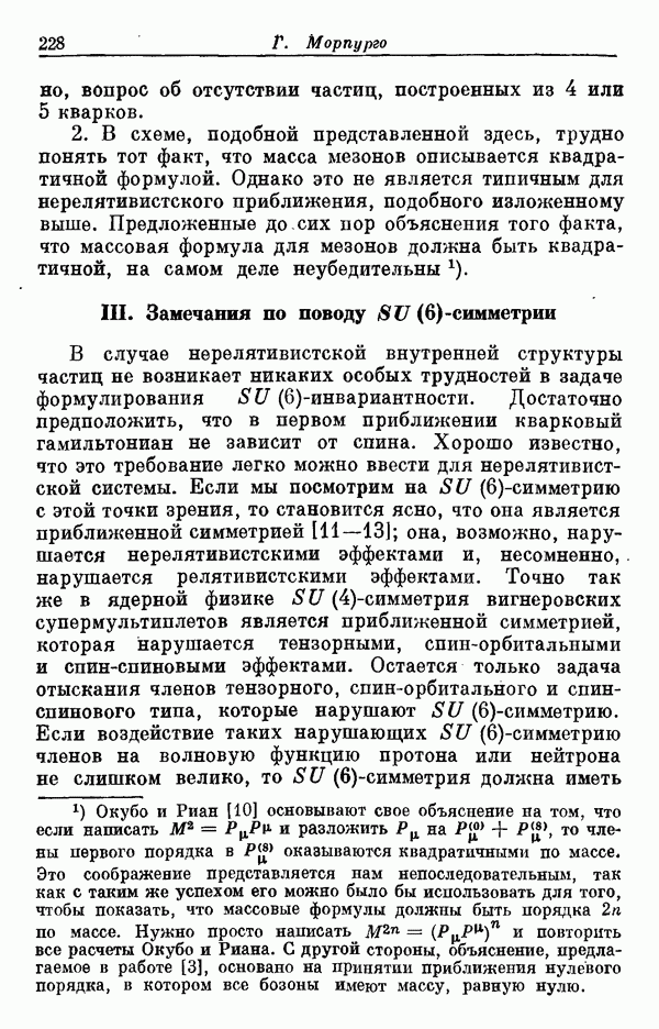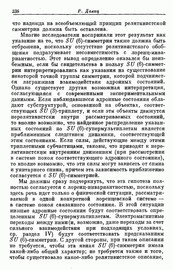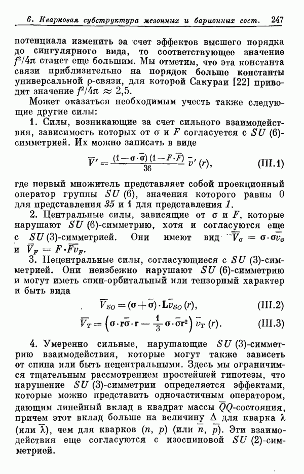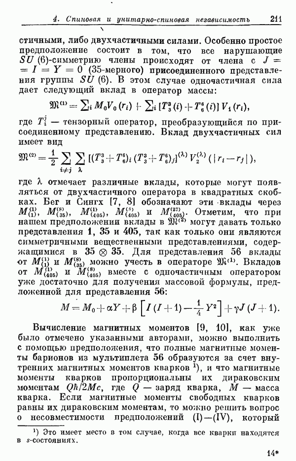 Мы должны сразу подчеркнуть, что эта гипотеза полностью согласуется с лоренц-инвариантностью, поскольку здесь речь идет только о физической ситуации, рассматриваемой в одной конкретной лоренцевской системе — в системе покоя связанного состояния. В этой ситуации низшие адронные состояния будут соответствовать определенным -супермультиплетам. Электромагнитные переходы между ними (и, возможно, даже переходы за счет сильного взаимодействия при подходящих условиях, раздел IV) будут соответствовать предсказаниям -симметрии. С другой стороны, при таком описании не требуется, чтобы эта явная -симметрия имела какой-либо общий характер; не требуется также и того, чтобы существовало какое-либо релятивистское описание,