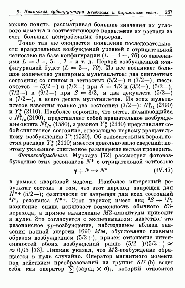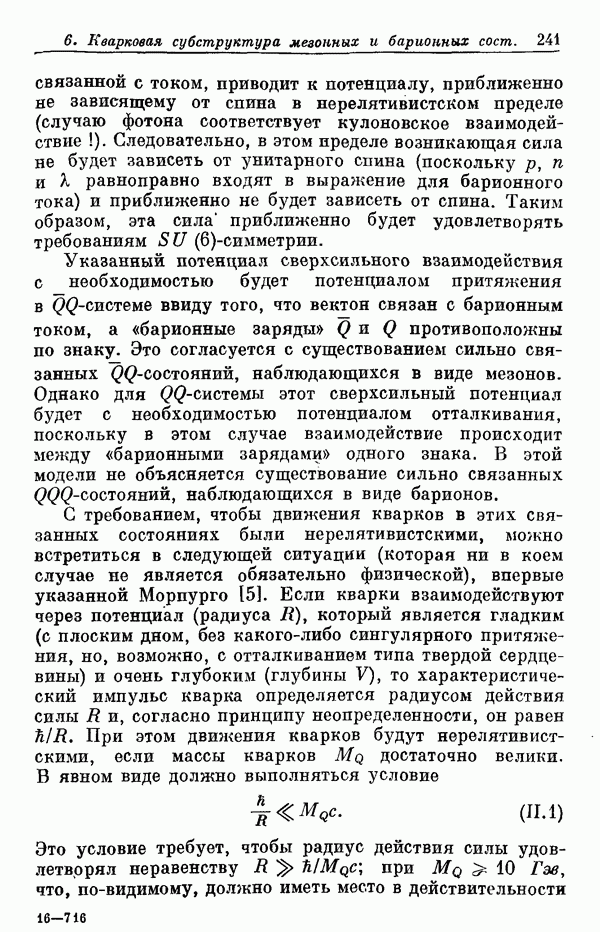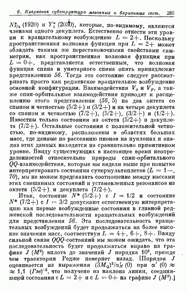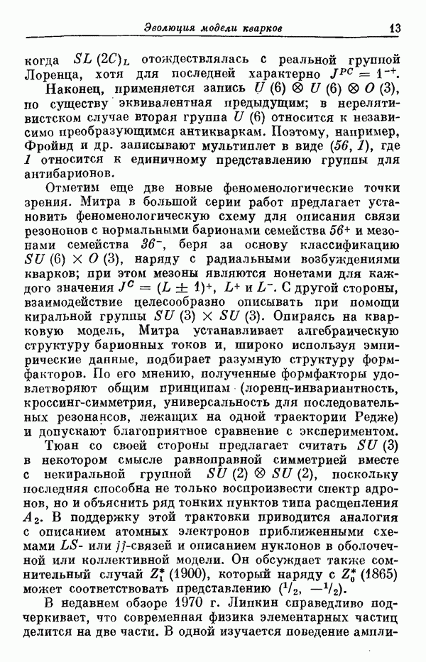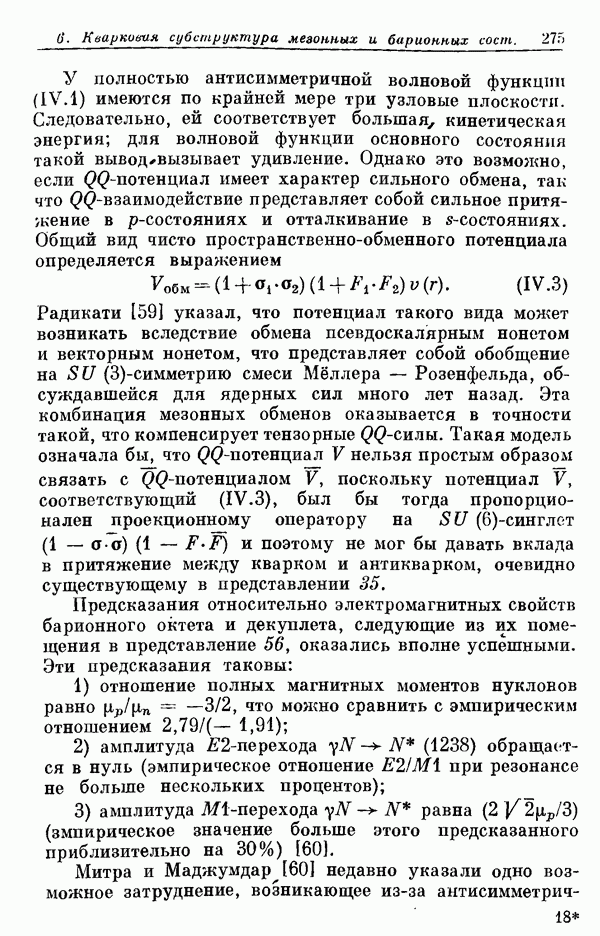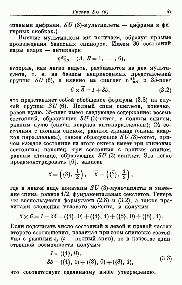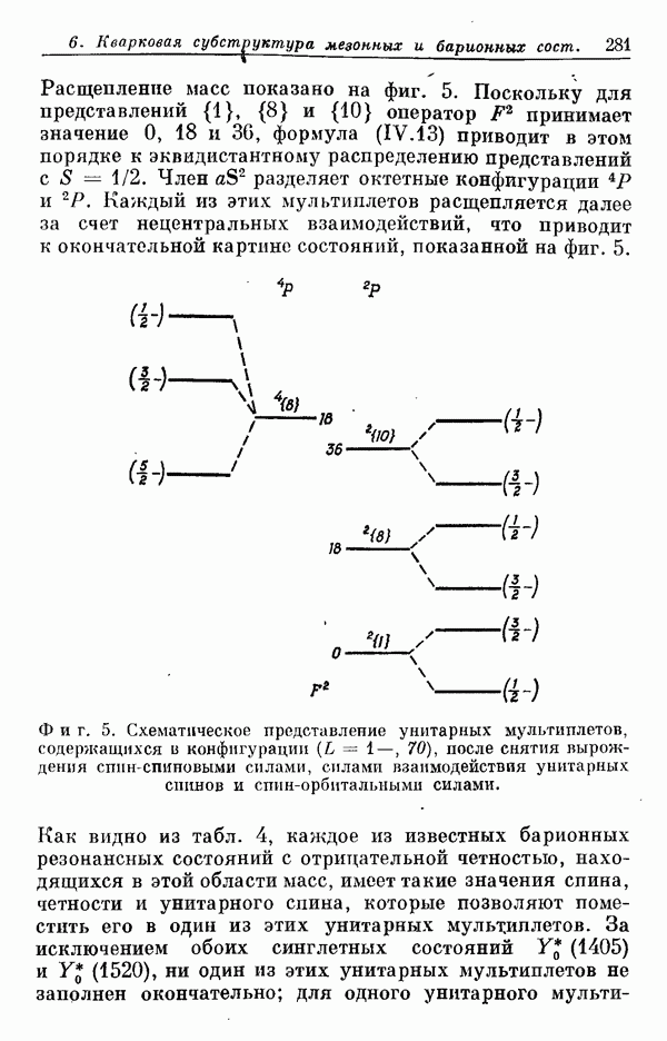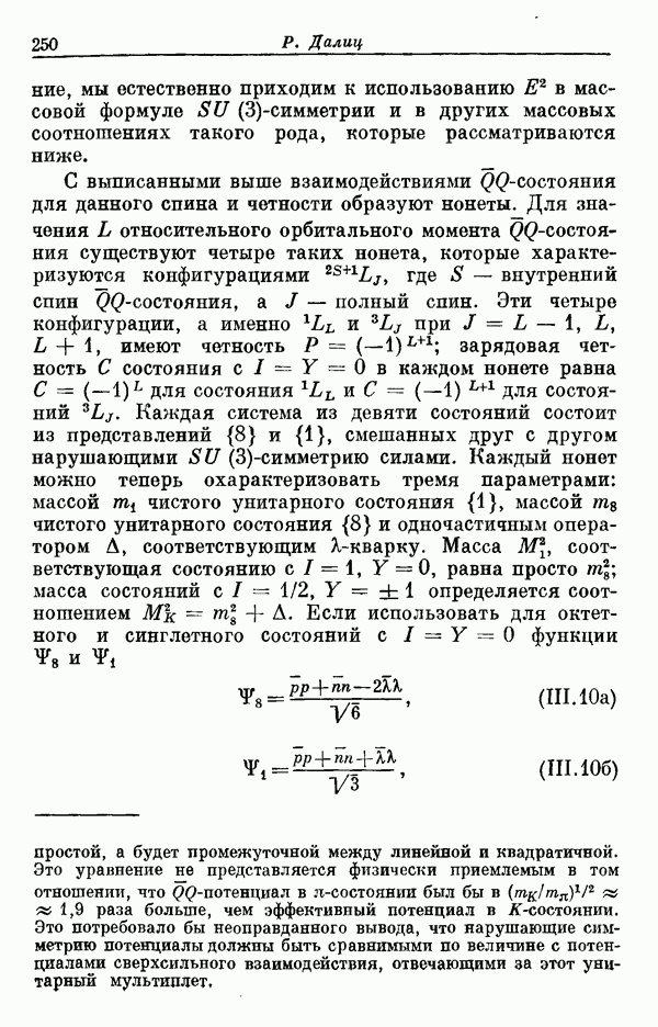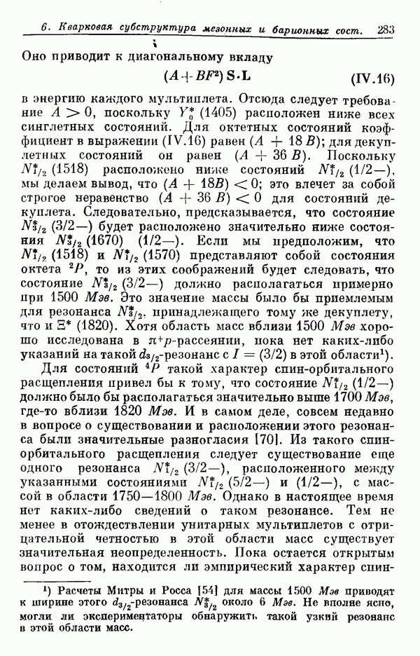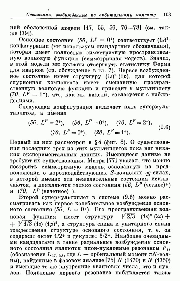 Мы должны сразу подчеркнуть, что эта гипотеза полностью согласуется с лоренц-инвариантностью, поскольку здесь речь идет только о физической ситуации, рассматриваемой в одной конкретной лоренцевской системе — в системе покоя связанного состояния. В этой ситуации низшие адронные состояния будут соответствовать определенным -супермультиплетам. Электромагнитные переходы между ними (и, возможно, даже переходы за счет сильного взаимодействия при подходящих условиях, раздел IV) будут соответствовать предсказаниям -симметрии. С другой стороны, при таком описании не требуется, чтобы эта явная -симметрия имела какой-либо общий характер; не требуется также и того, чтобы существовало какое-либо релятивистское описание,