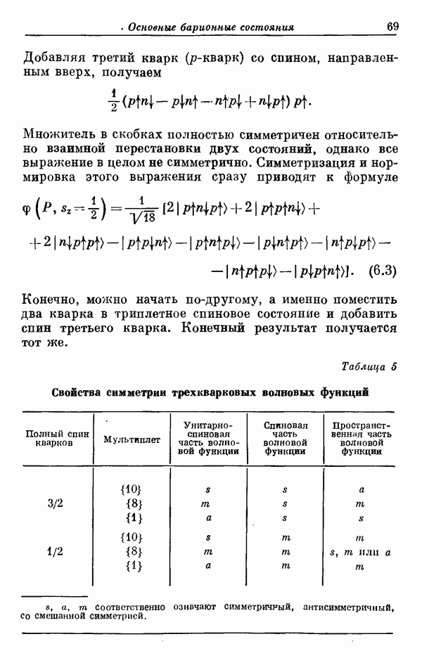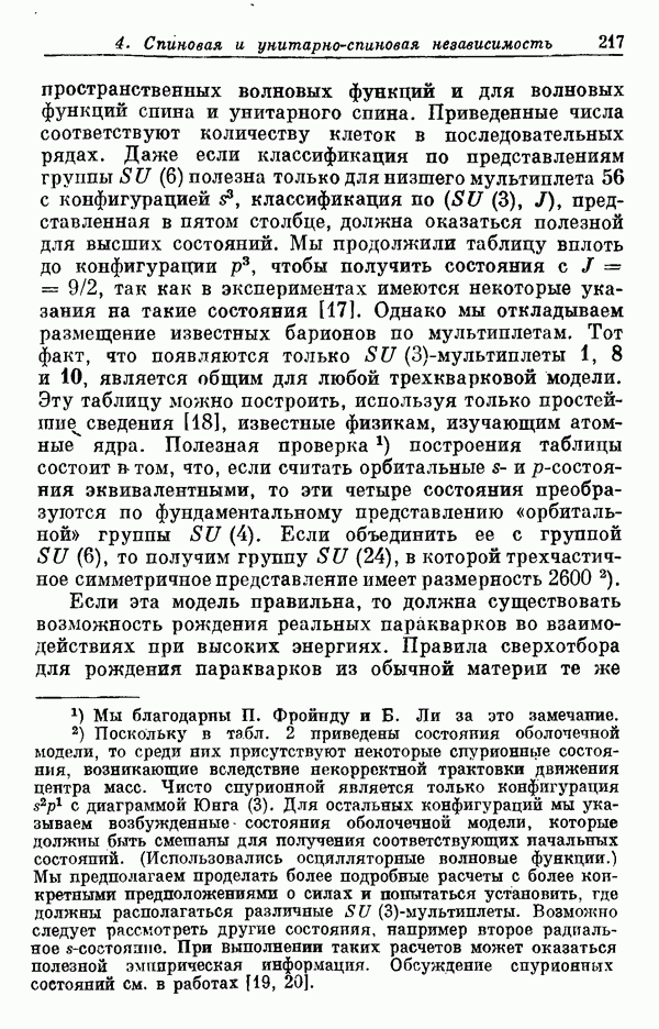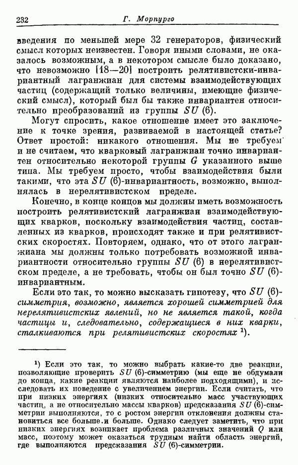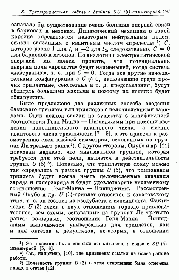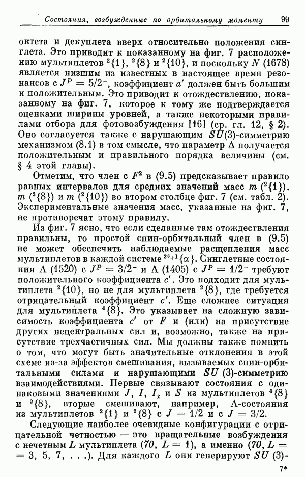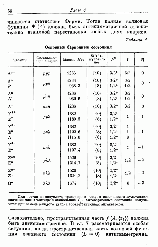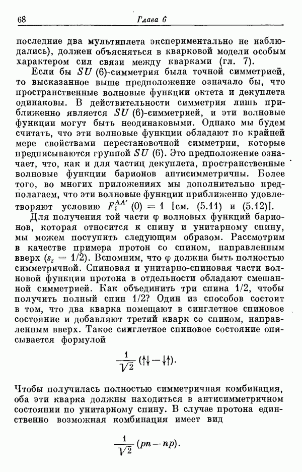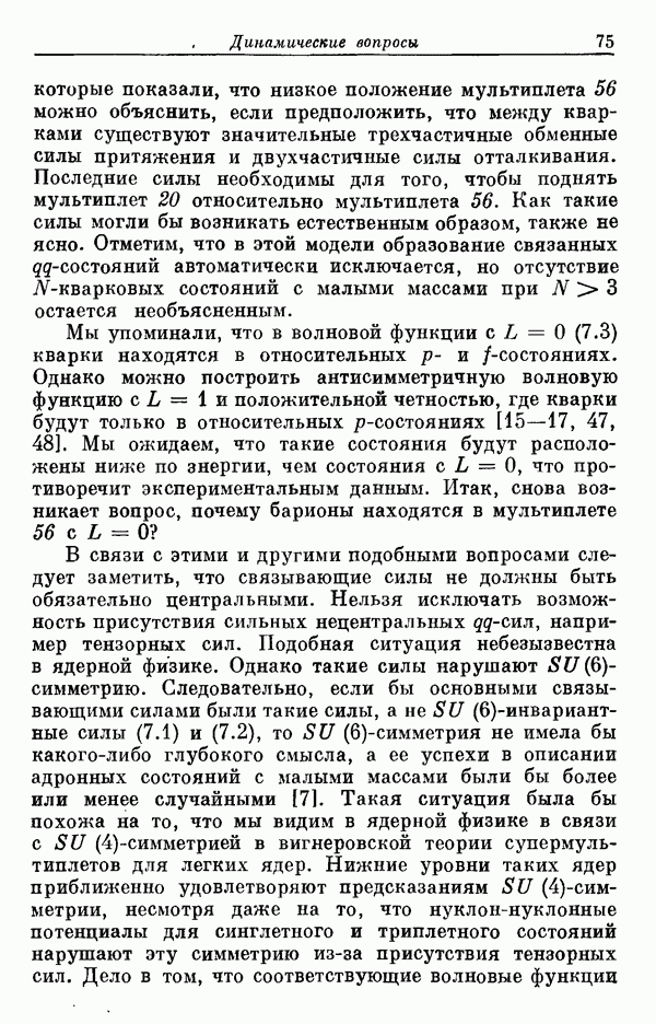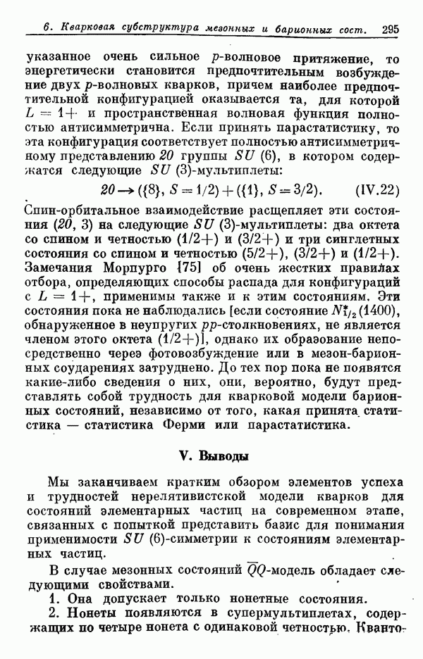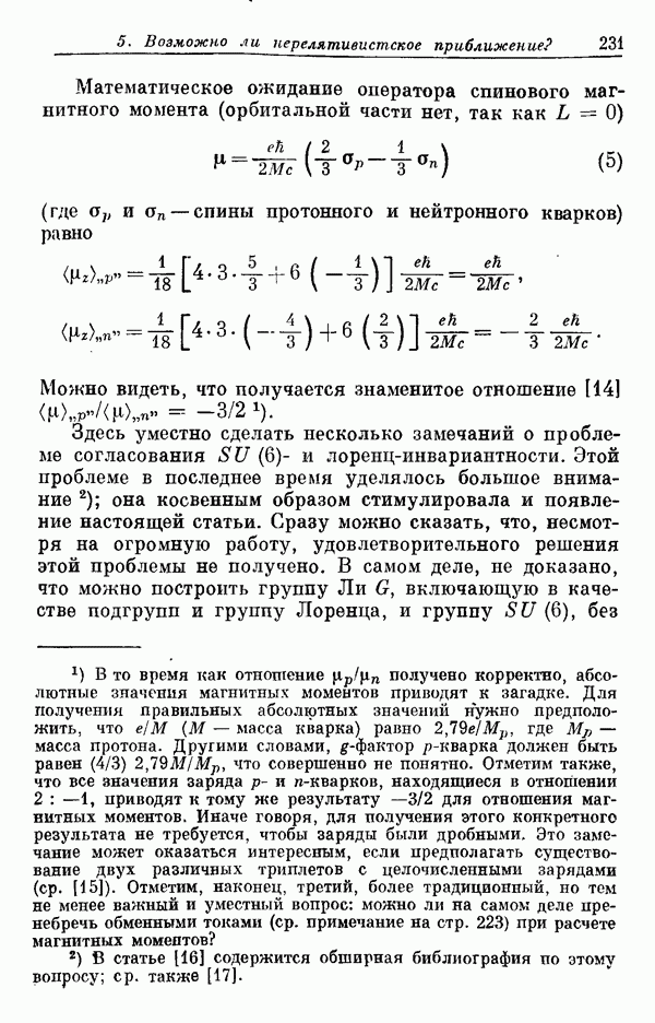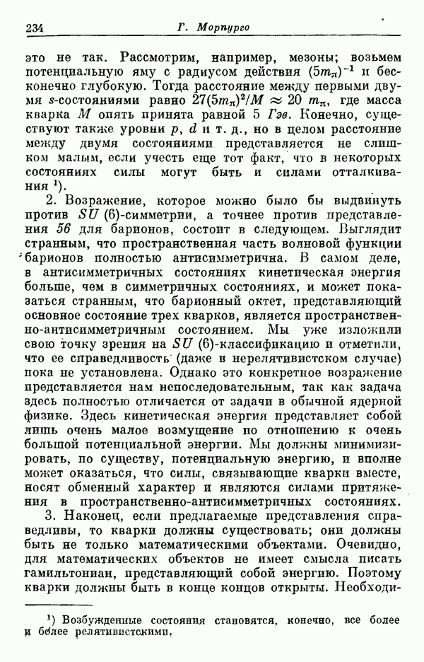 Мы должны сразу подчеркнуть, что эта гипотеза полностью согласуется с лоренц-инвариантностью, поскольку здесь речь идет только о физической ситуации, рассматриваемой в одной конкретной лоренцевской системе — в системе покоя связанного состояния. В этой ситуации низшие адронные состояния будут соответствовать определенным -супермультиплетам. Электромагнитные переходы между ними (и, возможно, даже переходы за счет сильного взаимодействия при подходящих условиях, раздел IV) будут соответствовать предсказаниям -симметрии. С другой стороны, при таком описании не требуется, чтобы эта явная -симметрия имела какой-либо общий характер; не требуется также и того, чтобы существовало какое-либо релятивистское описание,