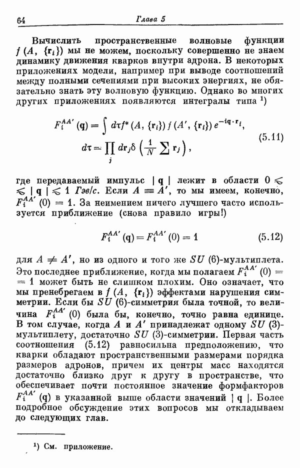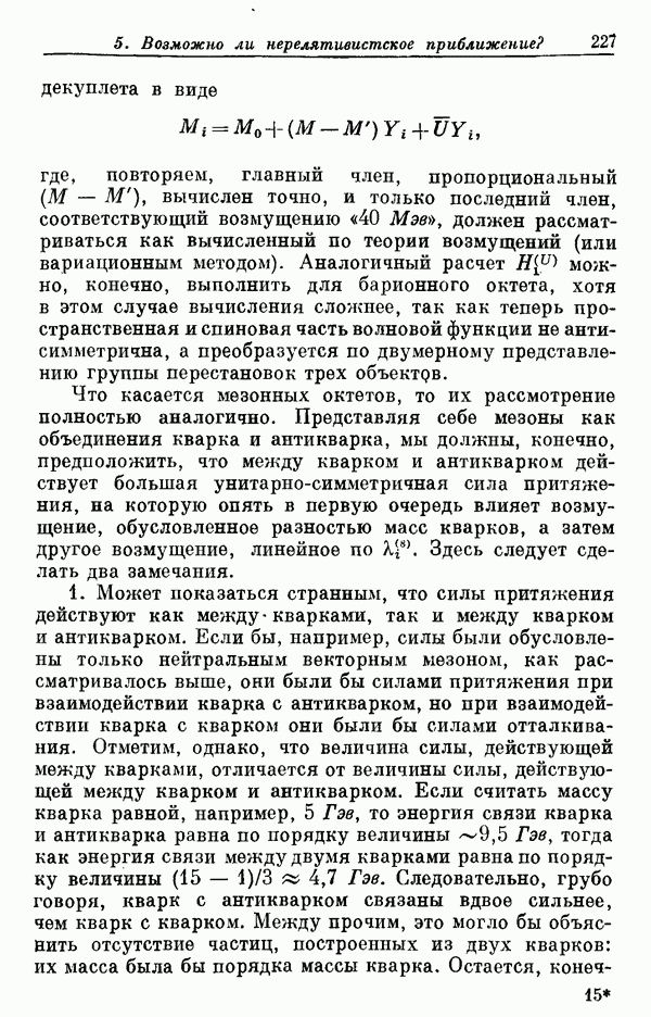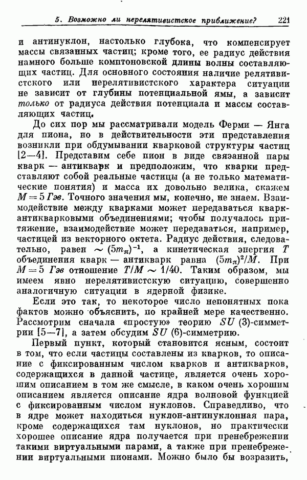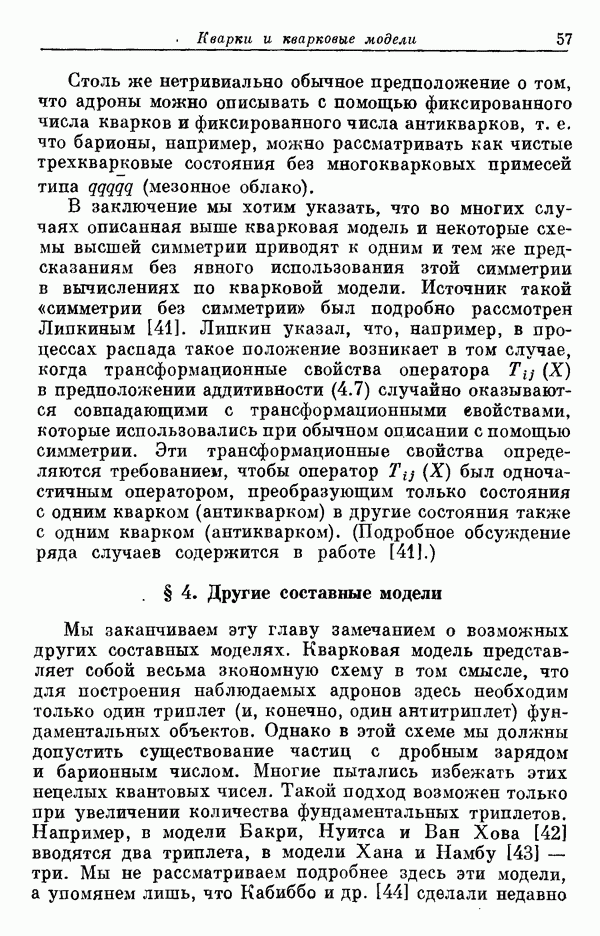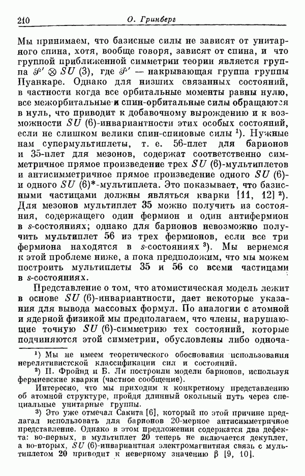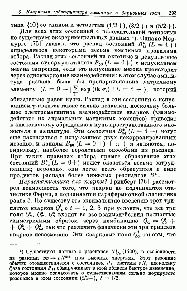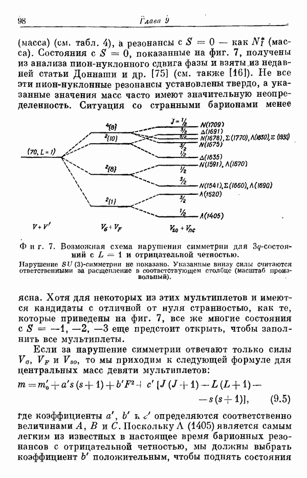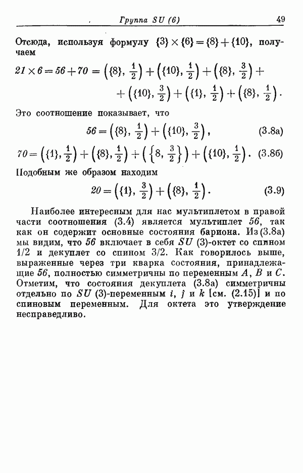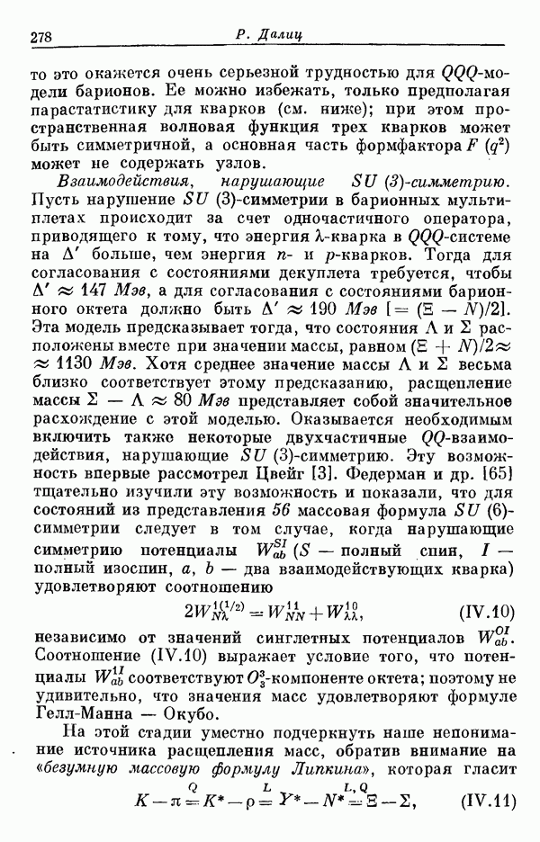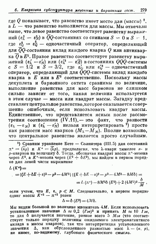 Мы должны сразу подчеркнуть, что эта гипотеза полностью согласуется с лоренц-инвариантностью, поскольку здесь речь идет только о физической ситуации, рассматриваемой в одной конкретной лоренцевской системе — в системе покоя связанного состояния. В этой ситуации низшие адронные состояния будут соответствовать определенным -супермультиплетам. Электромагнитные переходы между ними (и, возможно, даже переходы за счет сильного взаимодействия при подходящих условиях, раздел IV) будут соответствовать предсказаниям -симметрии. С другой стороны, при таком описании не требуется, чтобы эта явная -симметрия имела какой-либо общий характер; не требуется также и того, чтобы существовало какое-либо релятивистское описание,