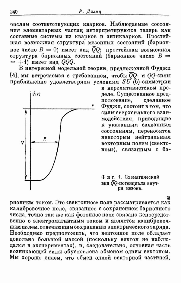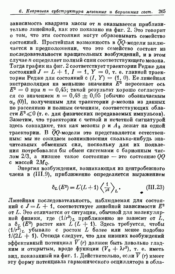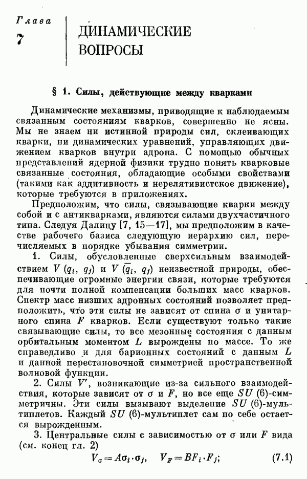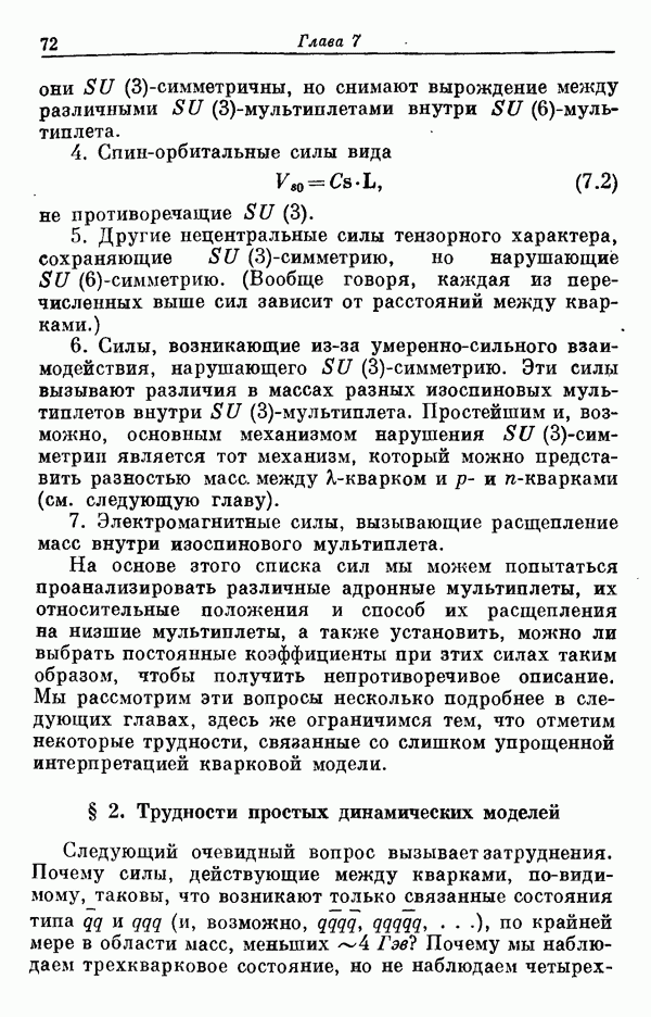 справедливое в общем случае. Например, в случае сильно возбужденных адронных состояний внутренние движения должны быть релятивистскими, а силы, действующие между триплетными субчастицами, должны все более и более отклоняться от их нерелятивистского вида, приводящего к -симметрии. Следовательно, высшие адронные состояния не должны укладываться в схемы, соответствующие -супермультиплетам. Поэтому очевидные успехи -симметрии должны быть в своей основе динамическими, а не теоретико-групповыми. В общем случае тогда должна остаться только группа симметрии Теперь возникает важный вопрос: каким же образом силы, действующие между триплетными субчастицами, приближенно удовлетворяют требованиям -симметрии в нерелятивистском пределе? В настоящее время мы, естественно, не знаем полного ответа на этот вопрос. Однако для иллюстрации мы коротко упомянем ниже одну модель, которая может привести к рассмотренной ситуации, хотя отдельные черты этой модели оказываются несовместимыми с уточненной динамикой, которая требуется для описания наблюдаемых низших состояний.