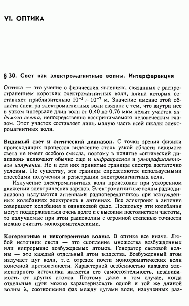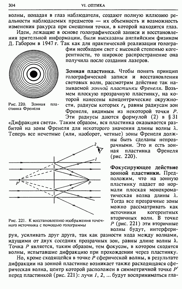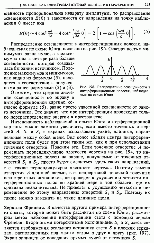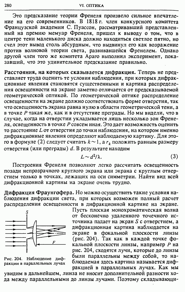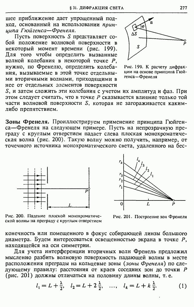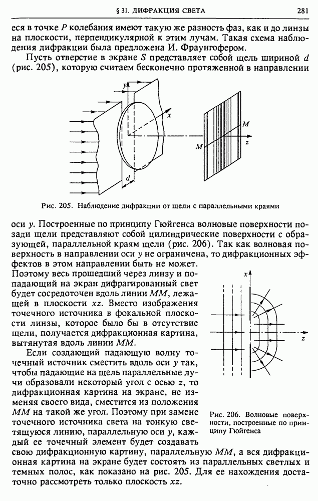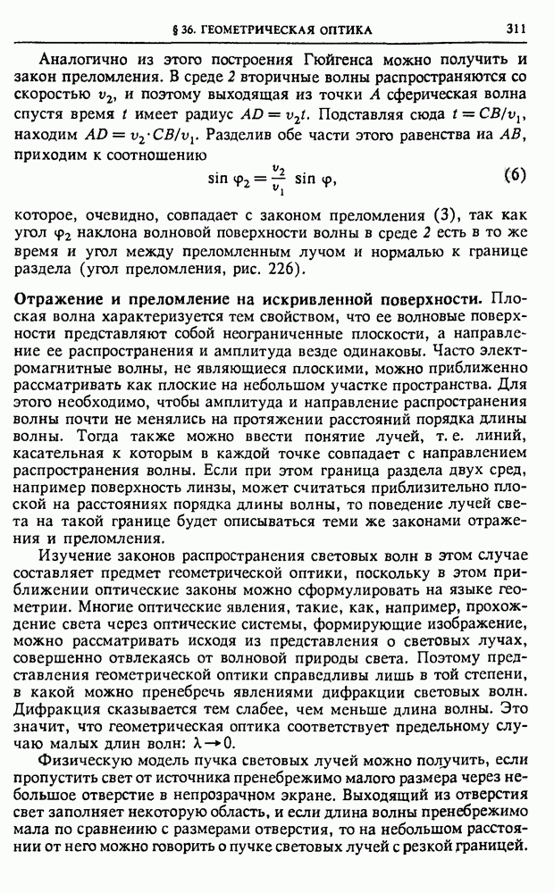 которое, очевидно, совпадает с законом преломления (3), так как угол Отражение и преломление на искривленной поверхности. Плоская волна характеризуется тем свойством, что ее волновые поверхности представляют собой неограниченные плоскости, а направление ее распространения и амплитуда везде одинаковы. Часто электромагнитные волны, не являющиеся плоскими, можно приближенно рассматривать как плоские на небольшом участке пространства. Для этого необходимо, чтобы амплитуда и направление распространения волны почти не менялись на протяжении расстояний порядка длины волны. Тогда также можно ввести понятие лучей, т. е. линий, касательная к которым в каждой точке совпадает с направлением распространения волны. Если при этом граница раздела двух сред, например поверхность линзы, может считаться приблизительно плоской на расстояниях порядка длины волны, то поведение лучей света на такой границе будет описываться теми же законами отражения и преломления. Изучение законов распространения световых волн в этом случае составляет предмет геометрической оптики, поскольку в этом приближении оптические законы можно сформулировать на языке геометрии. Многие оптические явления, такие, как, например, прохождение света через оптические системы, формирующие изображение, можно рассматривать исходя из представления о световых лучах, совершенно отвлекаясь от волновой природы света. Поэтому представления геометрической оптики справедливы лишь в той степени, в какой можно пренебречь явлениями дифракции световых волн. Дифракция сказывается тем слабее, чем меньше длина волны. Это значит, что геометрическая оптика соответствует предельному случаю малых длин волн: Физическую модель пучка световых лучей можно получить, если пропустить свет от источника пренебрежимо малого размера через небольшое отверстие в непрозрачном экране. Выходящий из отверстия свет заполняет некоторую область, и если длина волны пренебрежимо мала по сравнению с размерами отверстия, то на небольшом расстоянии от него можно говорить о пучке световых лучей с резкой границей. Интенсивность отраженного и преломленного света. Законы отражения и преломления позволяют определить только направление соответствующих световых лучей, но ничего не говорят об их интенсивности. Между тем опыт показывает, что соотношение интенсивностей отраженного и преломленного лучей, на которые расщепляется исходный луч на границе раздела, сильно зависит от угла падения. Например, при нормальном падении света на поверхность стекла отражается около 4% энергии падающего светового пучка, а при падении на поверхность воды — только 2 %. Но при скользящем падении поверхности стекла и воды отражают почти все падающее излучение. Благодаря этому мы можем любоваться зеркальными отражениями берегов в спокойной прозрачной воде горных озер.