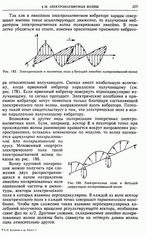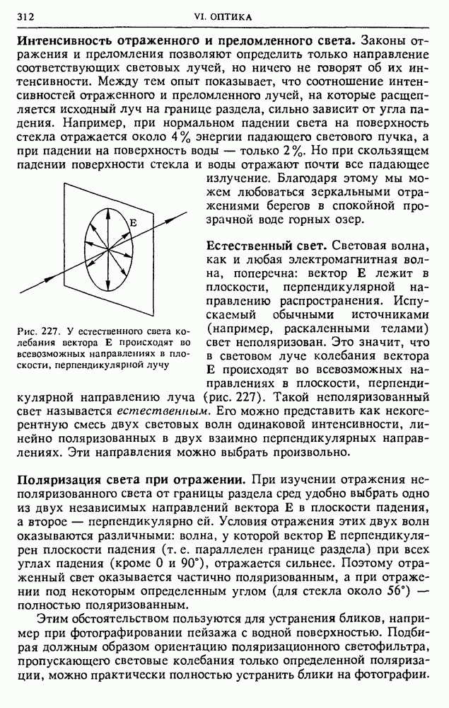 Рис. 227. У естественного спета колебания сектора Е происходят по всевозможных направлениях в плоскости, перпендикулярной лучу Естественный свет. Световая волна, как и любая электромагнитная волна, поперечна: вектор Е лежит в плоскости, перпендикулярной направлению распространения. Испускаемый обычными источниками (например, раскаленными телами) свет неполяризован. Это значит, что в световом луче колебания вектора Е происходят во всевозможных направлениях в плоскости, перпендикулярной направлению луча (рис. 227). Такой неполяризованный свет называется естественным. Его можно представить как некогерентную смесь двух световых волн одинаковой интенсивности, линейно поляризованных в двух взаимно перпендикулярных направлениях. Эти направления можно выбрать произвольно. Поляризация света при отражении. При изучении отражения неполяризованного света от границы раздела сред удобно выбрать одно из двух независимых направлений вектора Е в плоскости падения, а второе — перпендикулярно ей. Условия отражения этих двух волн оказываются различными: волна, у которой вектор Е перпендикулярен плоскости падения (т. е. параллелен границе раздела) при всех углах падения (кроме 0 и 90°), отражается сильнее. Поэтому отраженный свет оказывается частично поляризованным, а при отражении под некоторым определенным углом (для стекла около 56°) — полностью поляризованным. Этим обстоятельством пользуются для устранения бликов, например при фотографировании пейзажа с водной поверхностью. Подбирая должным образом ориентацию поляризационного светофильтра, пропускающего световые колебания только определенной поляризации, можно практически полностью устранить блики на фотографии. Принцип Ферма. Основные законы геометрической оптики — закон прямолинейного распространения света в однородной среде, законы отражения и преломления света на границе раздела двух сред — могут быть получены с помощью принципа Ферма. Согласно этому принципу действительный путь распространения монохроматического луча света есть путь, для прохождения которого свету требуется экстремальное (как правило, минимальное) время по сравнению с любым другим близким к нему мыслимым путем между теми же точками.