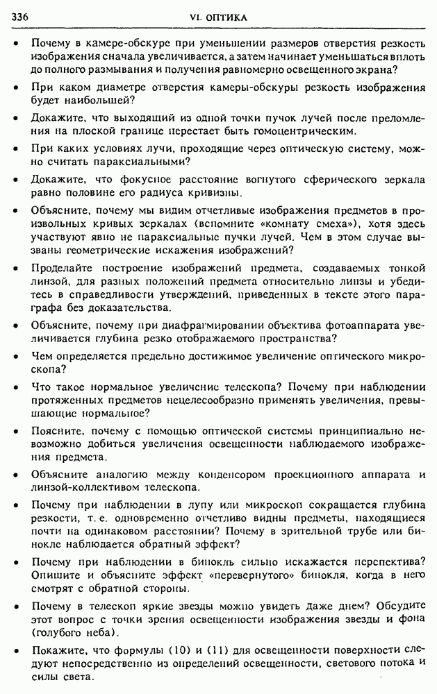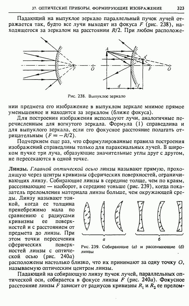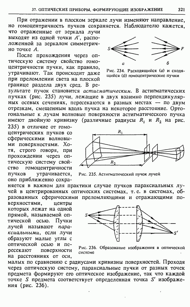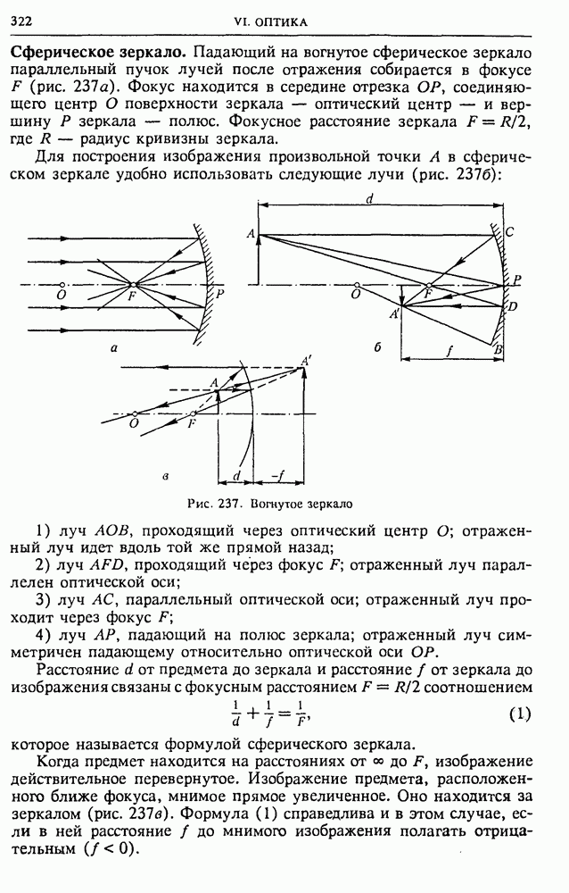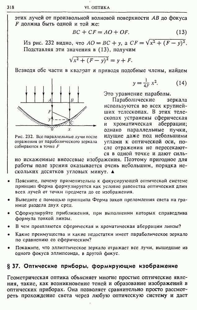 Рис. 232. Все параллельные лучи после отражения от параболического зеркала собираются в точке Параболические зеркала используются во всех крупнейших телескопах. В этих телескопах устранены сферическая и хроматическая аберрации; однако параллельные пучки, идущие даже под небольшими углами к оптической оси, после отражения не пересекаются в одной точке и дают сильно искаженные внеосевые изображения. Поэтому пригодное для работы поле зрения оказывается очень небольшим, порядка нескольких десятков угловых минут, • Поясните, почему применительно к фокусирующей оптической системе принцип Ферма формулируется как условие равенства оптических длин всех лучей от точки предмета до ее изображения. • Выведите с помощью принципа Ферма закон преломления света на границе раздела двух сред. • Сформулируйте приближения, при выполнении которых справедлива формула тонкой линзы. • В чем проявляются сферическая и хроматическая аберрации линзы? • Какие преимущества и какие недостатки имеет параболическое зеркало по сравнению со сферическим? • Покажите, что эллиптическое зеркало отражает все лучи, вышедшие из одного фокуса эллипсоида, в другой фокус.