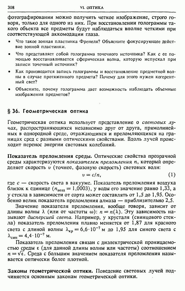 § 36. Геометрическая оптикаГеометрическая оптика использует представление о световых лучах, распространяющихся независимо друг от друга, прямолинейных в однородной среде, отражающихся и преломляющихся на границах сред с разными оптическими свойствами. Вдоль лучей происходит перенос энергии световых колебаний. Показатель преломления среды. Оптические свойства прозрачной среды характеризуются показателем преломления