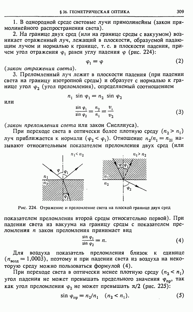 Рис. 224. Отражение и преломление спета на плоской границе двух сред При падении света из вакуума на границу среды с показателем преломления