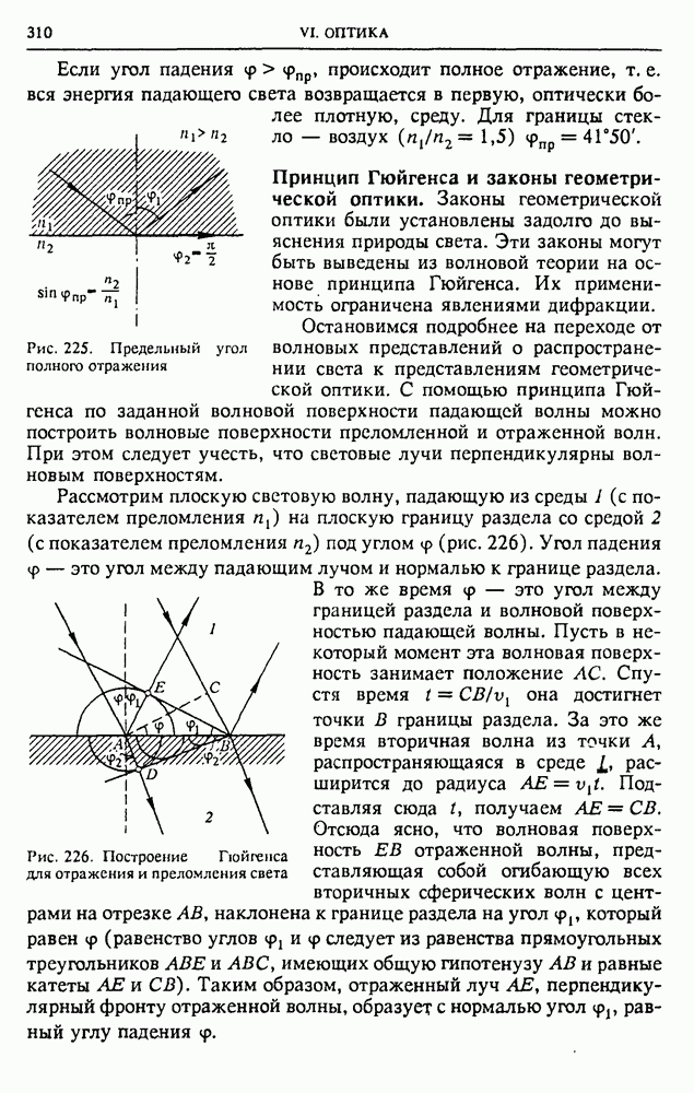 Рис. 225. Предельный угол полного отражения Принцип Гюйгенса и законы геометрической оптики. Законы геометрической оптики были установлены задолго до выяснения природы света. Эти законы могут быть выведены из волновой теории на основе принципа Гюйгенса. Их применимость ограничена явлениями дифракции. Остановимся подробнее на переходе от волновых представлений о распространении света к представлениям геометрической оптики. С помощью принципа Гюйгенса по заданной волновой поверхности падающей волны можно построить волновые поверхности преломленной и отраженной волн. При этом следует учесть, что световые лучи перпендикулярны волновым поверхностям. Рассмотрим плоскую световую волну, падающую из среды 1 (с показателем преломления