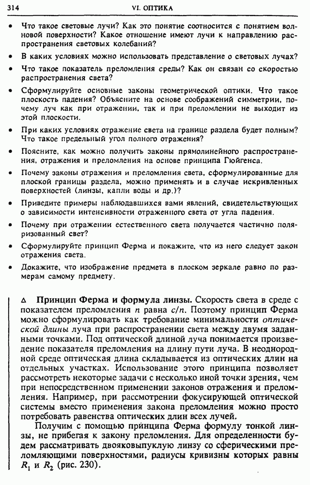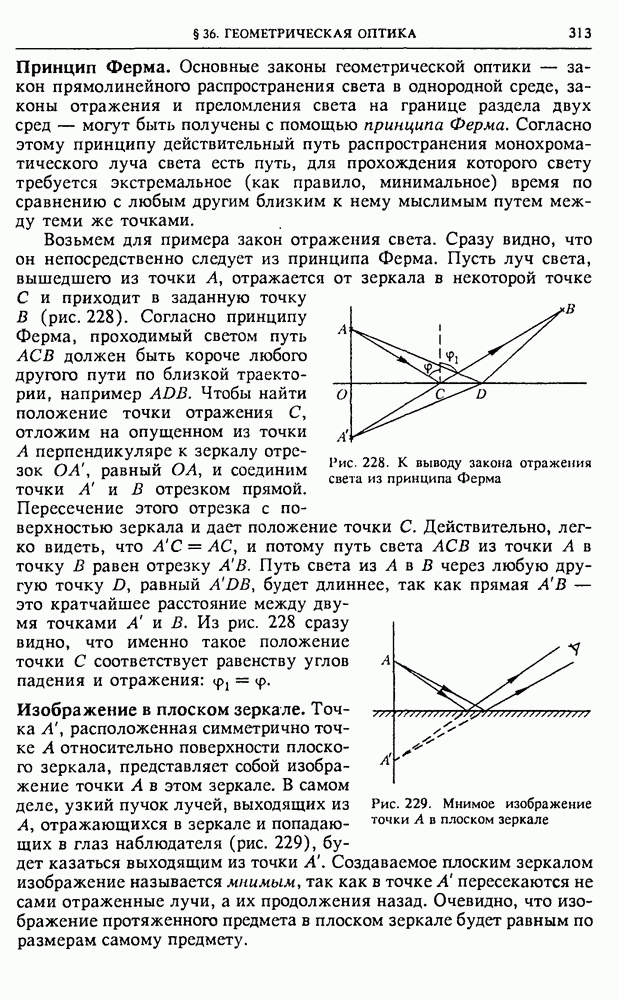 Рис. 229. Мнимое изображение точки А в плоском зеркале Изображение в плоском зеркале. Точка А, расположенная симметрично точке А относительно поверхности плоского зеркала, представляет собой изображение точки А в этом зеркале. В самом деле, узкий пучок лучей, выходящих из А, отражающихся в зеркале и попадающих в глаз наблюдателя (рис. 229), будет казаться выходящим из точки А. Создаваемое плоским зеркалом изображение называется мнимым, так как в точке А пересекаются не сами отраженные лучи, а их продолжения назад. Очевидно, что изображение протяженного предмета в плоском зеркале будет равным по размерам самому предмету. • Что такое световые лучи? Как это понятие соотносится с понятием волновой поверхности? Какое отношение имеют лучи к направлению распространения световых колебаний? • В каких условиях можно использовать представление о световых лучах? • Что такое показатель преломления среды? Как он связан со скоростью распространения света? • Сформулируйте основные законы геометрической оптики. Что такое плоскость падения? Объясните на основе соображений симметрии, почему луч как при отражении, так и при преломлении не выходит из этой плоскости. • При каких условиях отражение света на границе раздела будет полным? Что такое предельный угол полного отражения? • Поясните, как можно получить законы прямолинейного распространения, отражения и преломления на основе принципа Гюйгенса. • Почему законы отражения и преломления света, сформулированные для плоской границы раздела, можно применять и в случае искривленных поверхностей (линзы, капли воды и др.)? • Приведите примеры наблюдавшихся вами явлений, свидетельствующих о зависимости интенсивности отраженного света от угла падения. • Почему при отражении естественного света получается частично поляризованный свет? • Сформулируйте принцип Ферма и покажите, что из него следует закон отражения света. • Докажите, что изображение предмета в плоском зеркале равно по размерам самому предмету. Принцип Ферма и формула линзы. Скорость света в среде с показателем преломления Получим с помощью принципа Ферма формулу тонкой линзы, не прибегая к закону преломления. Для определенности будем рассматривать двояковыпуклую линзу со сферическими преломляющими поверхностями, радиусы кривизны которых равны Хорошо известно, что с помощью собирающей линзы можно получить действительное изображение точки. Пусть Из принципа Ферма следует, что оптические длины всех лучей, выходящих из источника и собирающихся в точке, являющейся его изображением, одинаковы. Рассмотрим два из этих лучей: один, идущий вдоль оптической оси, второй — через край линзы (рис. 230а).