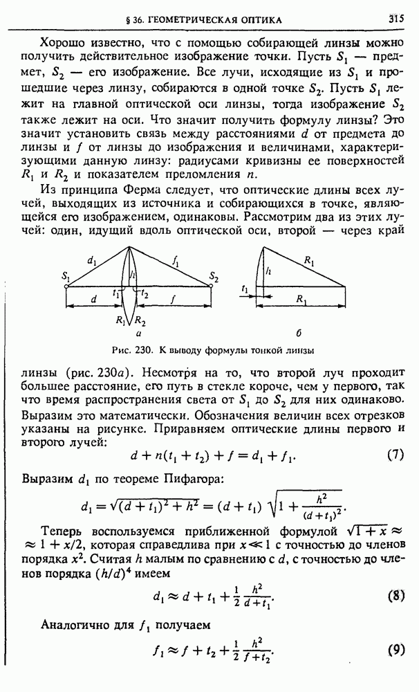Рис. 230. К вьшоду формулы тонкой линзы Несмотря на то, что второй луч проходит большее расстояние, его путь в стекле короче, чем у первого, так что время распространения света